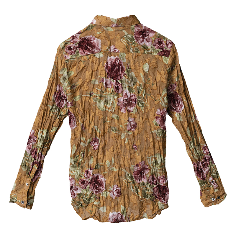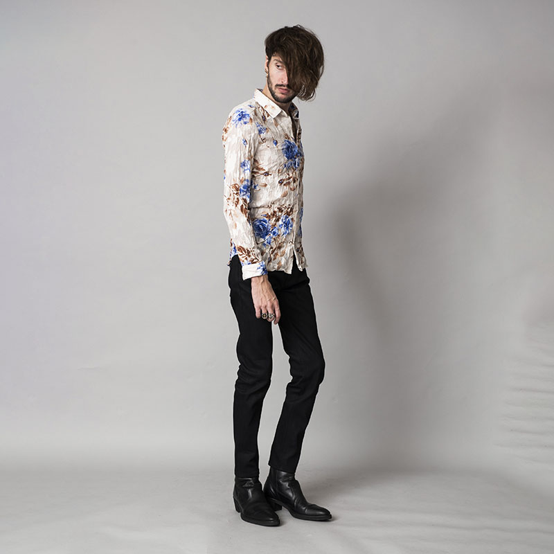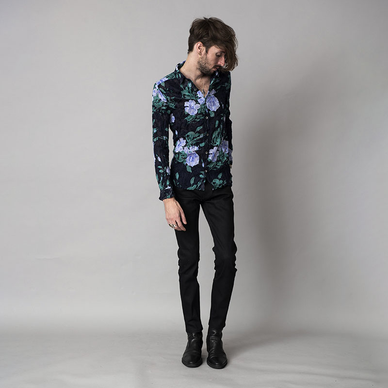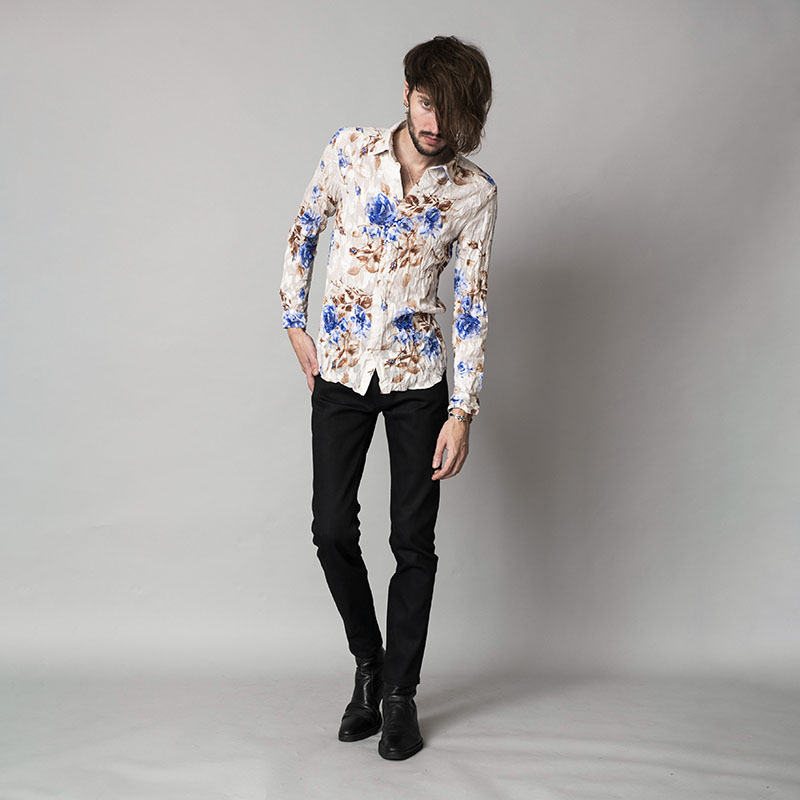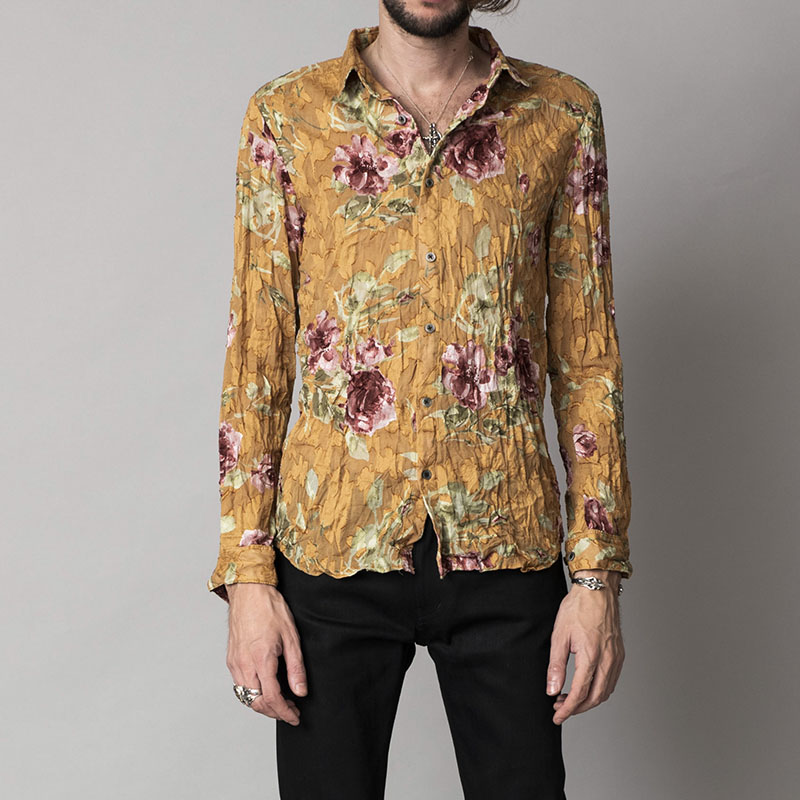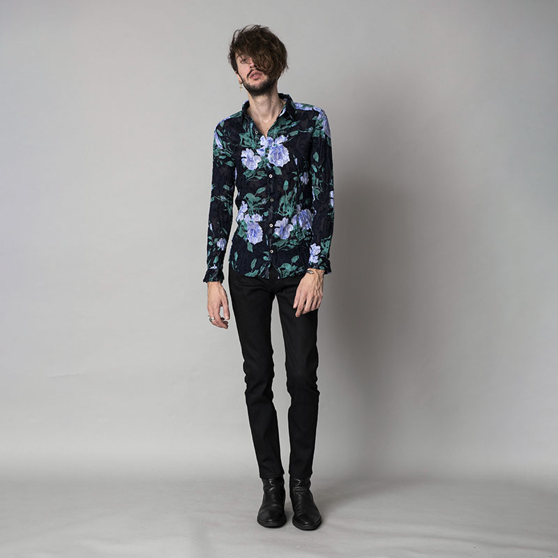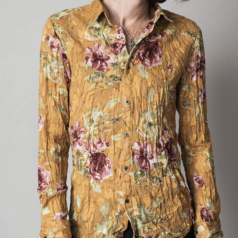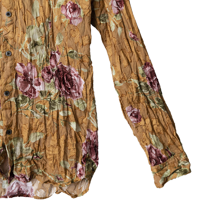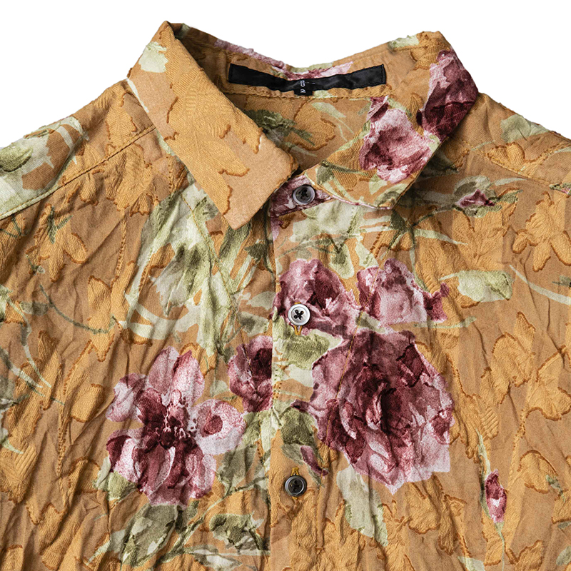 2017S/Sコレクションで好評を博した花柄シャツがマイナーチェンジされ再登場本作は立体的な生地感を作るジャガード織りで花柄を表現した生地の上から更にローズ柄をプリントした趣向を凝らした一枚