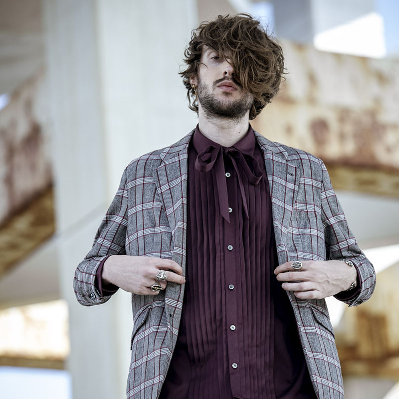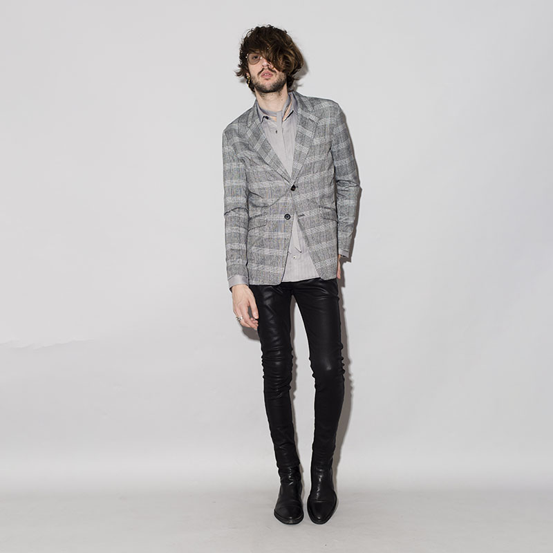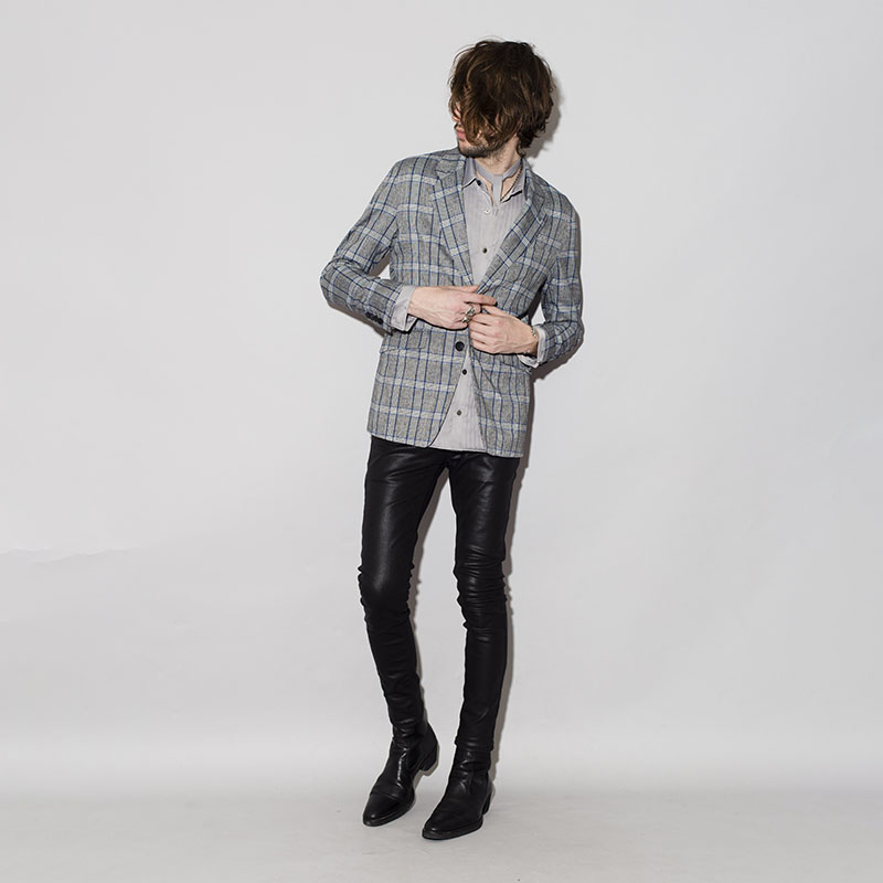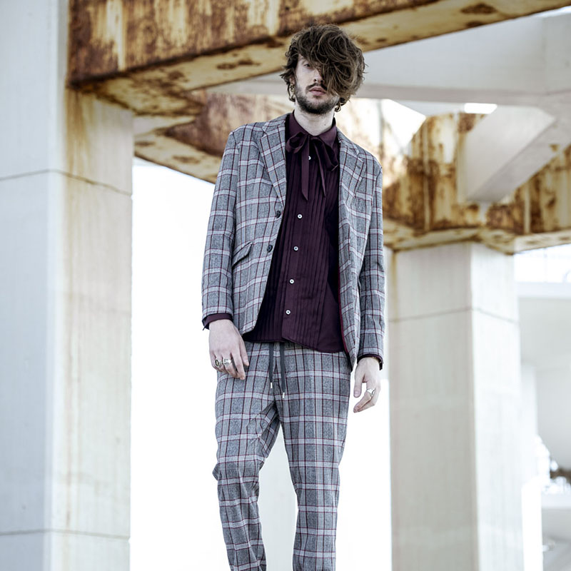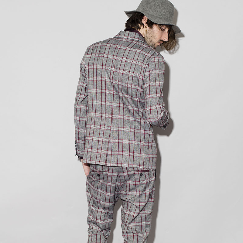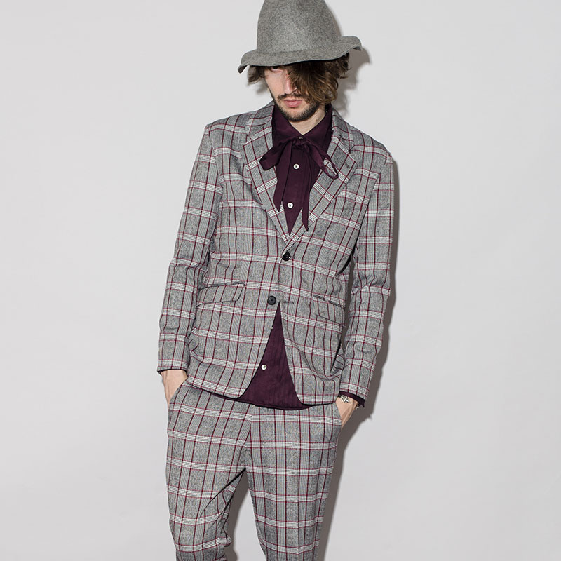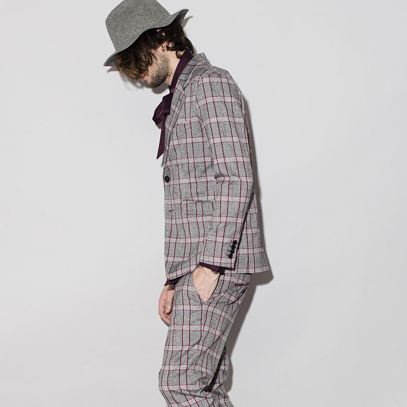 クラシカルな雰囲気を感じさせるチェックノッチドラペルテーラードJKT。同シリーズのグレンチェックノーカーラーBLZ同様に、ベースのカラーごとに異なるカラーの裏地を用い、カットソー、シャツ双方の着合わが可能な汎用性の高さをもつ。