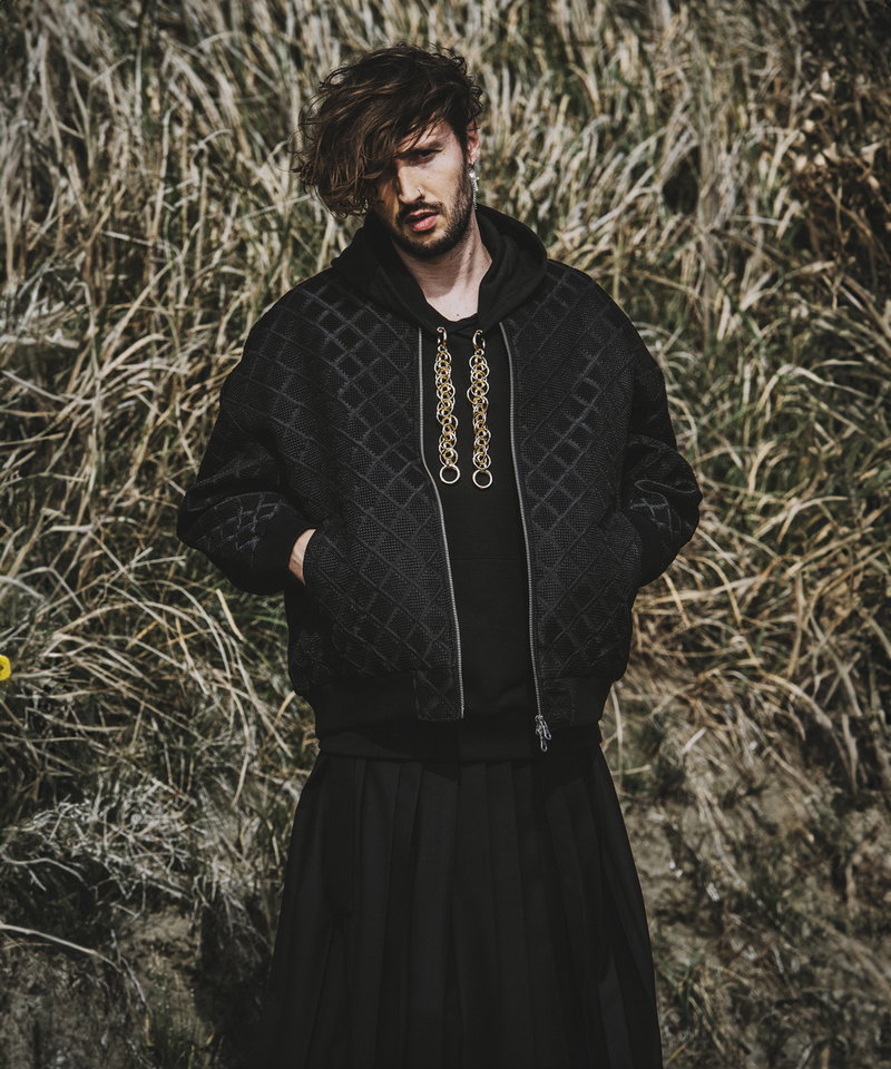 グレンチェックアンクルトラウザースとの組み合わでセットアップスタイルの着用も可能。