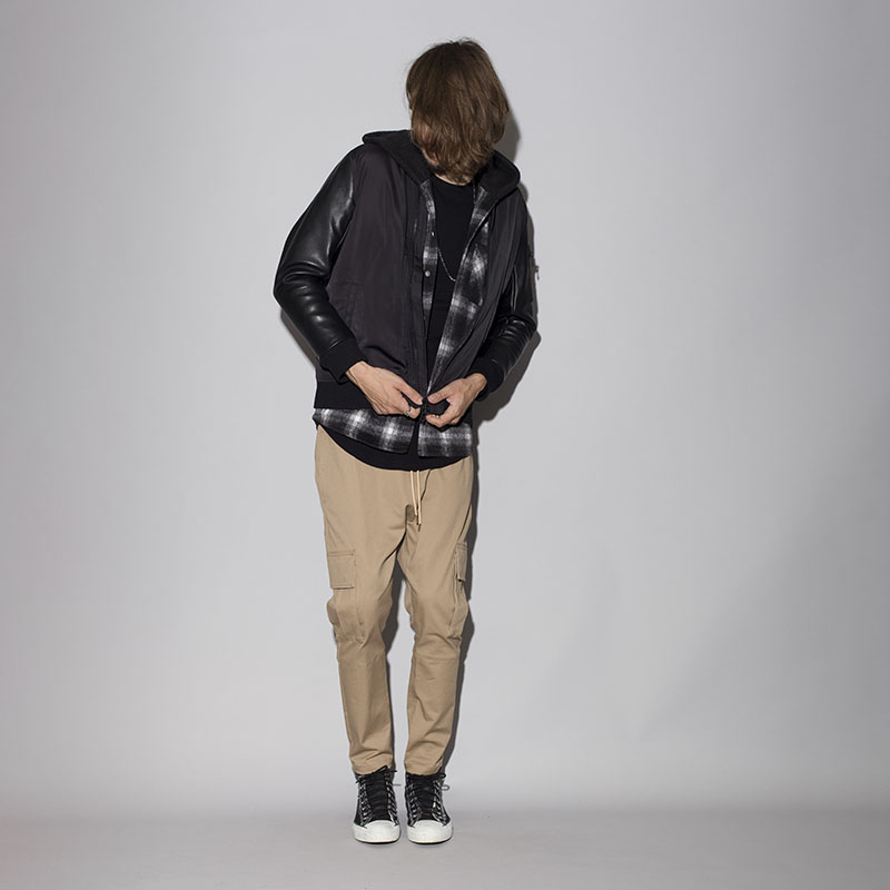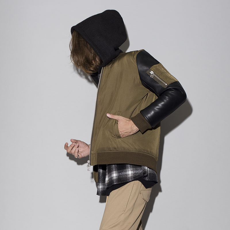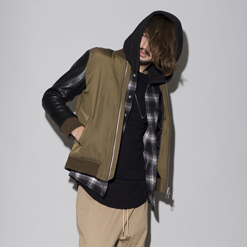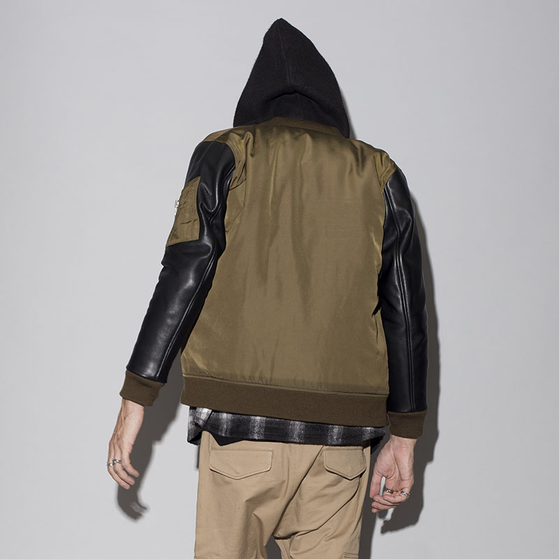 ベーシックに使えるMA-1をベースに袖革を男らしい牛革に切替え、中綿も入れ込んだヘビアウターが完成。