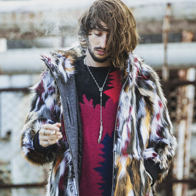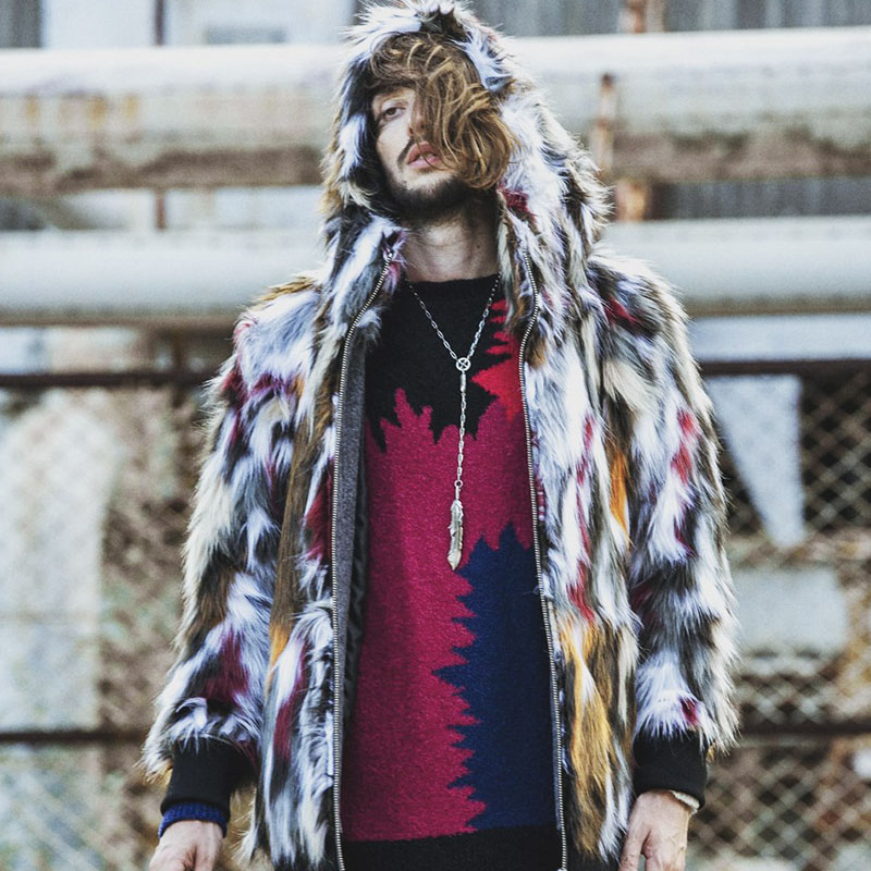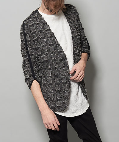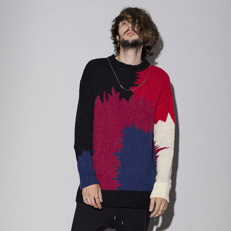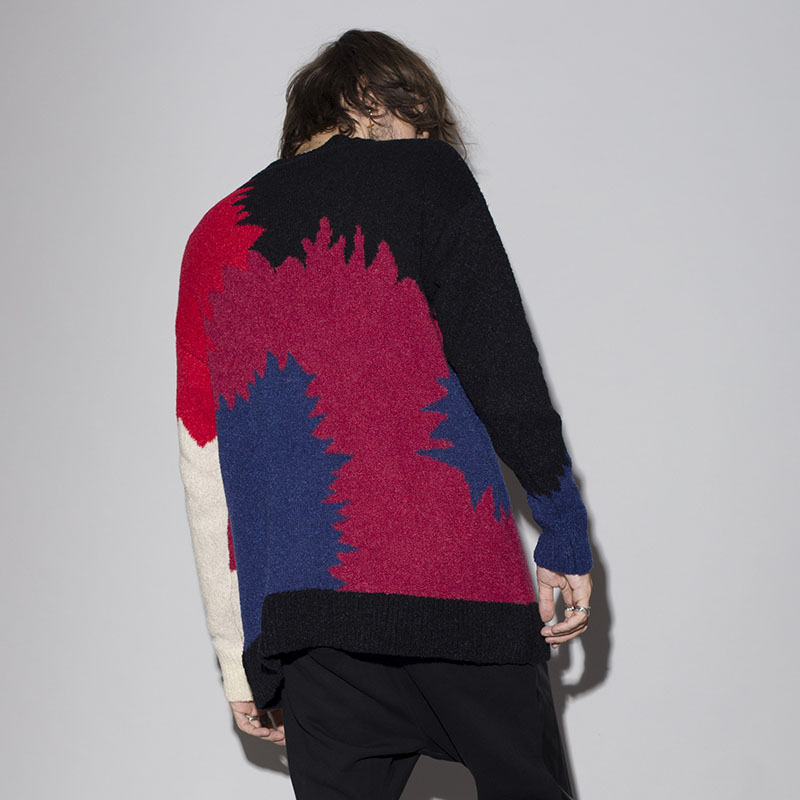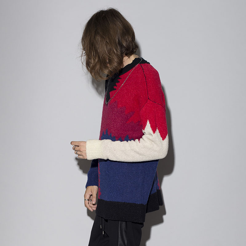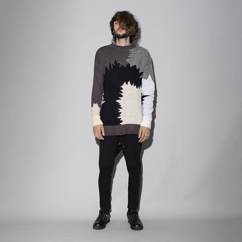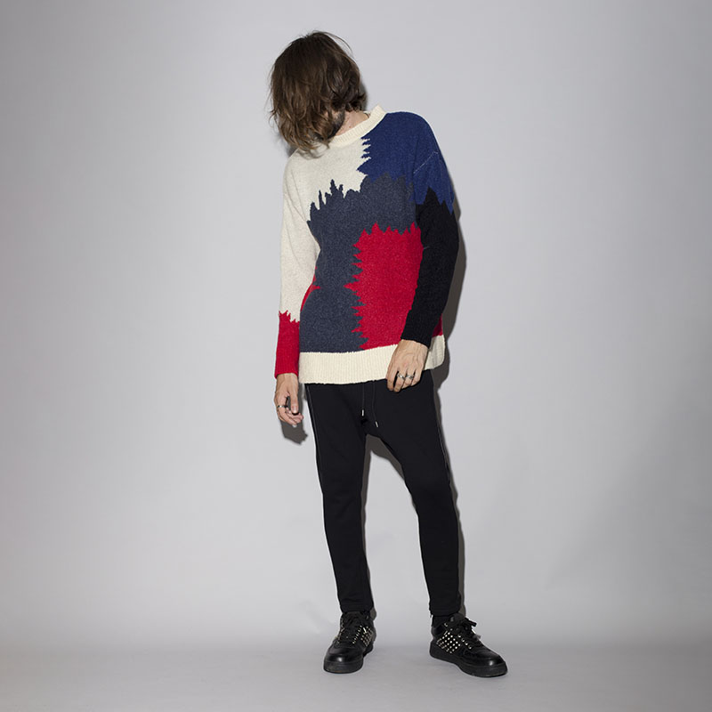 ニットでの表現だからこそできるシームレスな切替が賑やかなデザインにまとまりを与えてくれる。