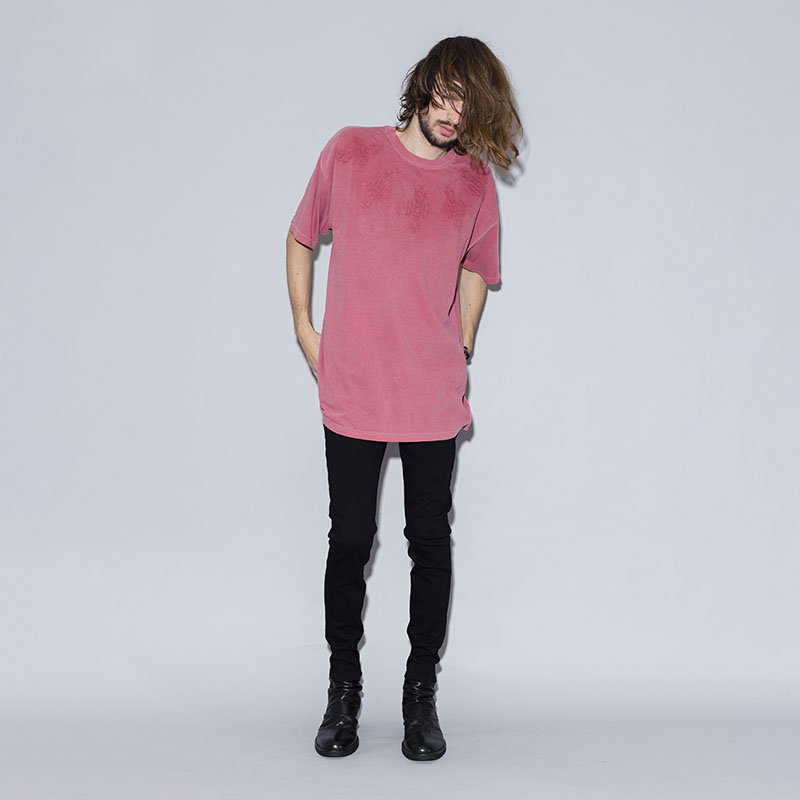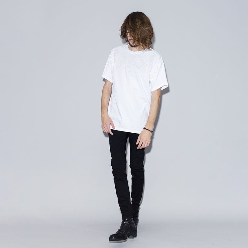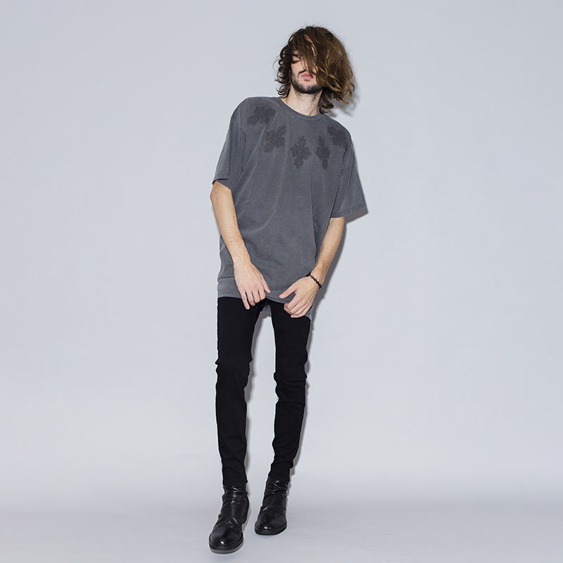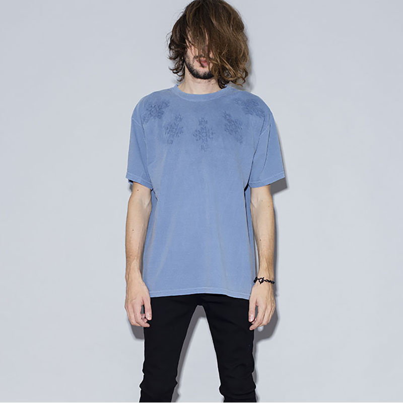 洗っても落ちない樹脂を使いネイティブ柄を生地に型押しすることでシルエットを浮かび上がらせた珍しい手法を採用したプリントTシャツ。プリント後は製品洗いをかけることでナチュラルなアタリが生まれ生地とプリント部分のコントラストをハッキリとさせている。