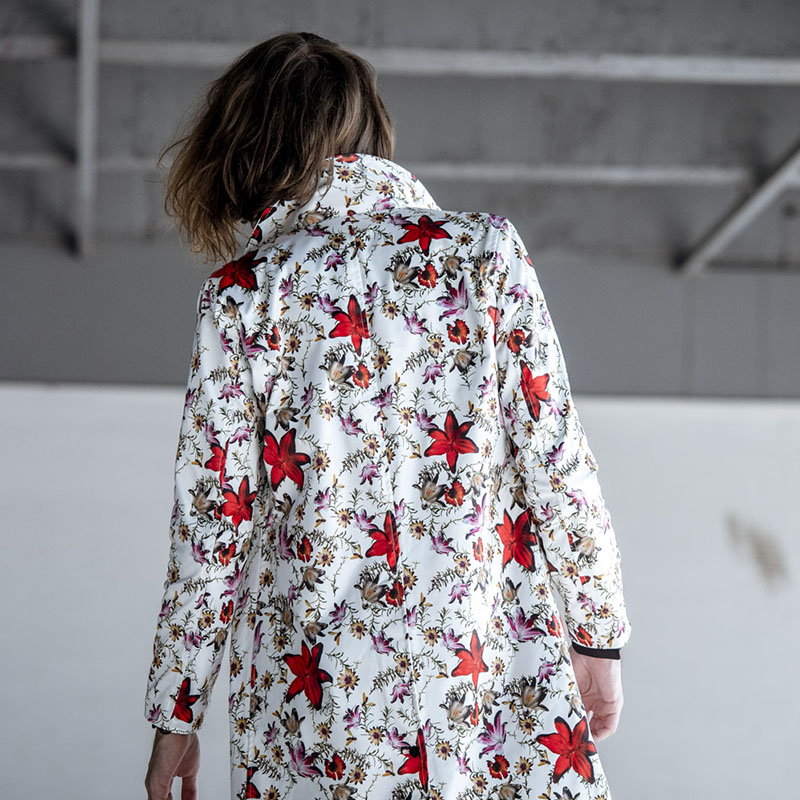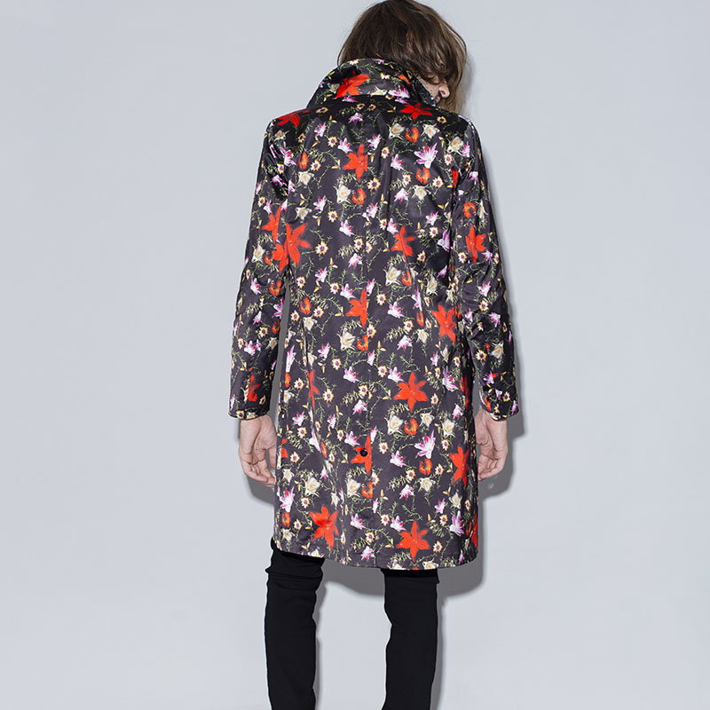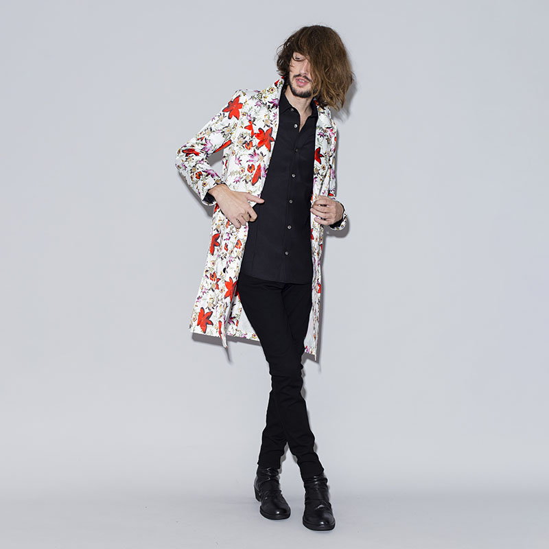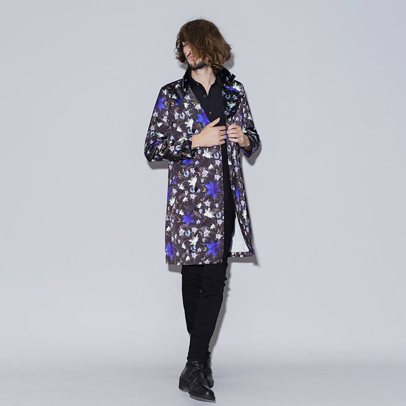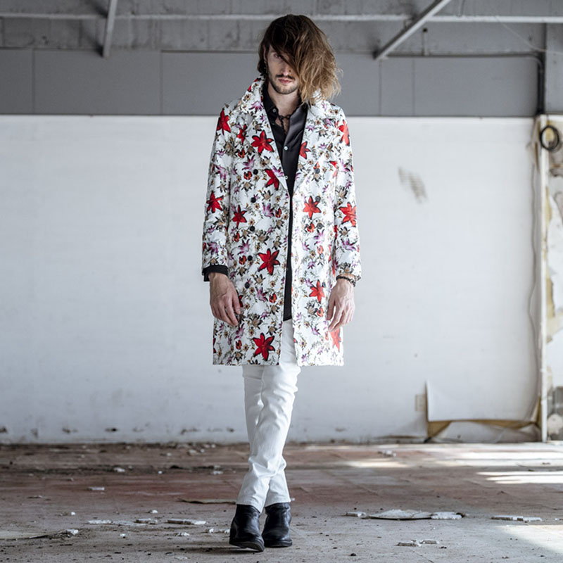 2020S/S COLLECTIONの代表的なアイテムとなるトレンチコートは花と昆虫をベースにしたフローラルパターンにより抜群の存在感を堪能させてくれる一着。圧倒的なヴィジュアルを感じさせながらアイテムとしてはトラディショナルなトレンチコートになっておりタイトなシャツやスキニーパンツとも好相性な作りとなっておりNO ID.の本質的な要素となる大人の色気を感じさせてくれる。
