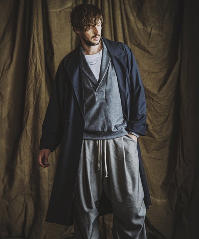 首元を覆うボリュームのあるフード周りのシルエットは従来のフードとは異なるアプローチで個性を発揮する。