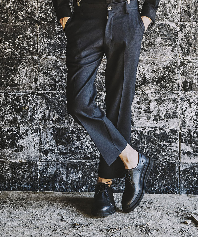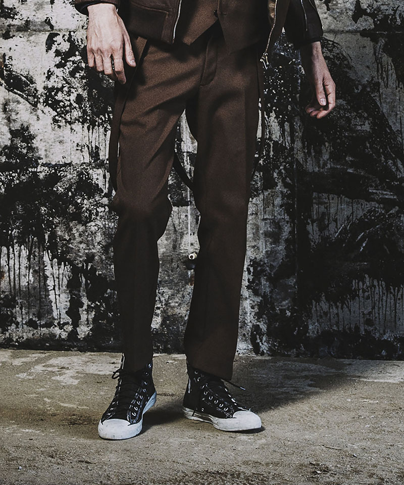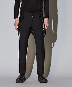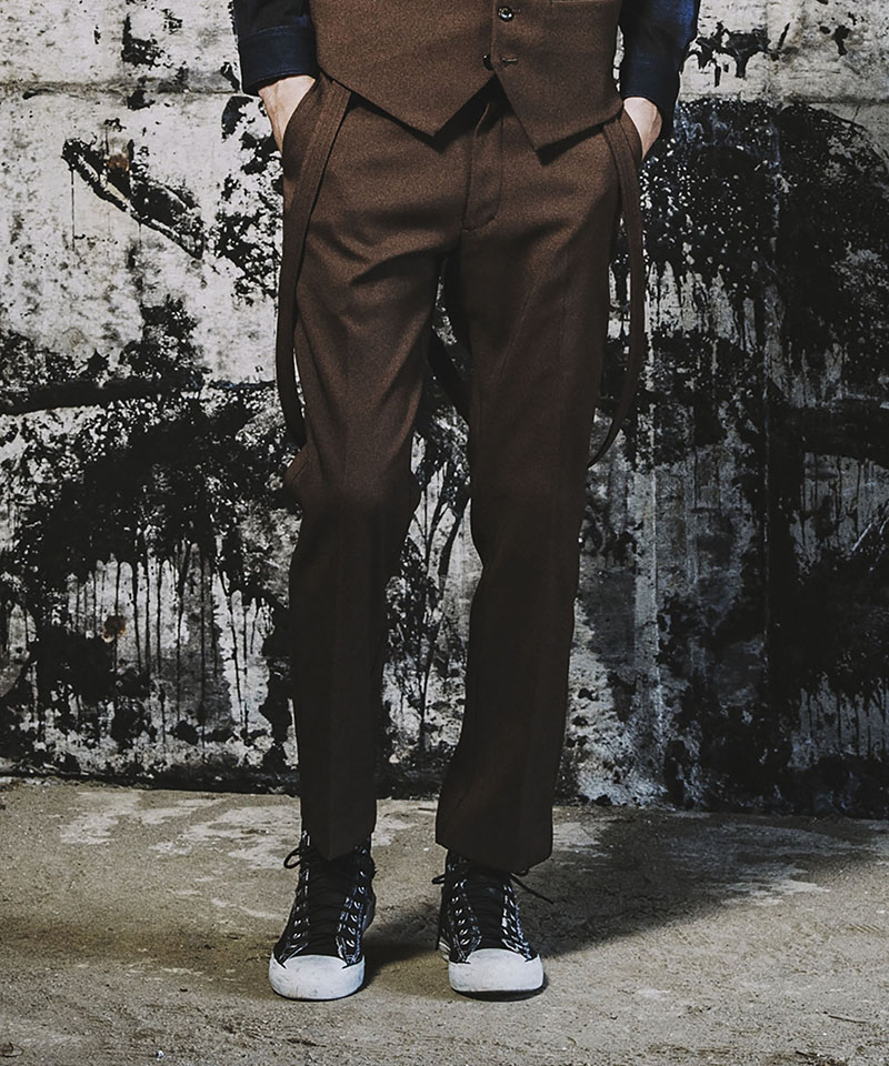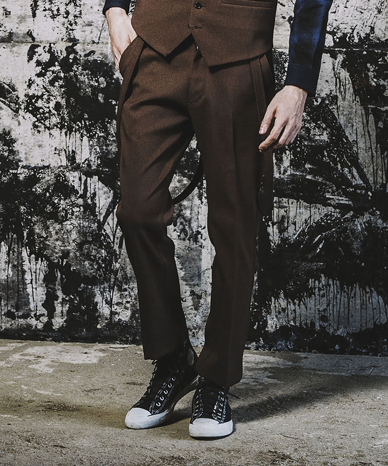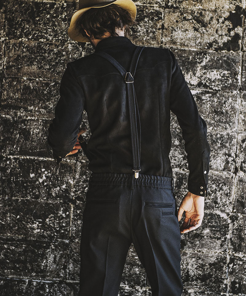 今期はトレンドが再燃しつつあるサスペンダーが付属されシルエットはテーパードをかけない細身のストレートを採用し60年代を彷彿とさせる雰囲気に仕上げている。