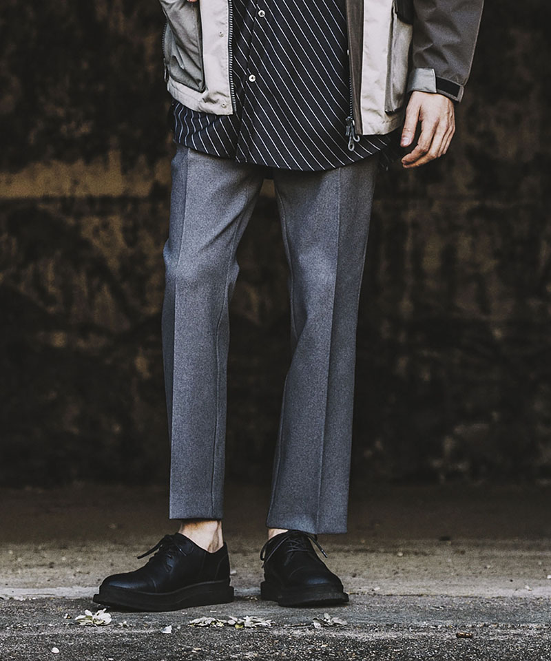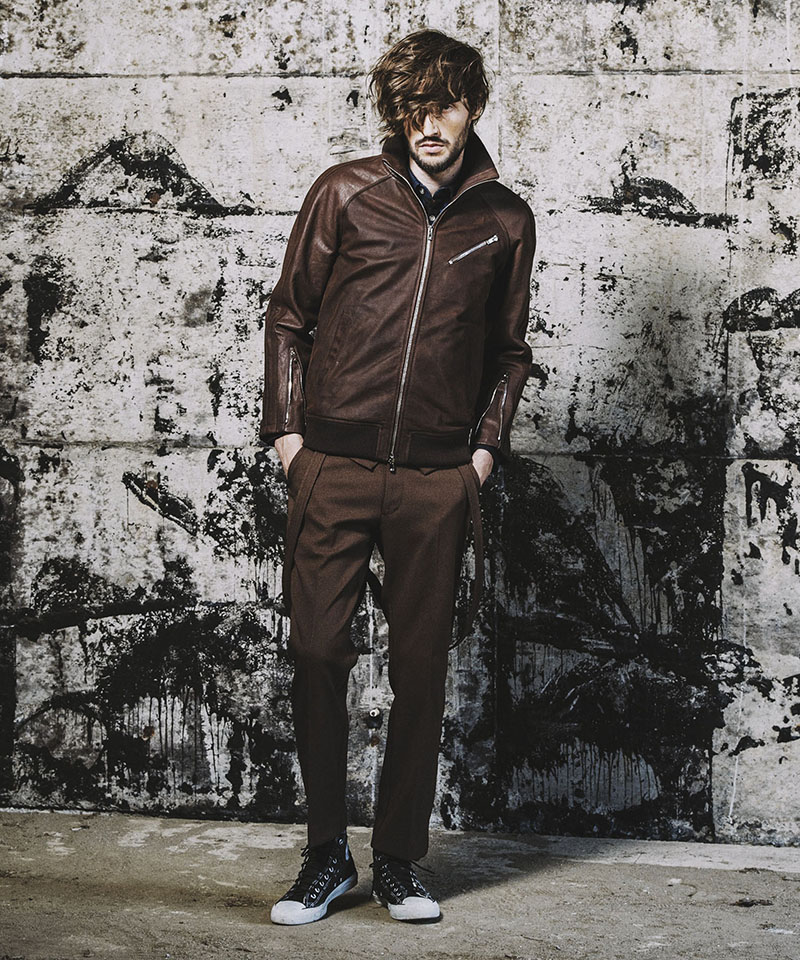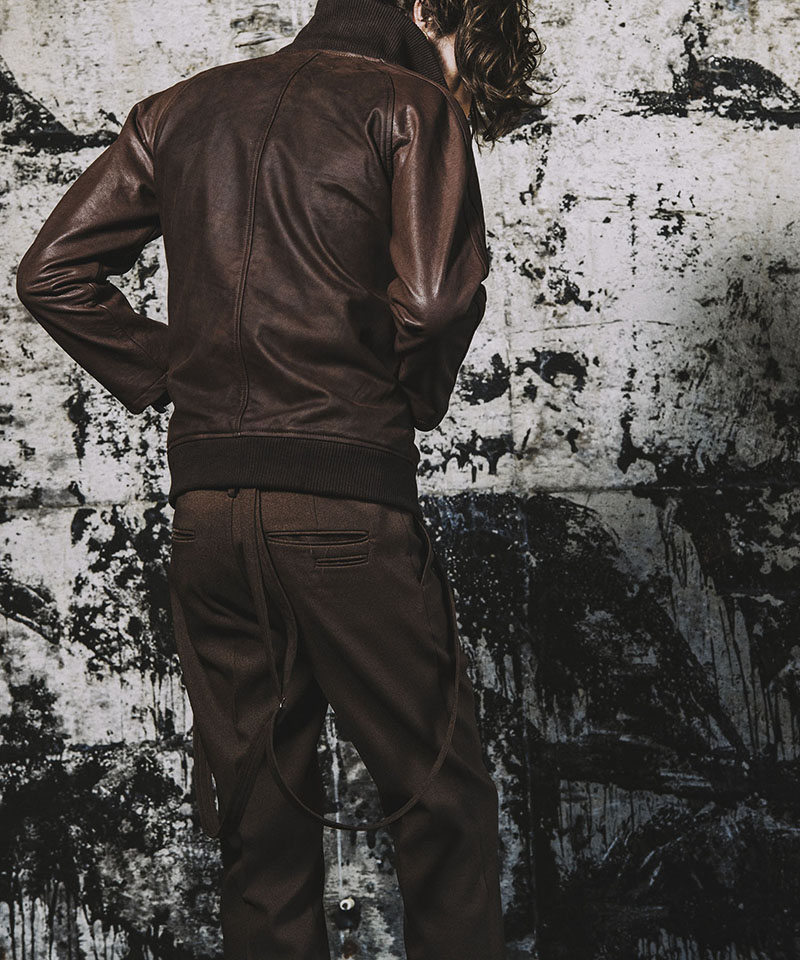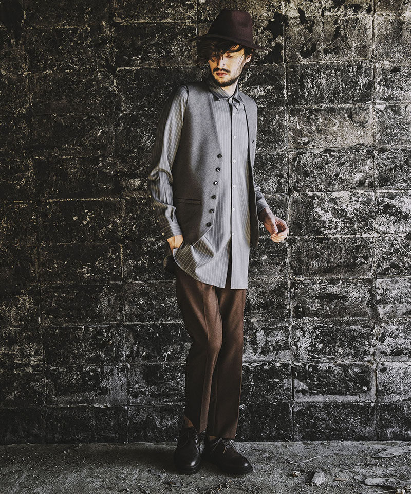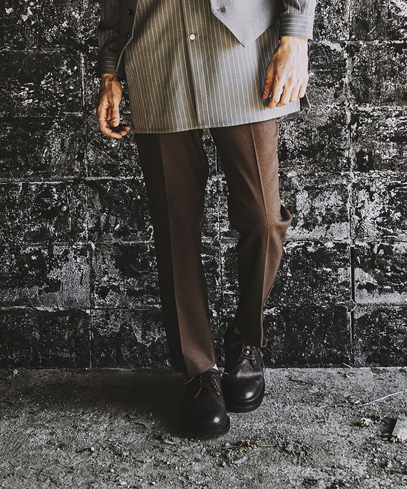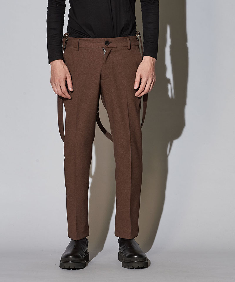 今期はトレンドが再燃しつつあるサスペンダーが付属されシルエットはテーパードをかけない細身のストレートを採用し60年代を彷彿とさせる雰囲気に仕上げている。