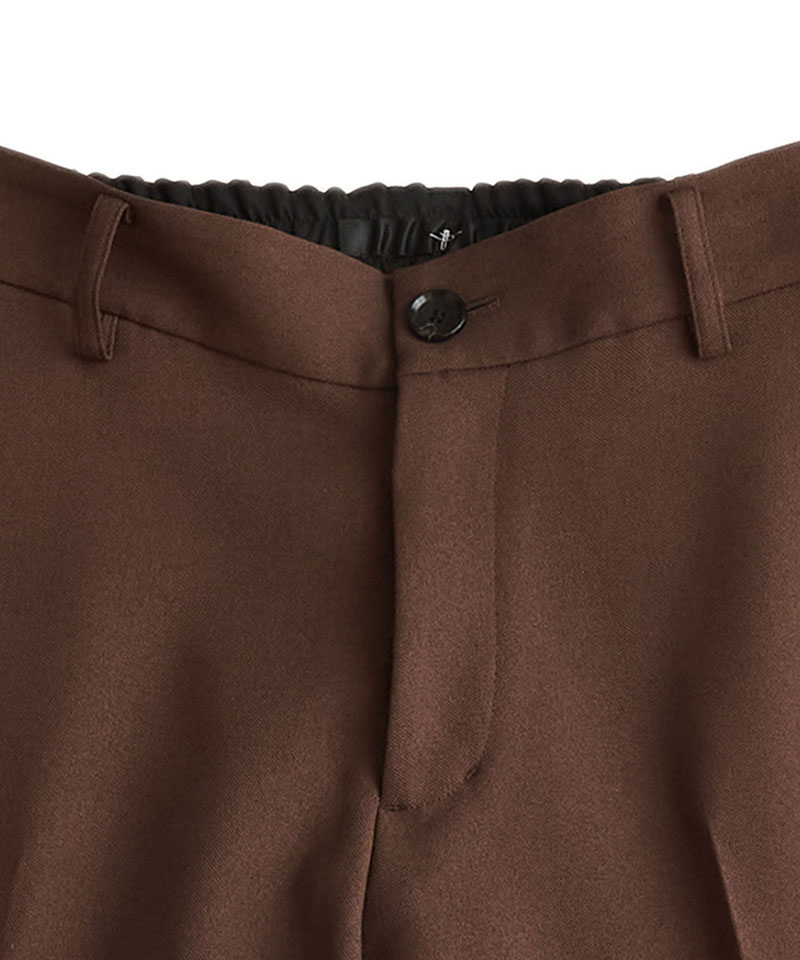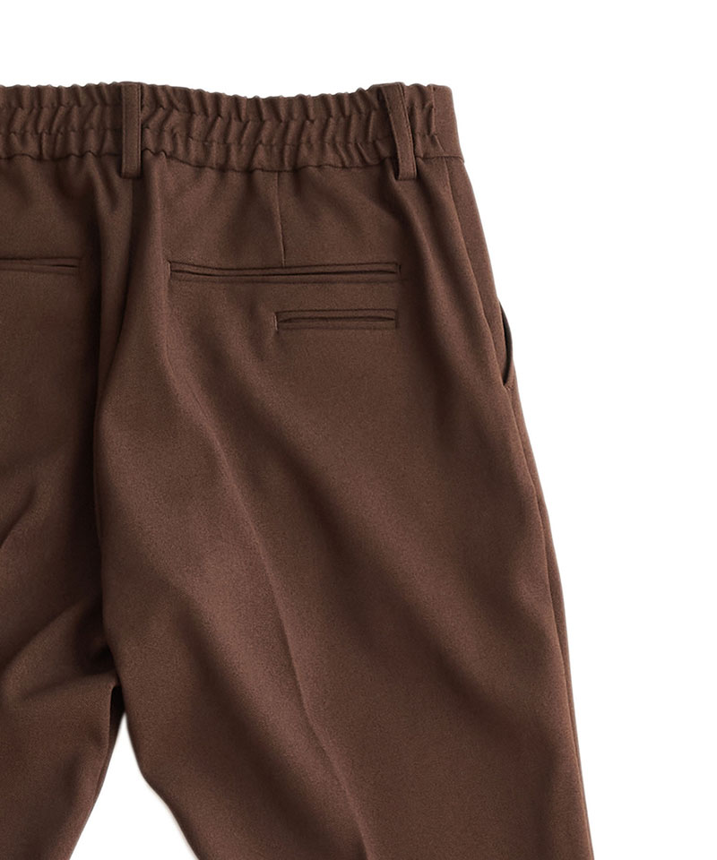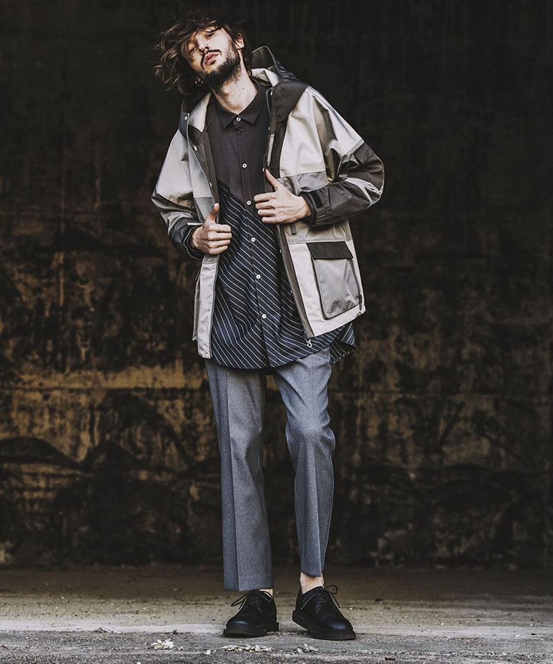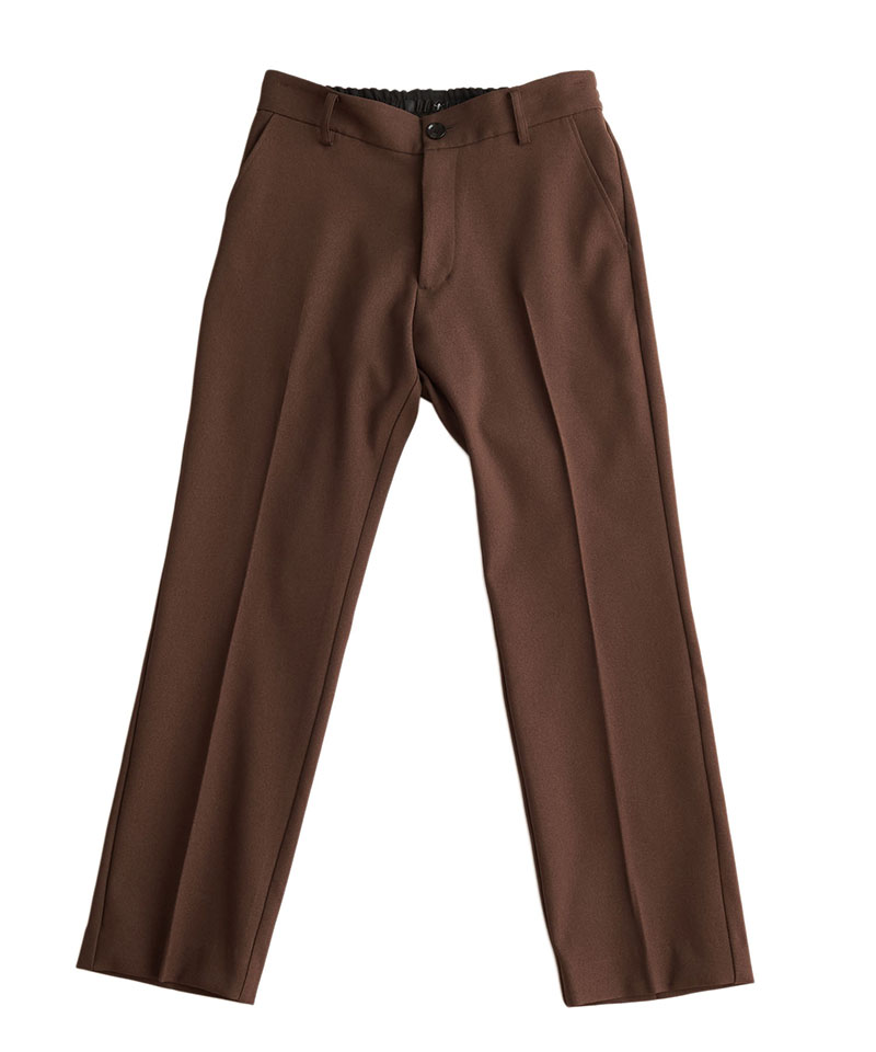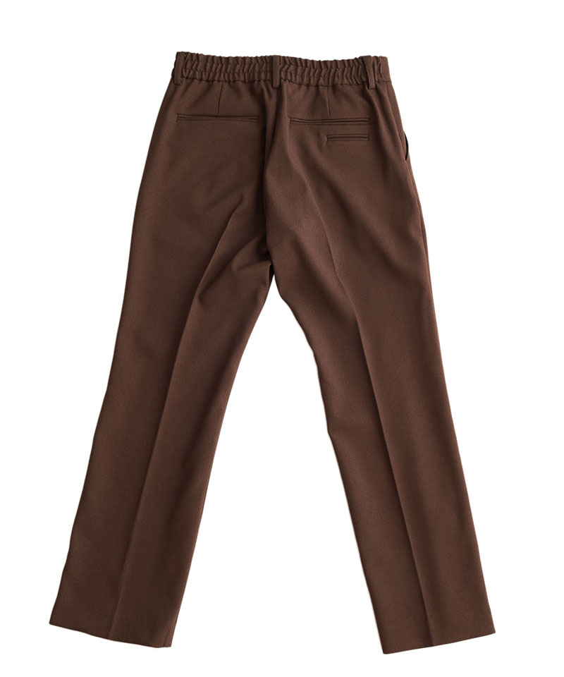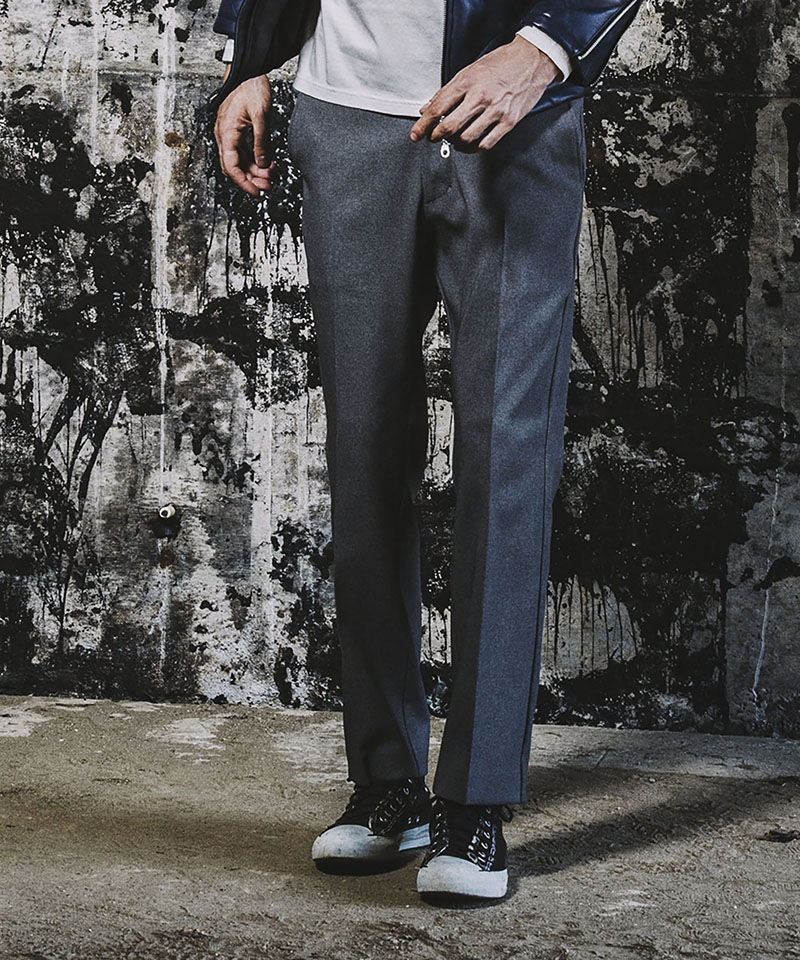 ポリエステルベースの生地なのでノンアイロンで使える手軽さが魅力の1つ。現在では様々なテキスタイルメーカーがアレンジを加えてリリースしており本作はスタプレの雰囲気をそのままにストレッチを混紡した快適なトラウザーズを作成。