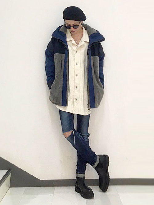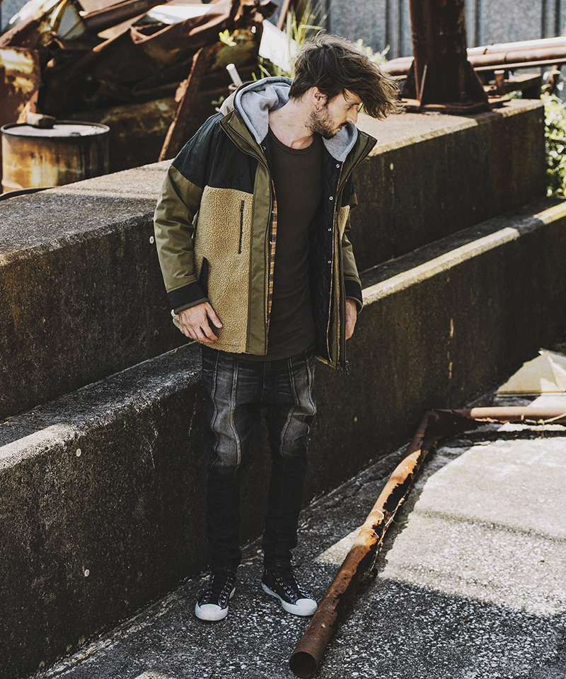 三種の異素材を組み合わせたアイテムながら全て色の系統を揃えることで、それぞれの素材の魅力を引き出しつつも違和感なく自然と馴染むような調和の取れた一着に仕上げた。