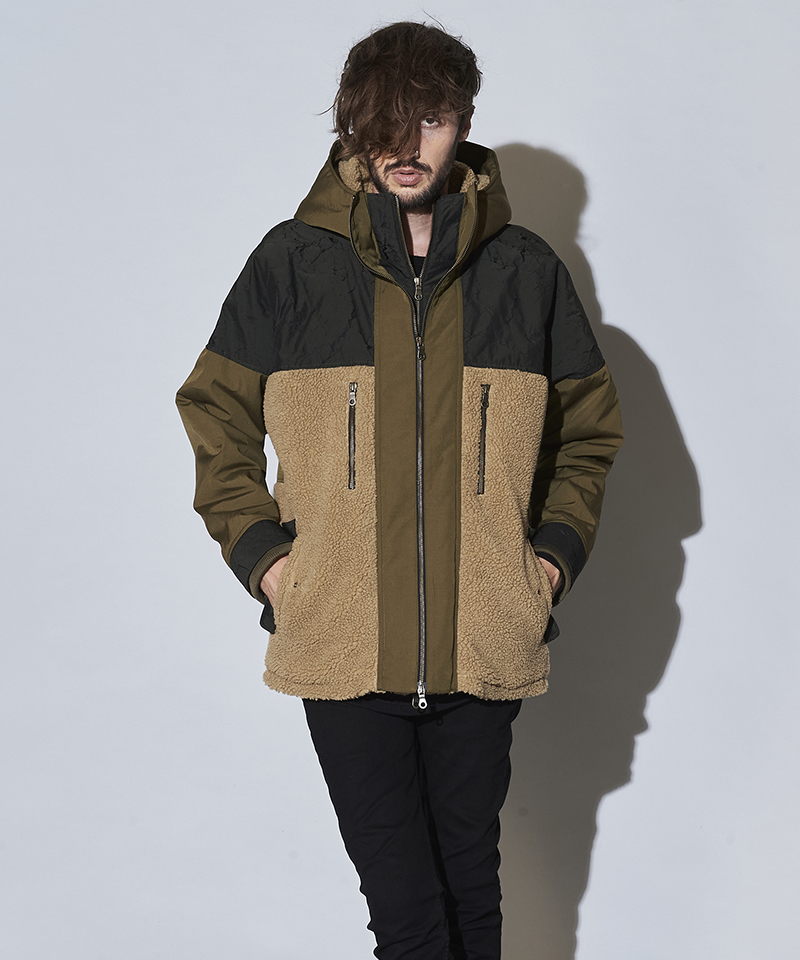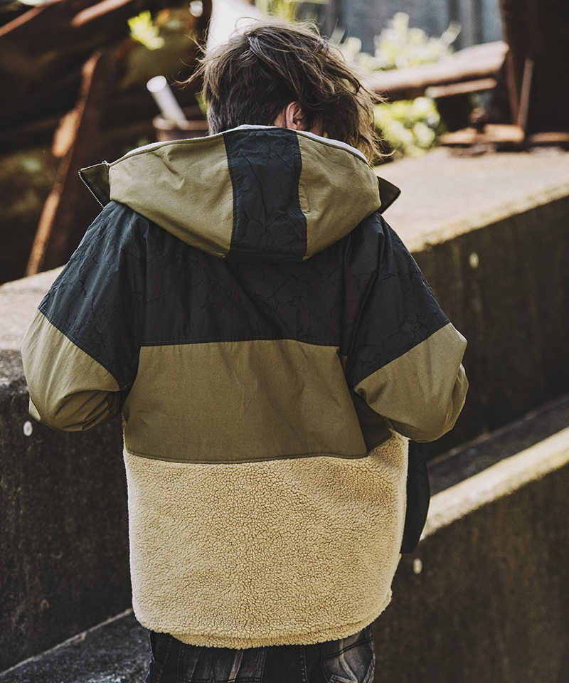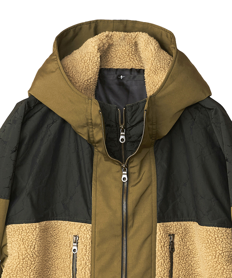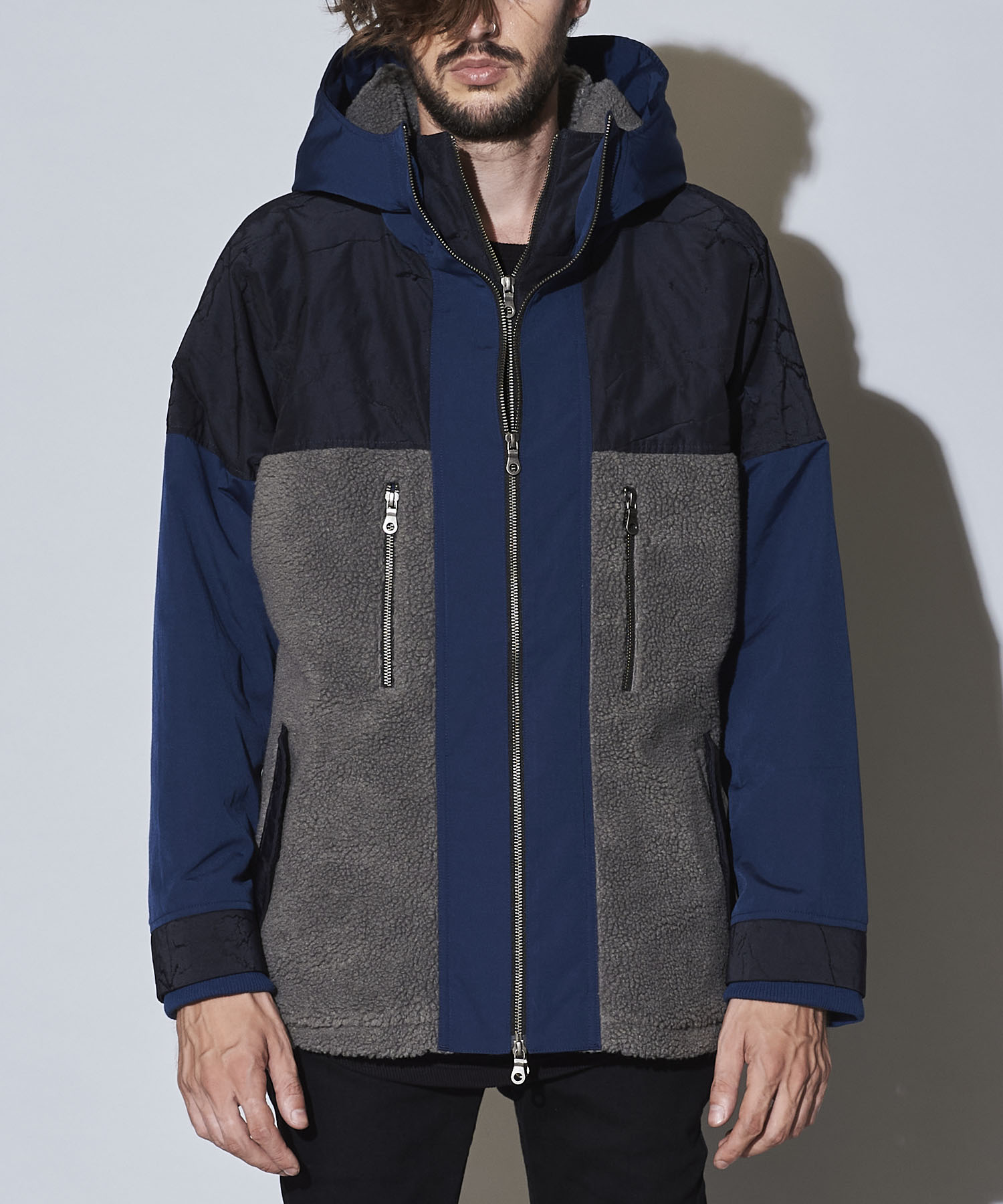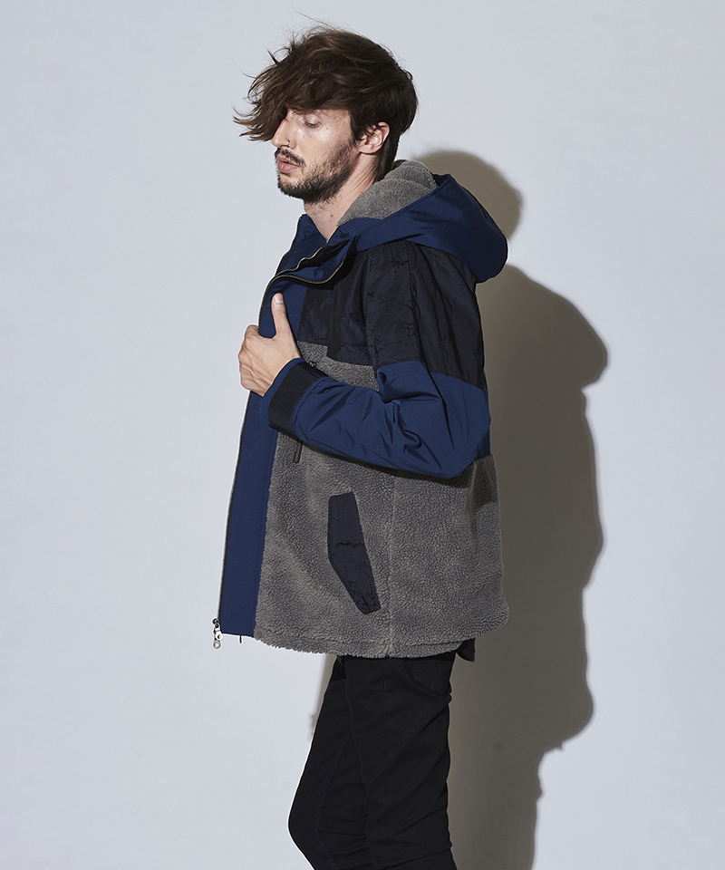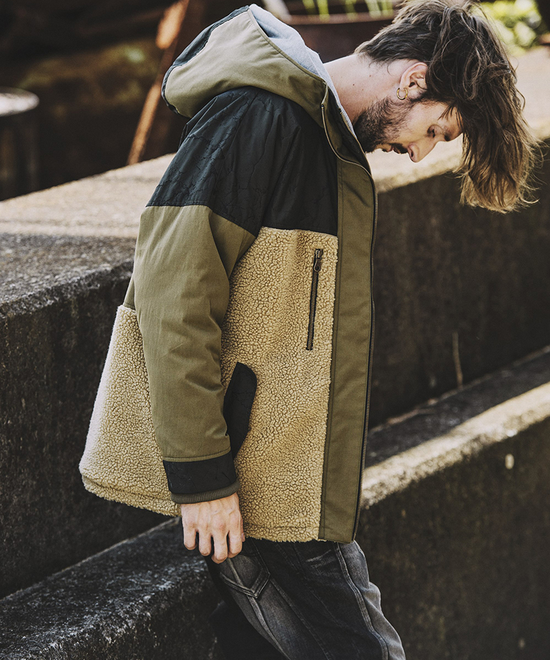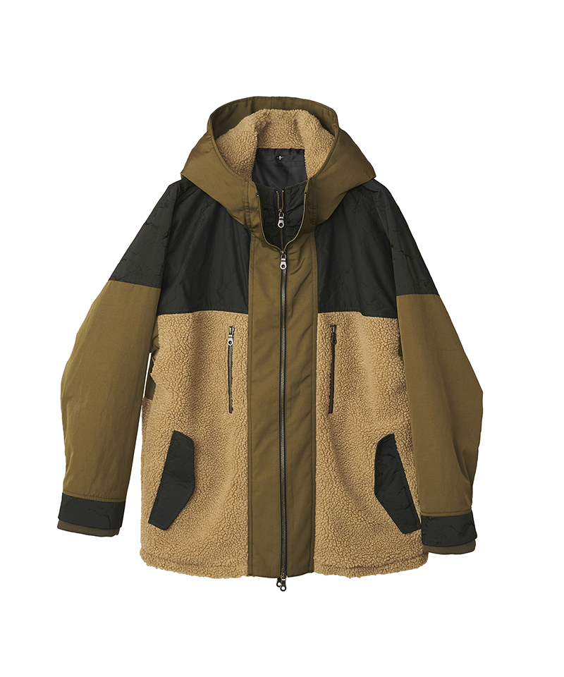 立体的なクラックジャカードが特徴的なナイロンとややトーンを変えた同系色のナイロンの切替に加えて、シーズンムードを高めるボアを身頃で切り替えたオーバーサイジングのフーデッドブルゾン。フロントZIPを二重に重ねることで、(防風効果と)それぞれのZIPの開け閉めの具合で首回りのディテールに変化を付けた多様な着こなしアレンジが可能。袖には内側にリブを配して外気の侵入を防ぎ、防寒面への配慮も抜かりない仕様。