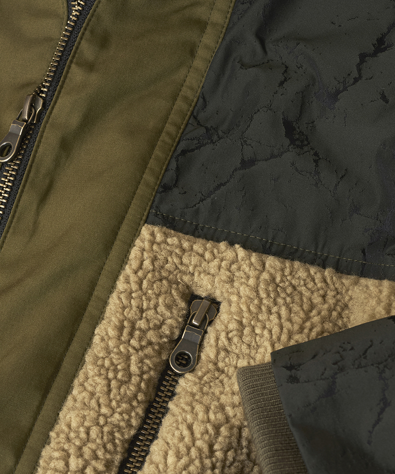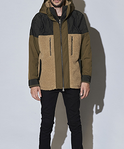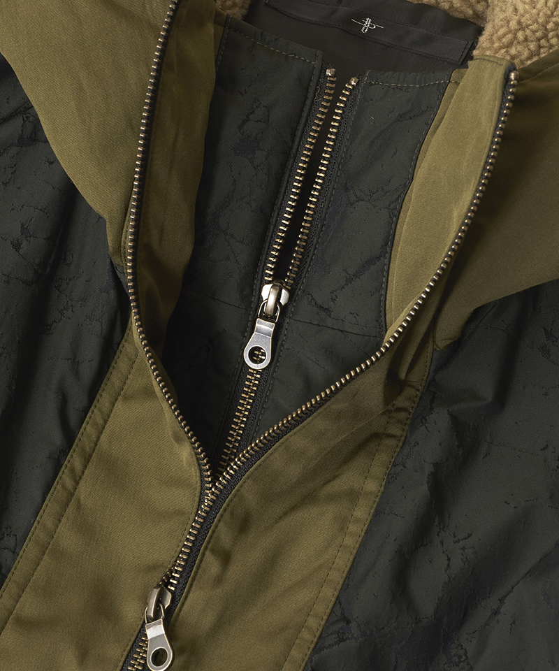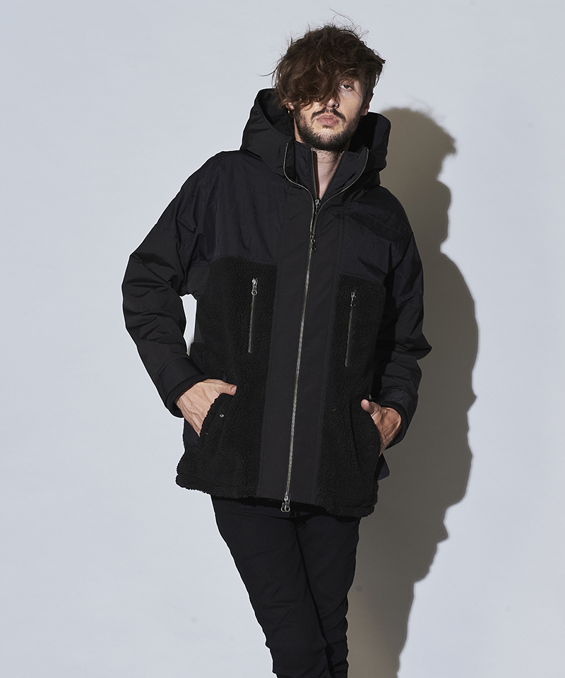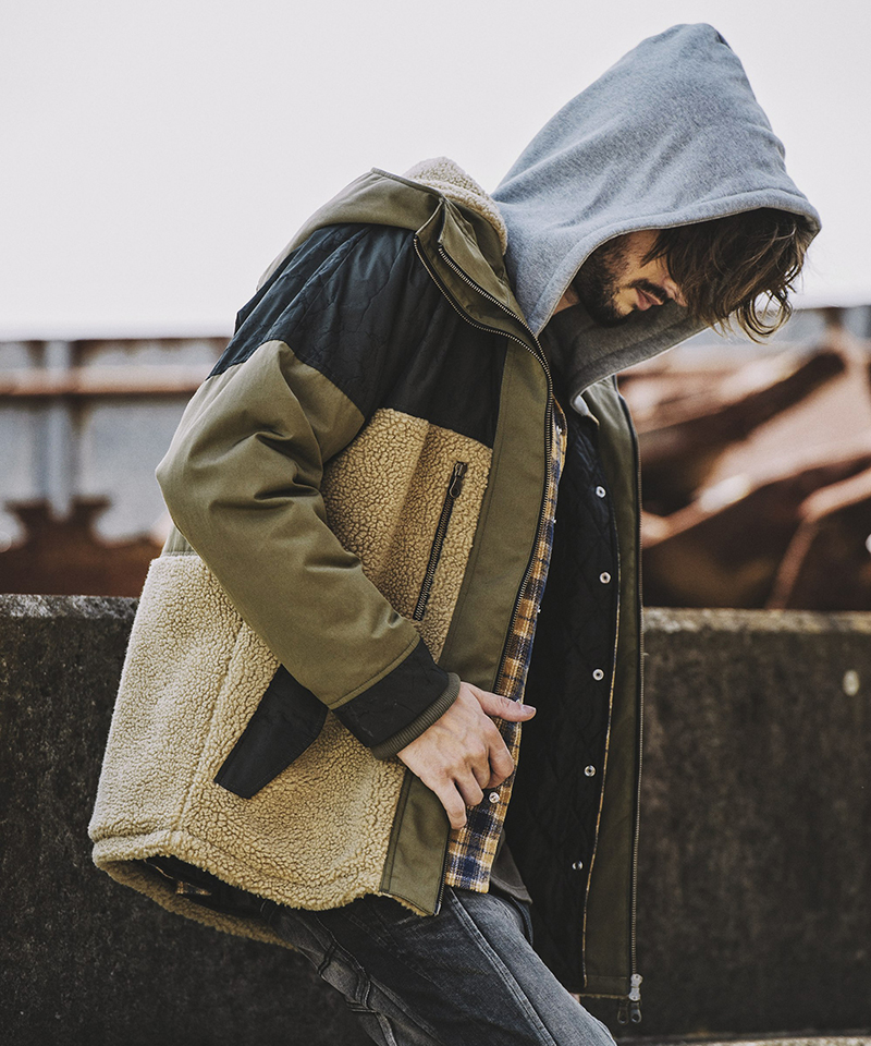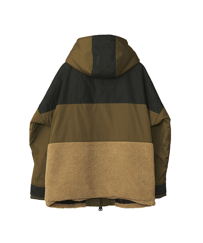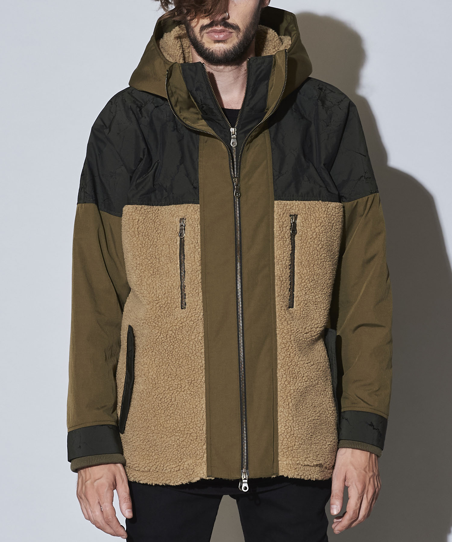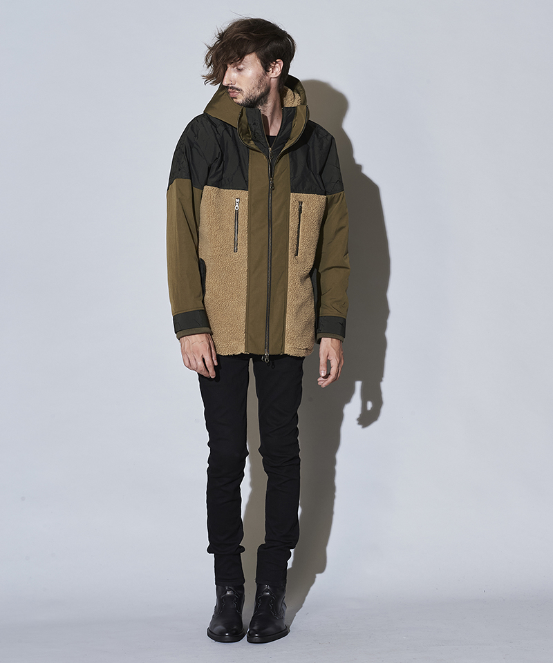 立体的なクラックジャカードが特徴的なナイロンとややトーンを変えた同系色のナイロンの切替に加えて、シーズンムードを高めるボアを身頃で切り替えたオーバーサイジングのフーデッドブルゾン。フロントZIPを二重に重ねることで、(防風効果と)それぞれのZIPの開け閉めの具合で首回りのディテールに変化を付けた多様な着こなしアレンジが可能。袖には内側にリブを配して外気の侵入を防ぎ、防寒面への配慮も抜かりない仕様。