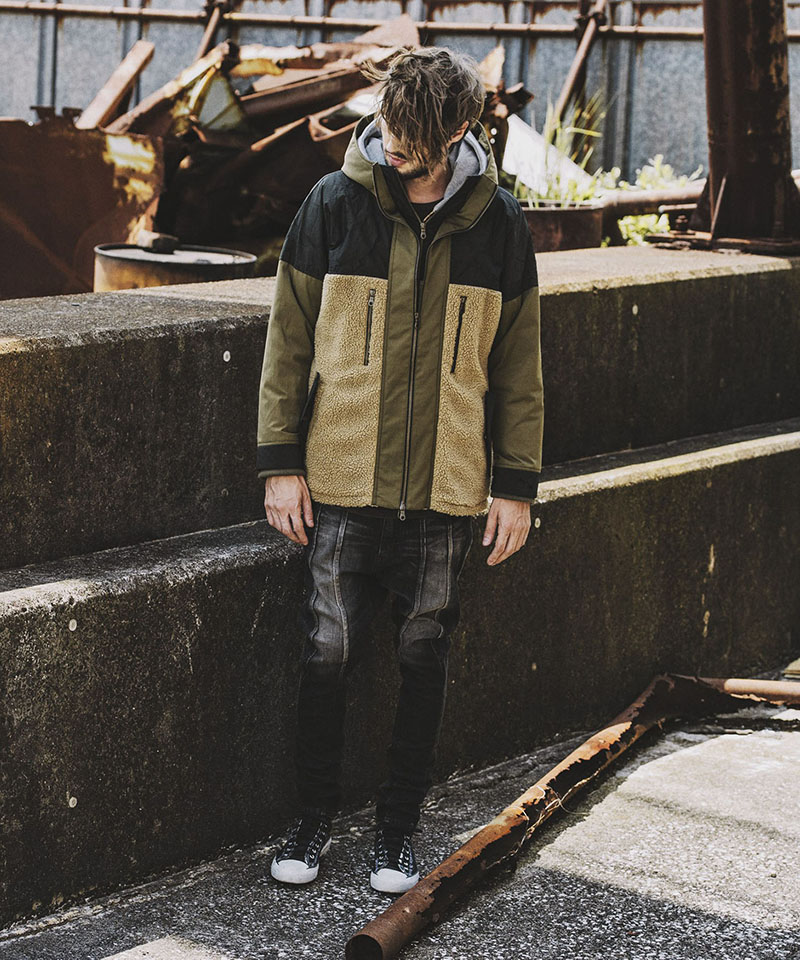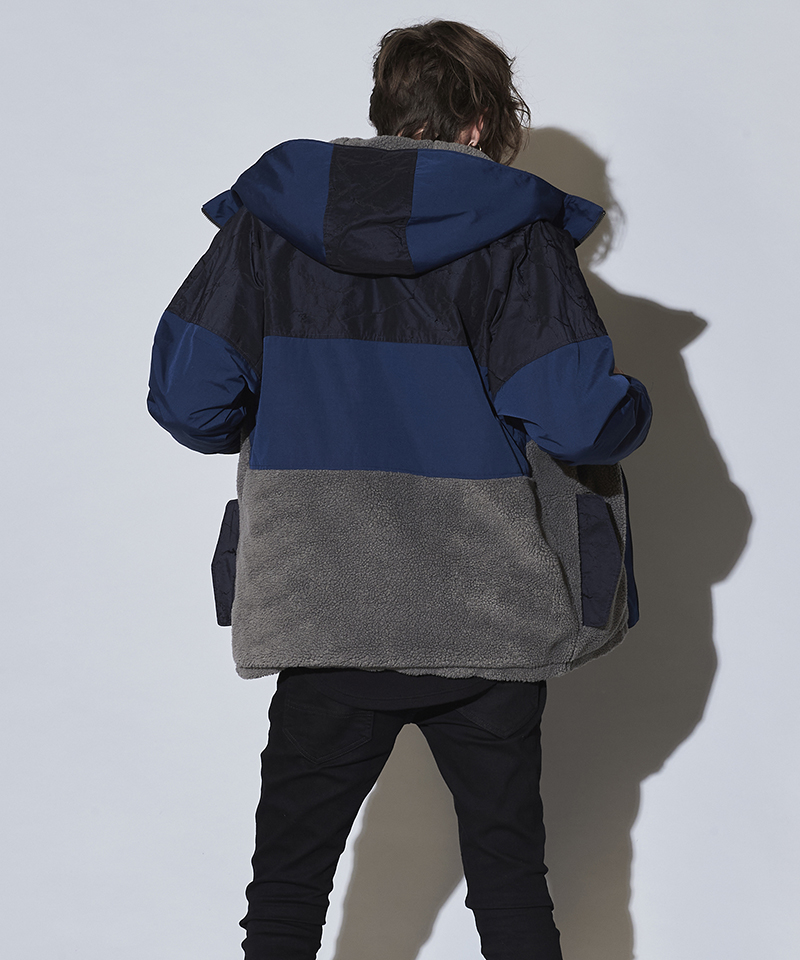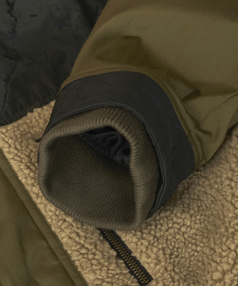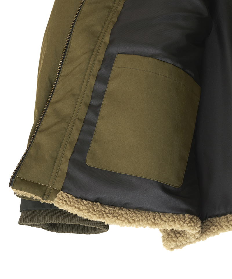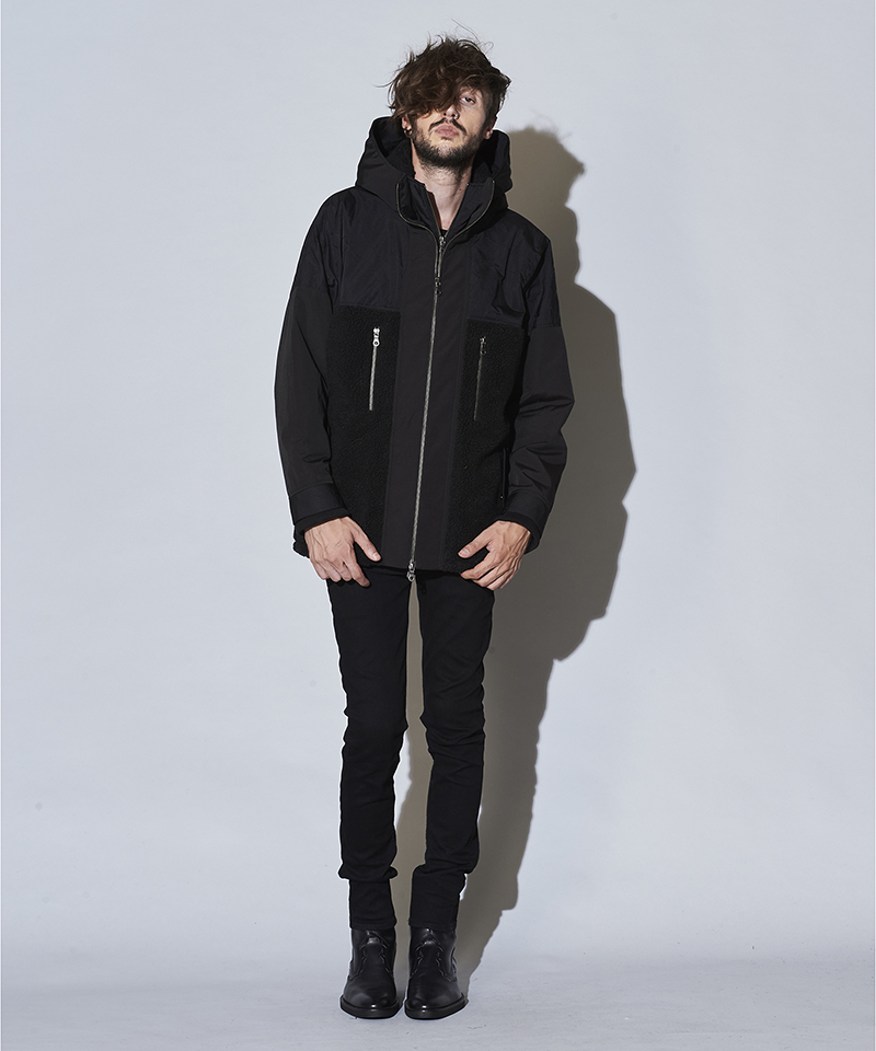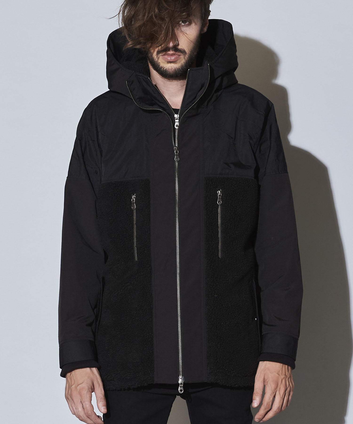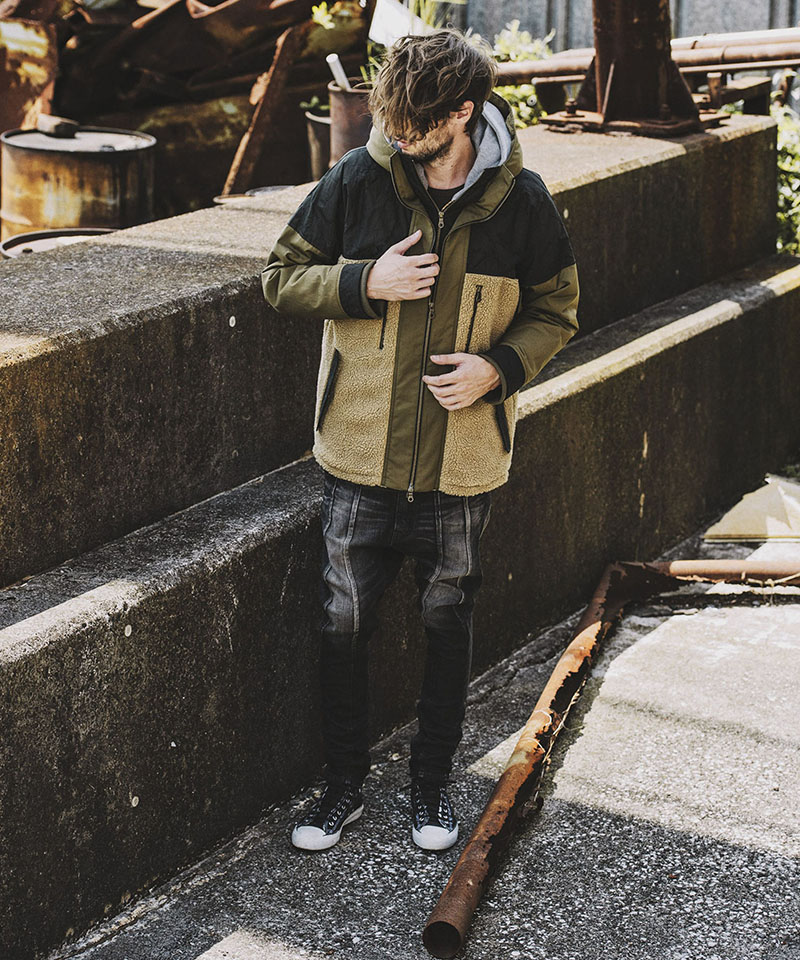 立体的なクラックジャカードが特徴的なナイロンとややトーンを変えた同系色のナイロンの切替に加えて、シーズンムードを高めるボアを身頃で切り替えたオーバーサイジングのフーデッドブルゾン。フロントZIPを二重に重ねることで、(防風効果と)それぞれのZIPの開け閉めの具合で首回りのディテールに変化を付けた多様な着こなしアレンジが可能。袖には内側にリブを配して外気の侵入を防ぎ、防寒面への配慮も抜かりない仕様。
