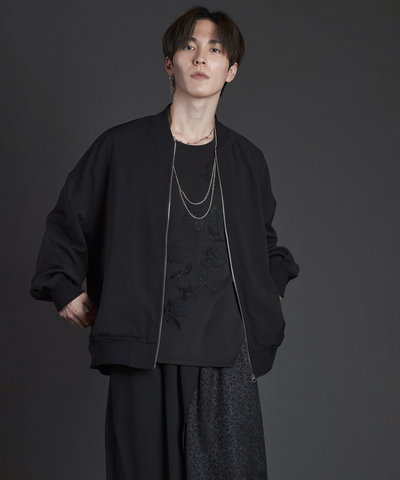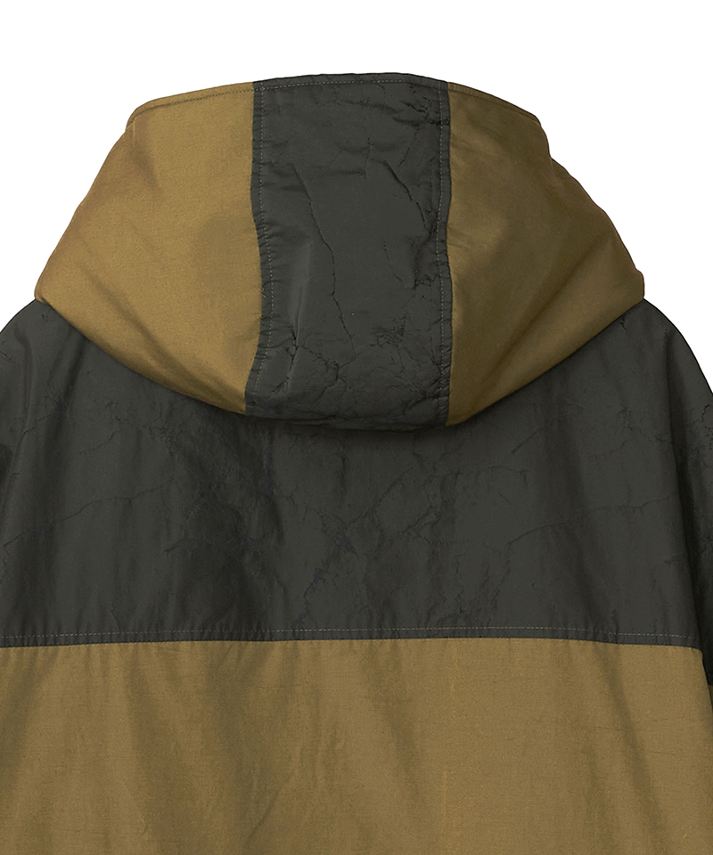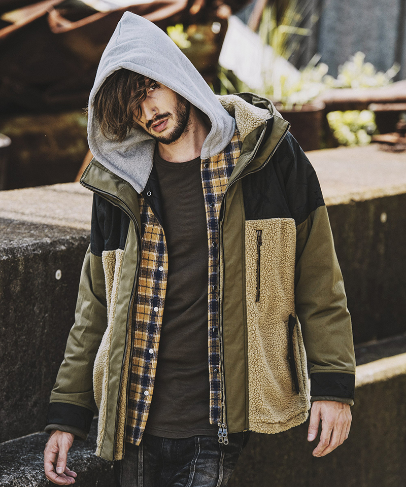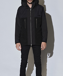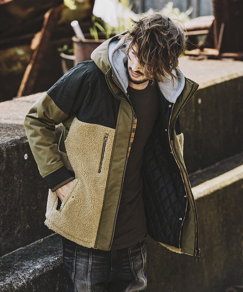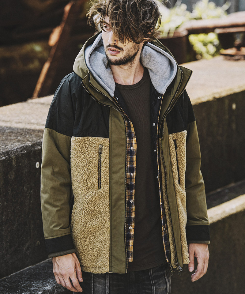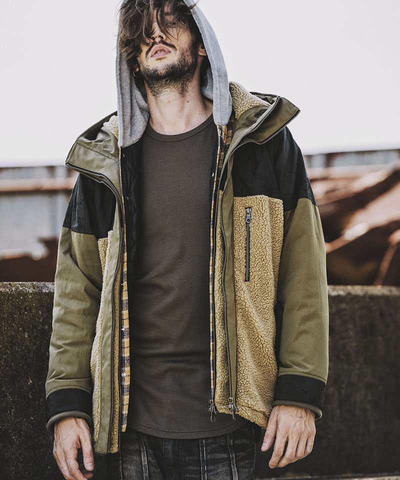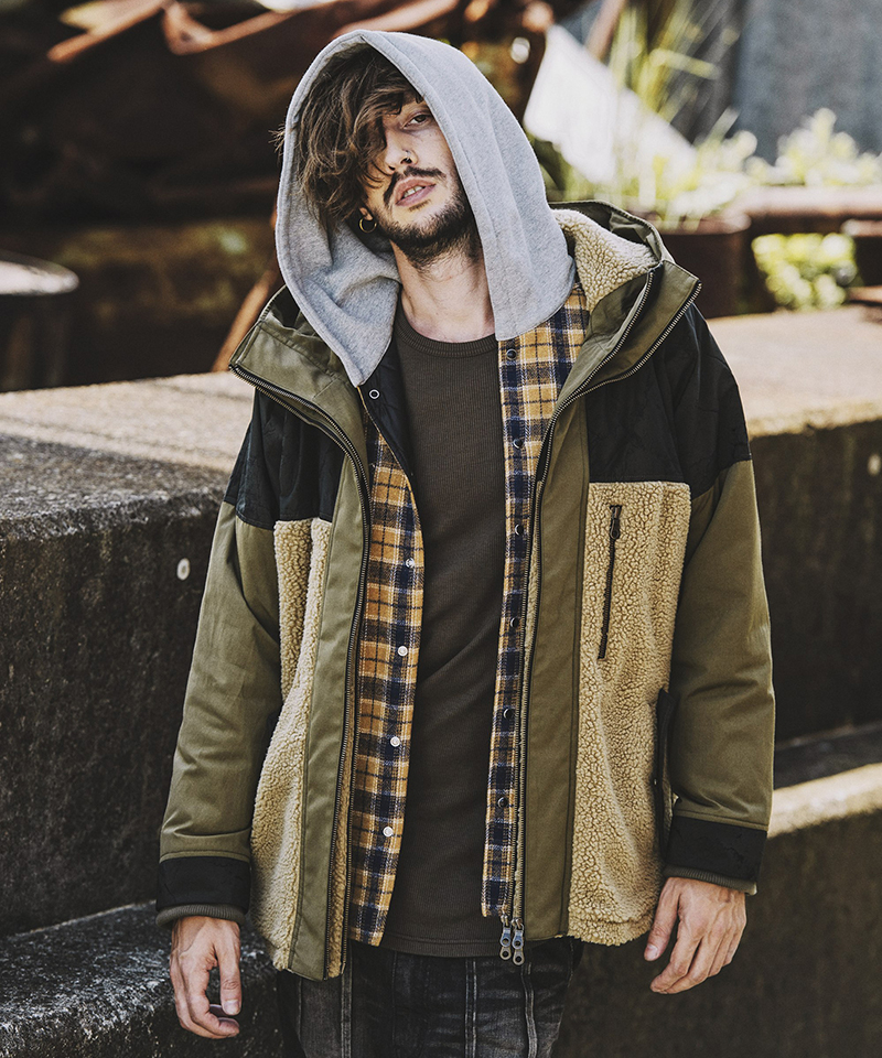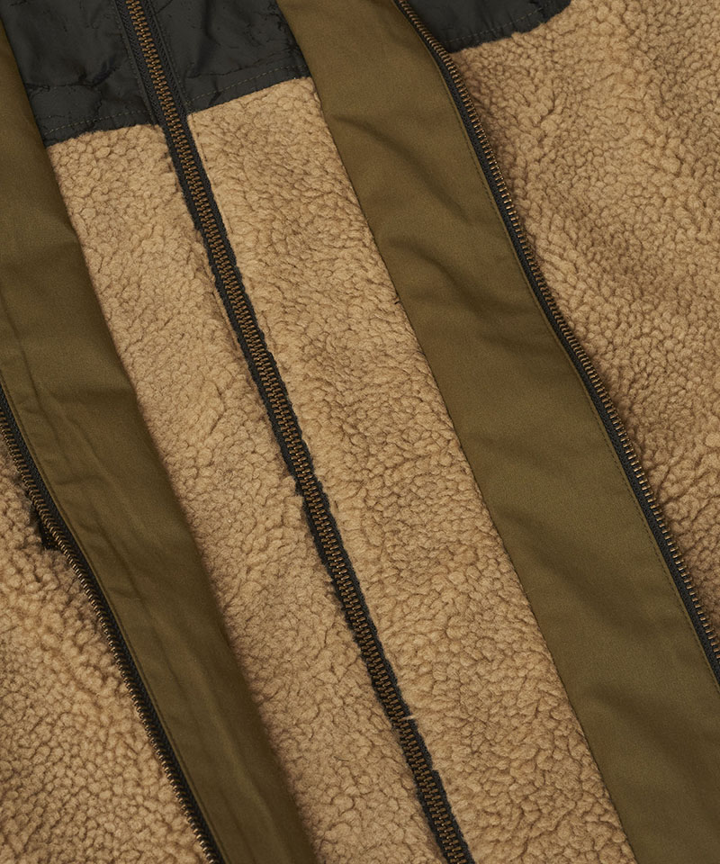 立体的なクラックジャカードが特徴的なナイロンとややトーンを変えた同系色のナイロンの切替に加えて、シーズンムードを高めるボアを身頃で切り替えたオーバーサイジングのフーデッドブルゾン。フロントZIPを二重に重ねることで、(防風効果と)それぞれのZIPの開け閉めの具合で首回りのディテールに変化を付けた多様な着こなしアレンジが可能。袖には内側にリブを配して外気の侵入を防ぎ、防寒面への配慮も抜かりない仕様。