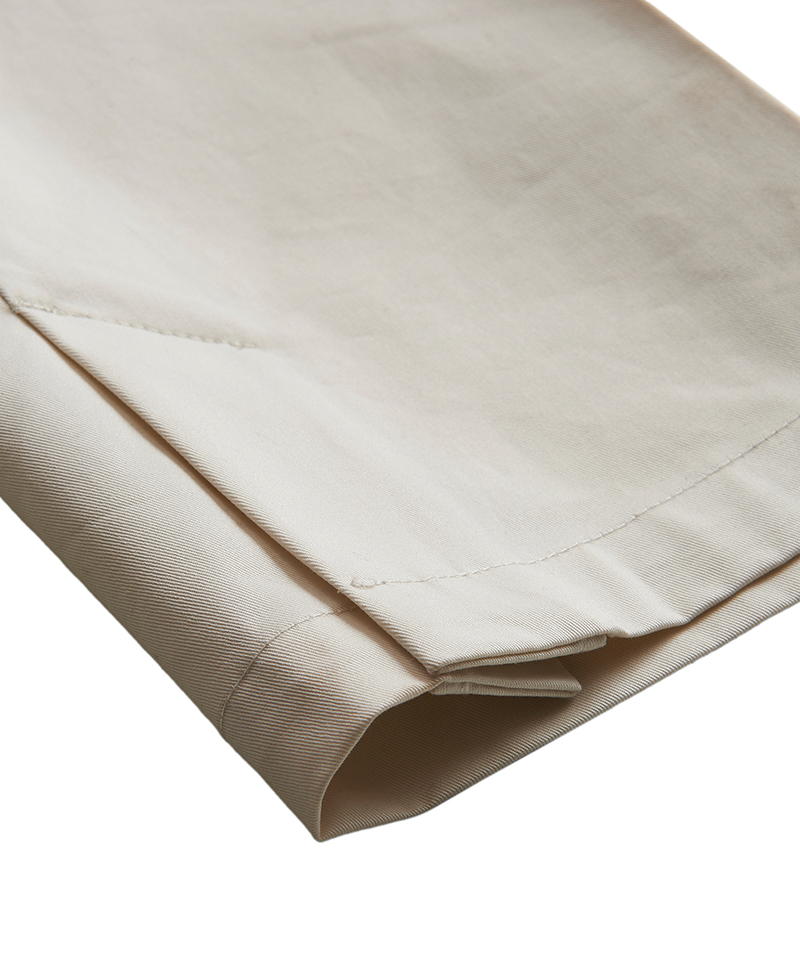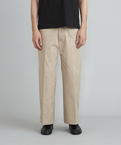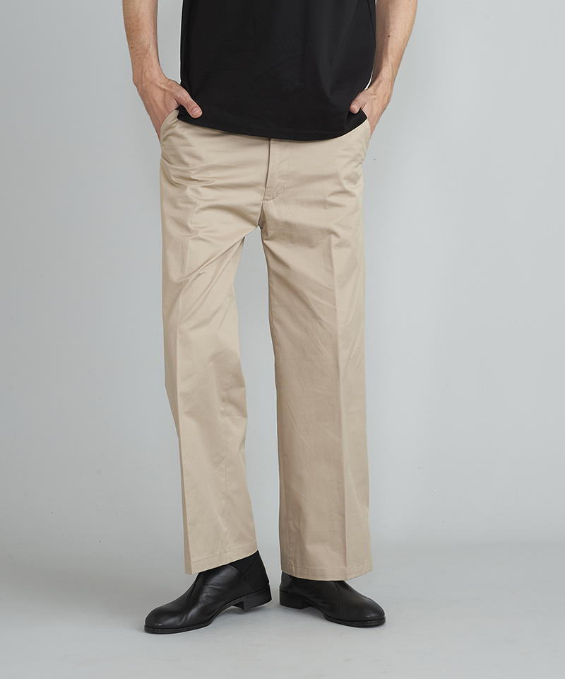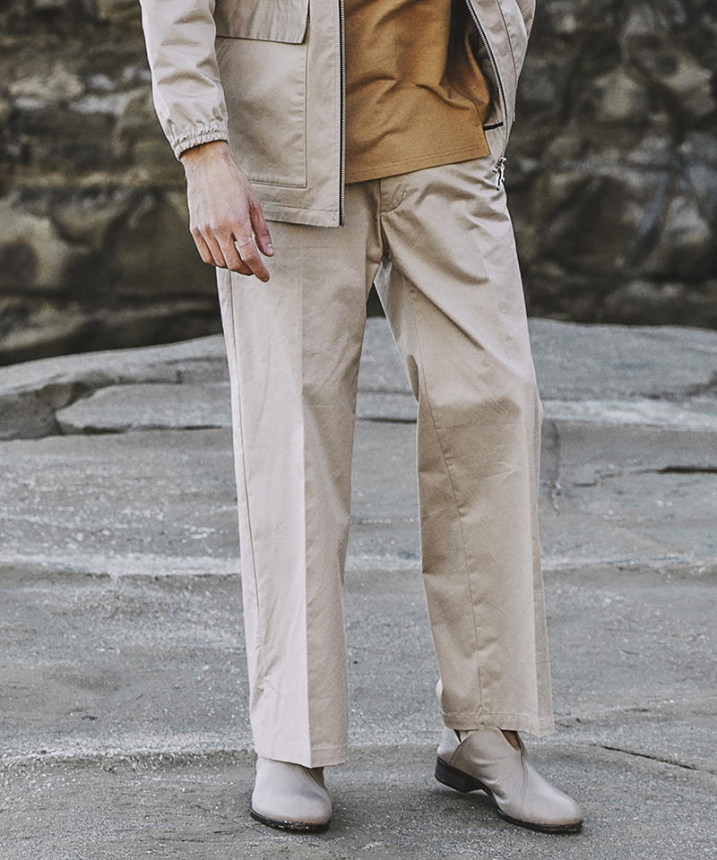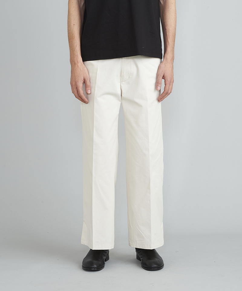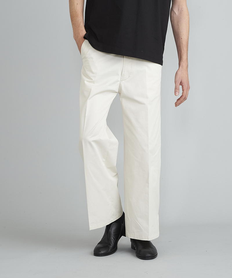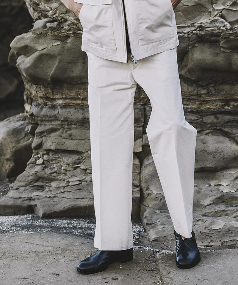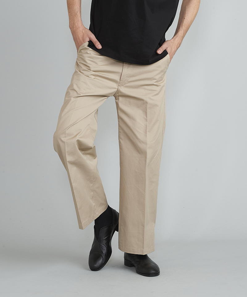 自然な光沢と目の詰まった張りのあるタフな印象のチノクロスを使用したワイドパンツ。