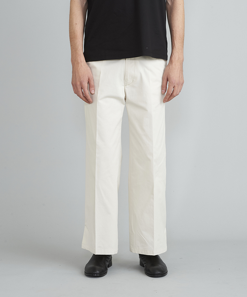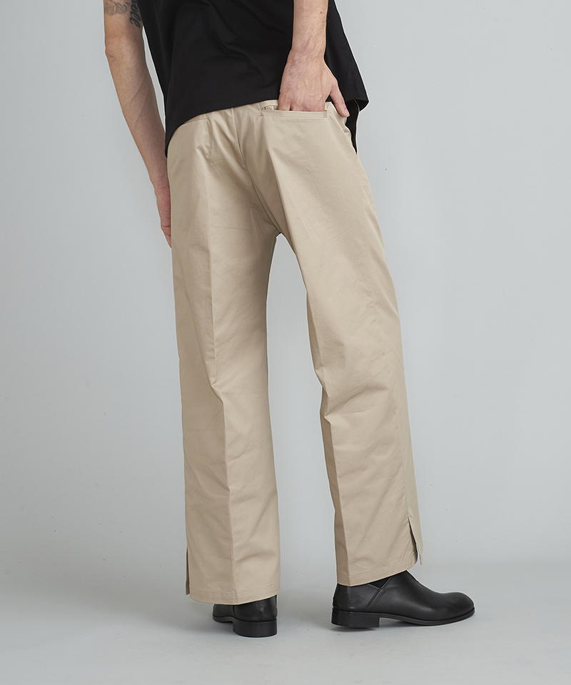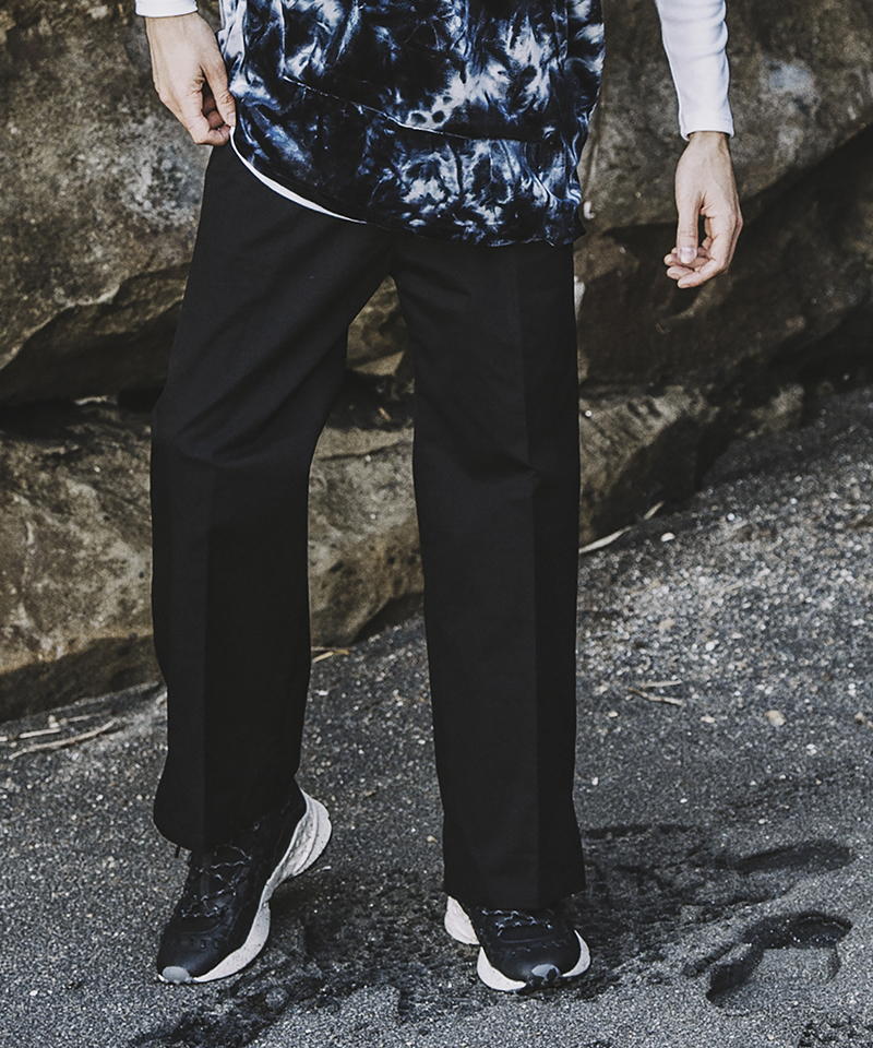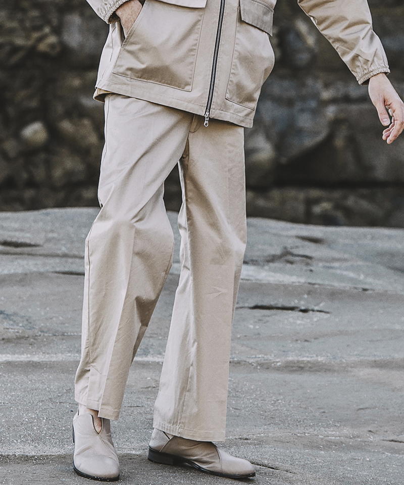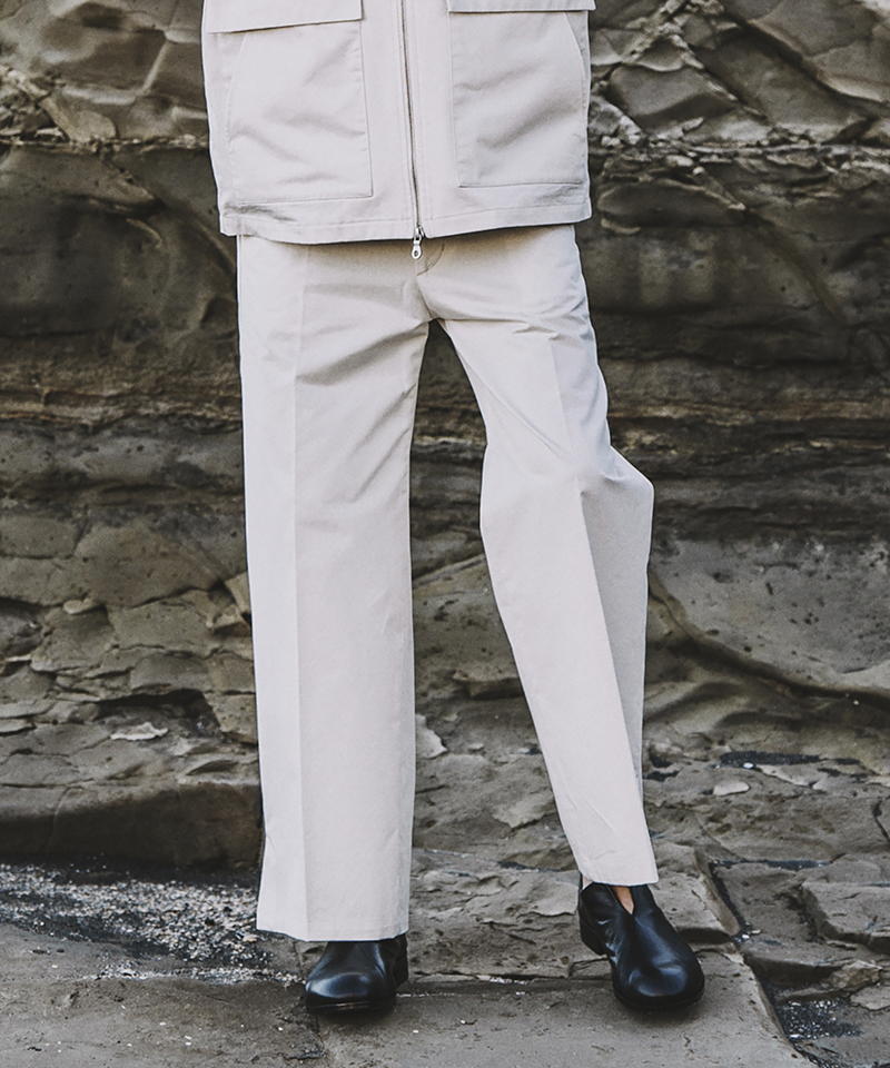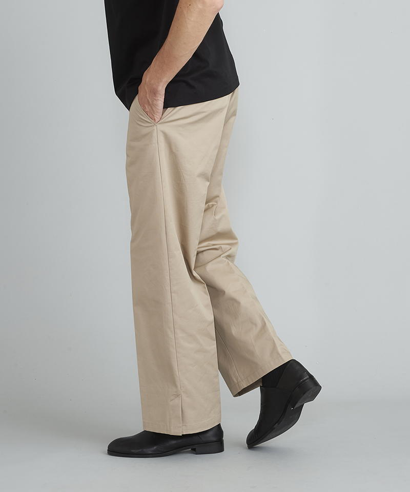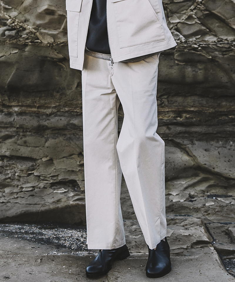 自然な光沢と目の詰まった張りのあるタフな印象のチノクロスを使用したワイドパンツ。