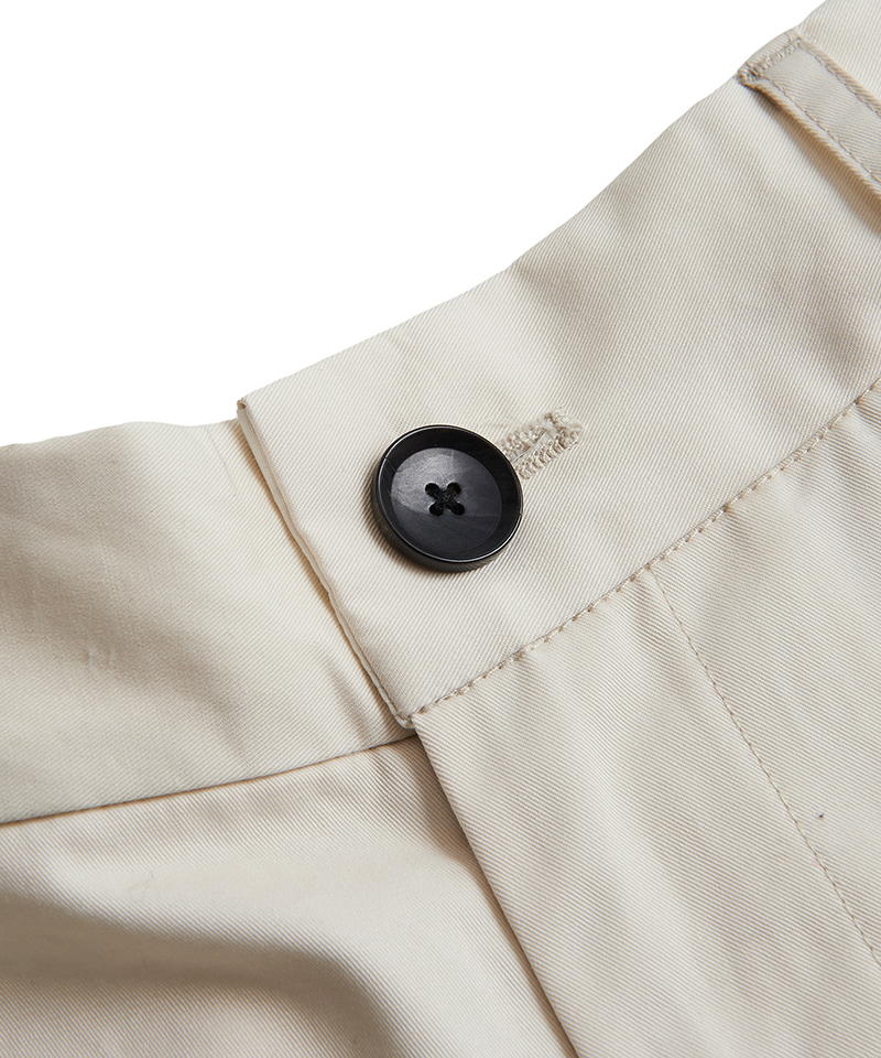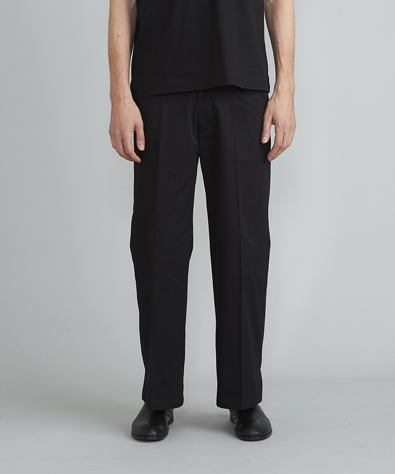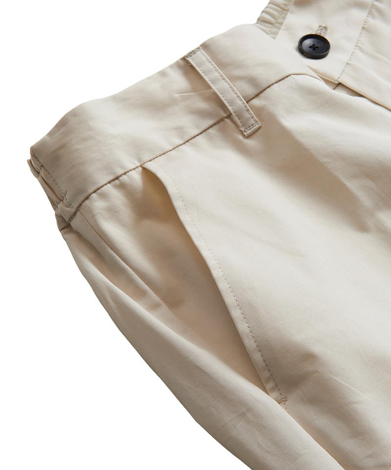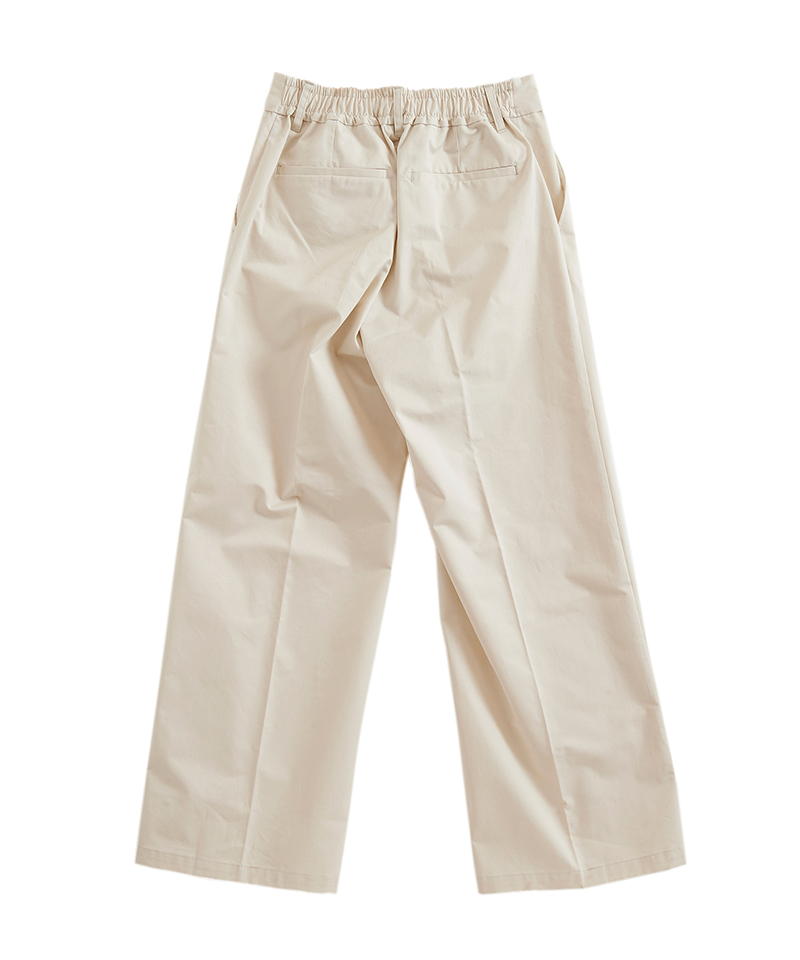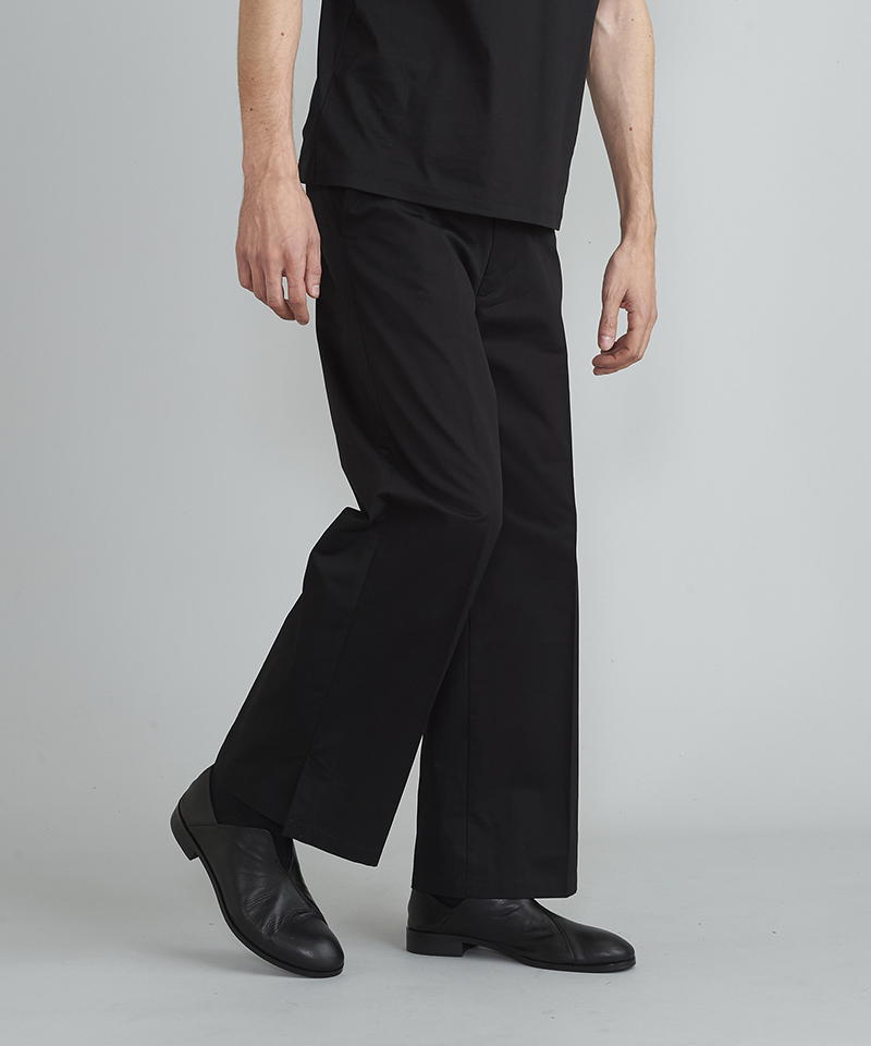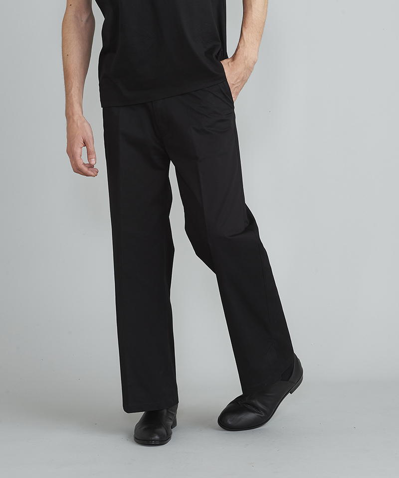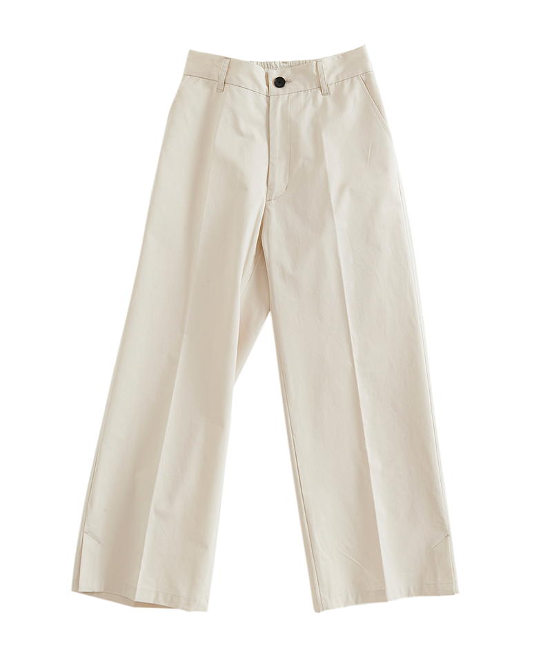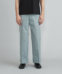 自然な光沢と目の詰まった張りのあるタフな印象のチノクロスを使用したワイドパンツ。