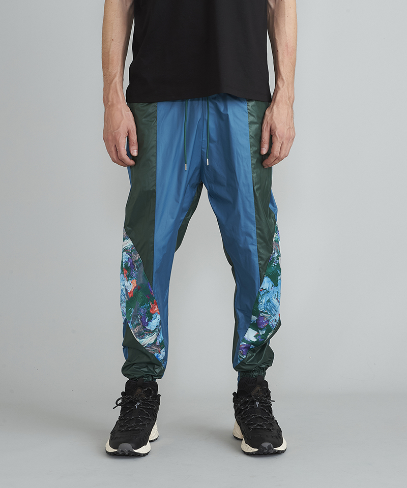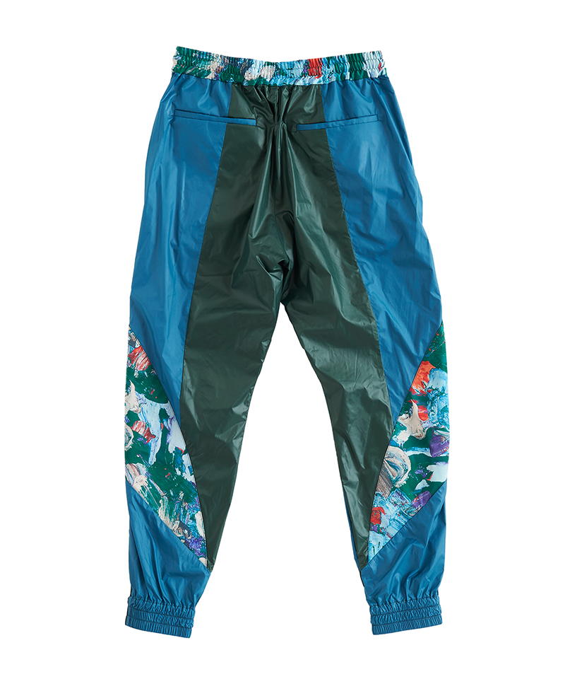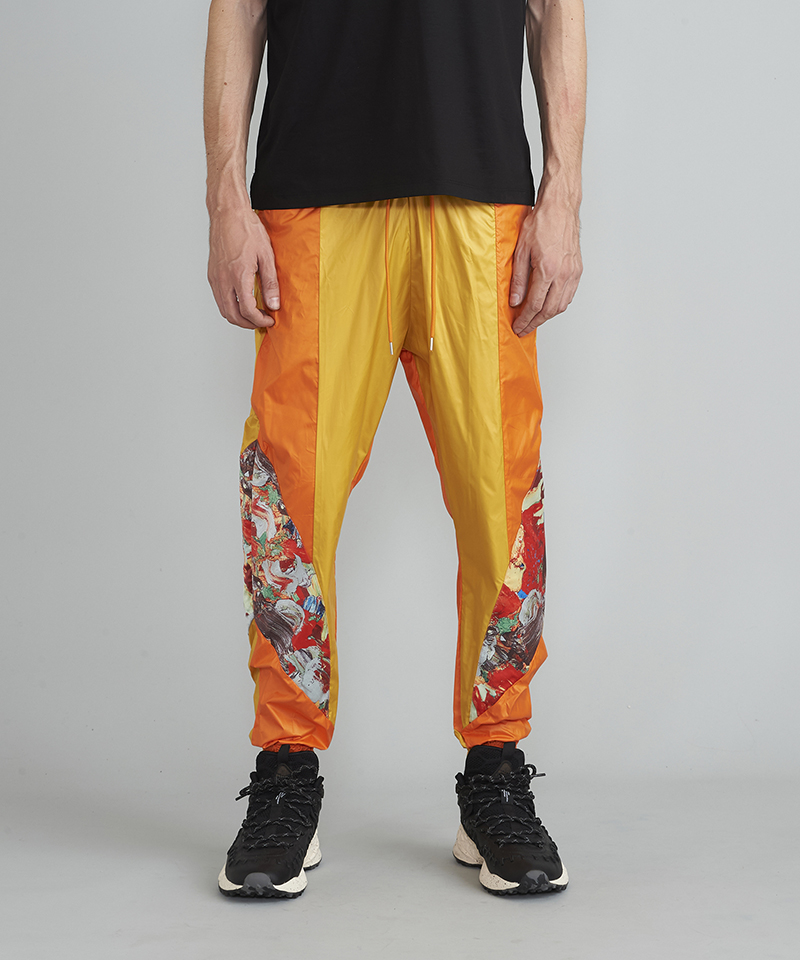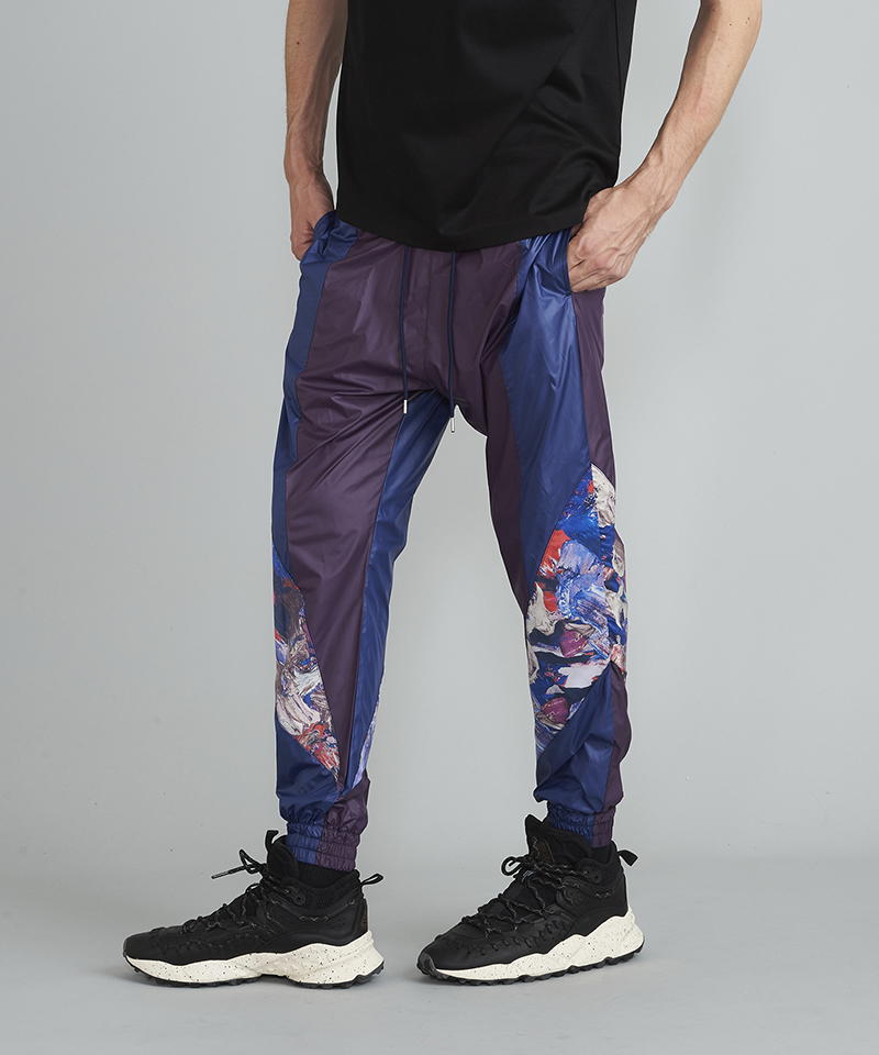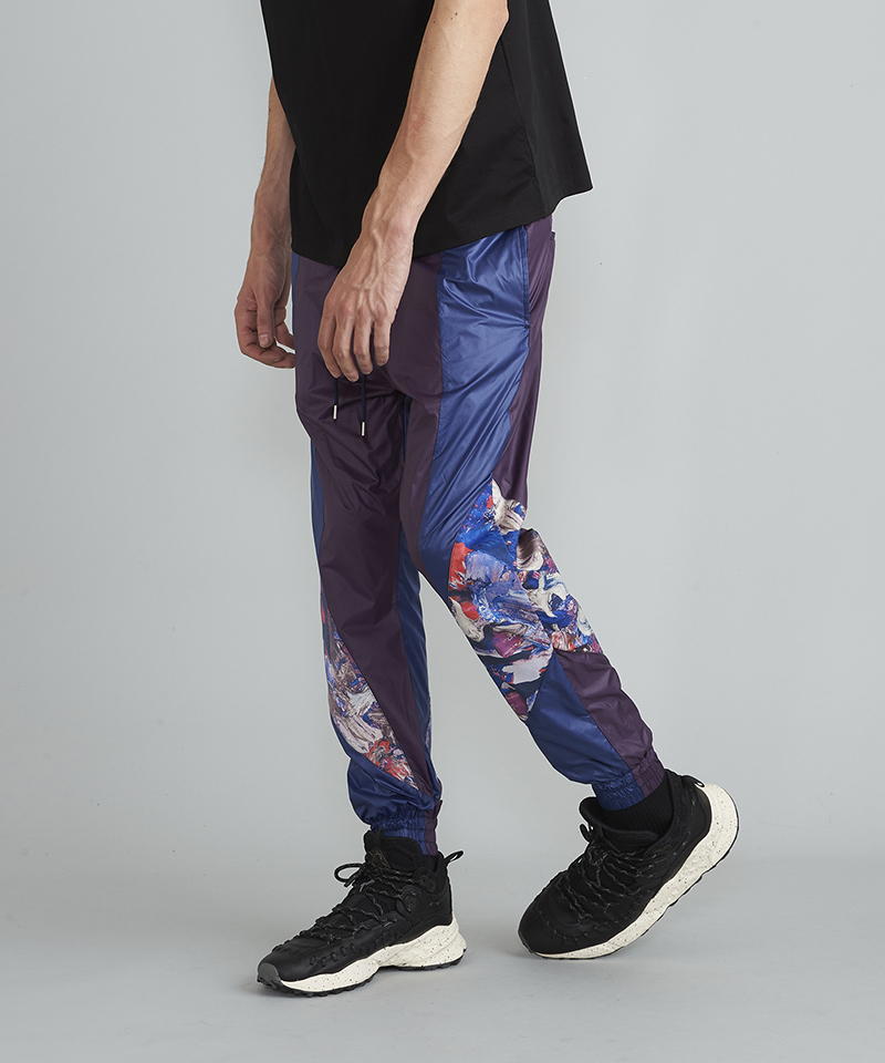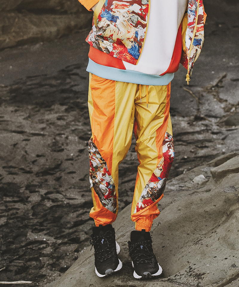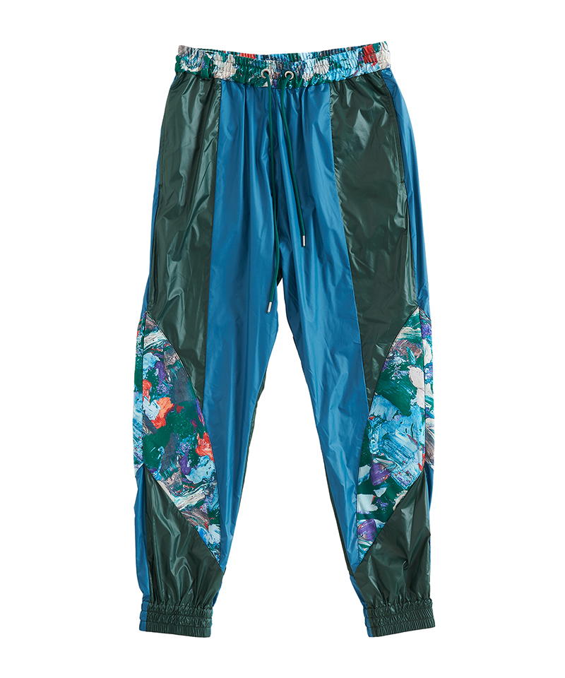 ストリートライクな配色にカラフルなアブストラクトアートモチーフの総柄切替を加えたデザインが特徴のトラックパンツ。