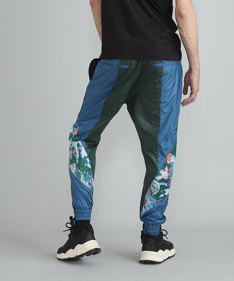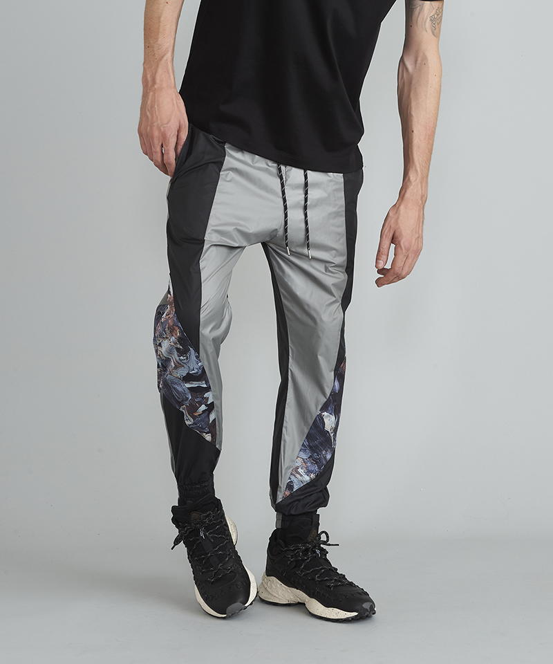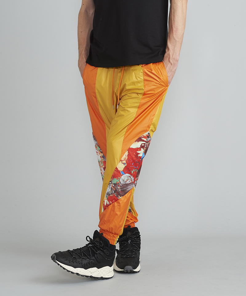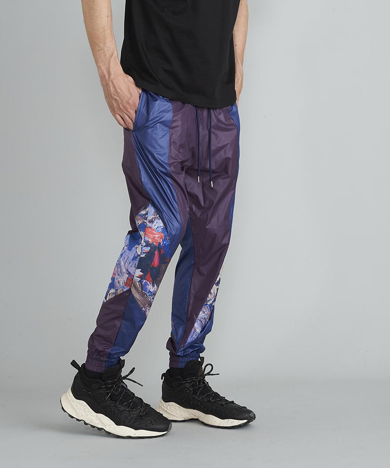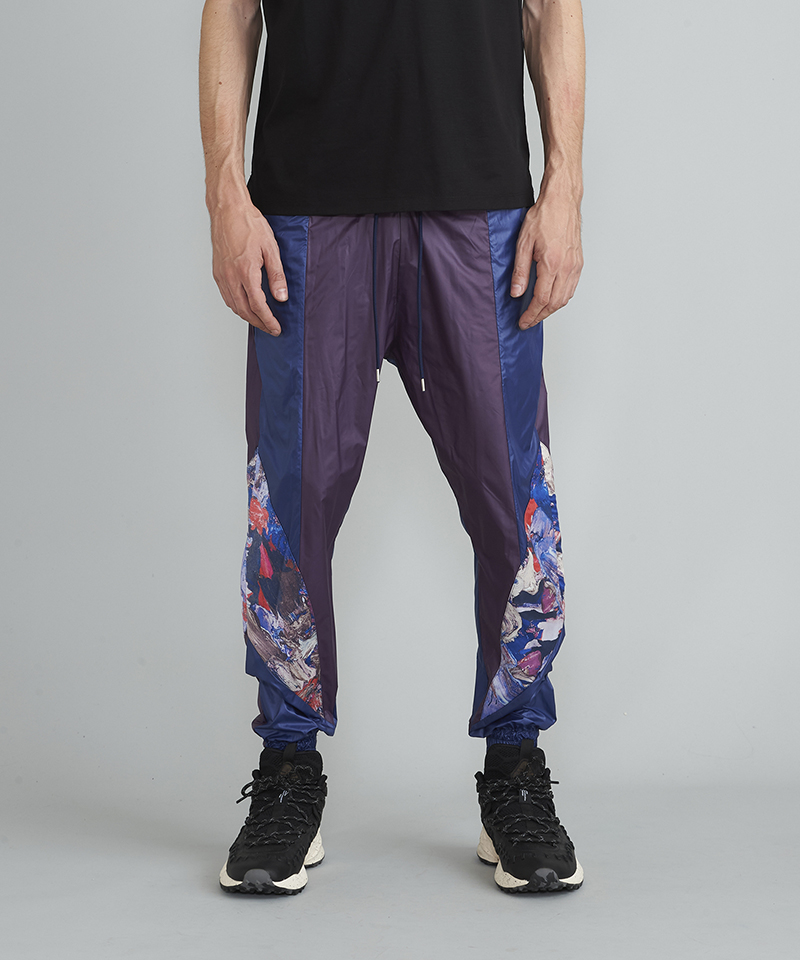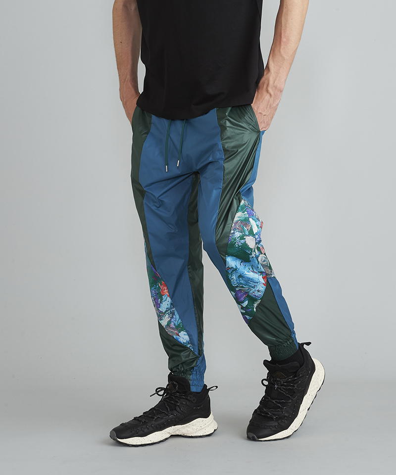 ストリートライクな配色にカラフルなアブストラクトアートモチーフの総柄切替を加えたデザインが特徴のトラックパンツ。