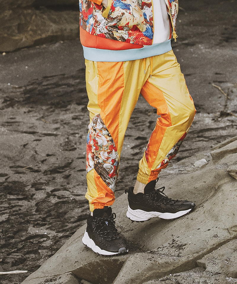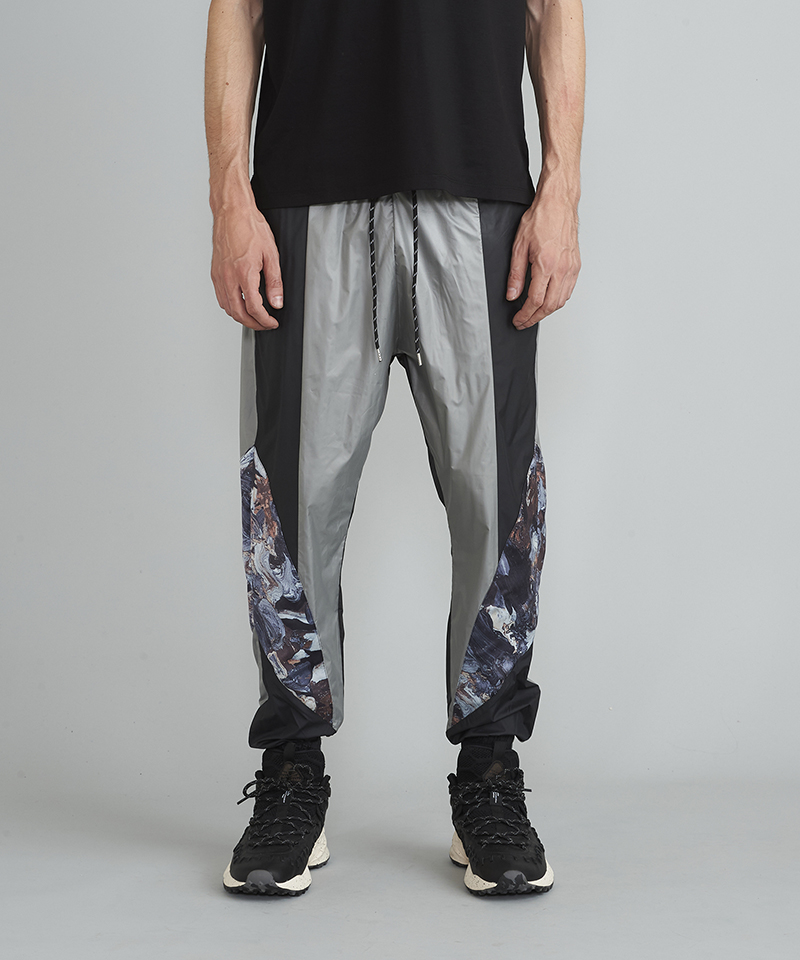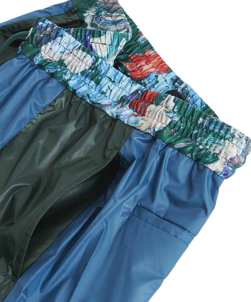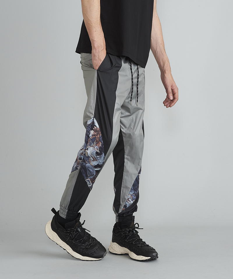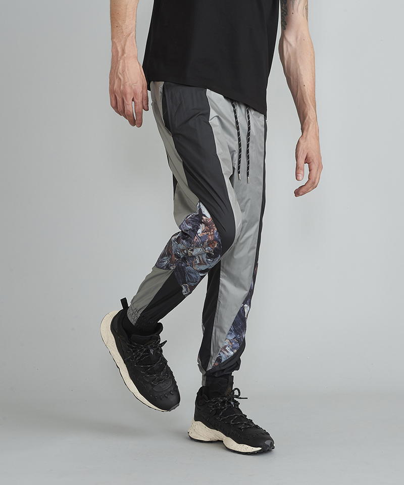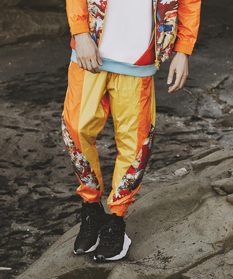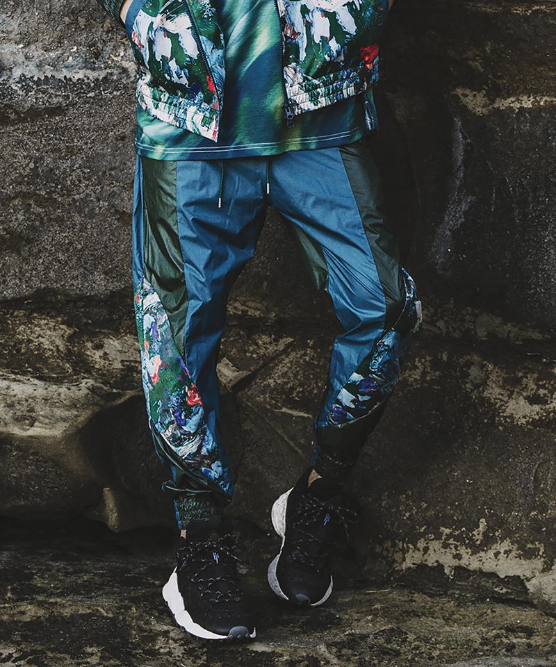 ストリートライクな配色にカラフルなアブストラクトアートモチーフの総柄切替を加えたデザインが特徴のトラックパンツ。