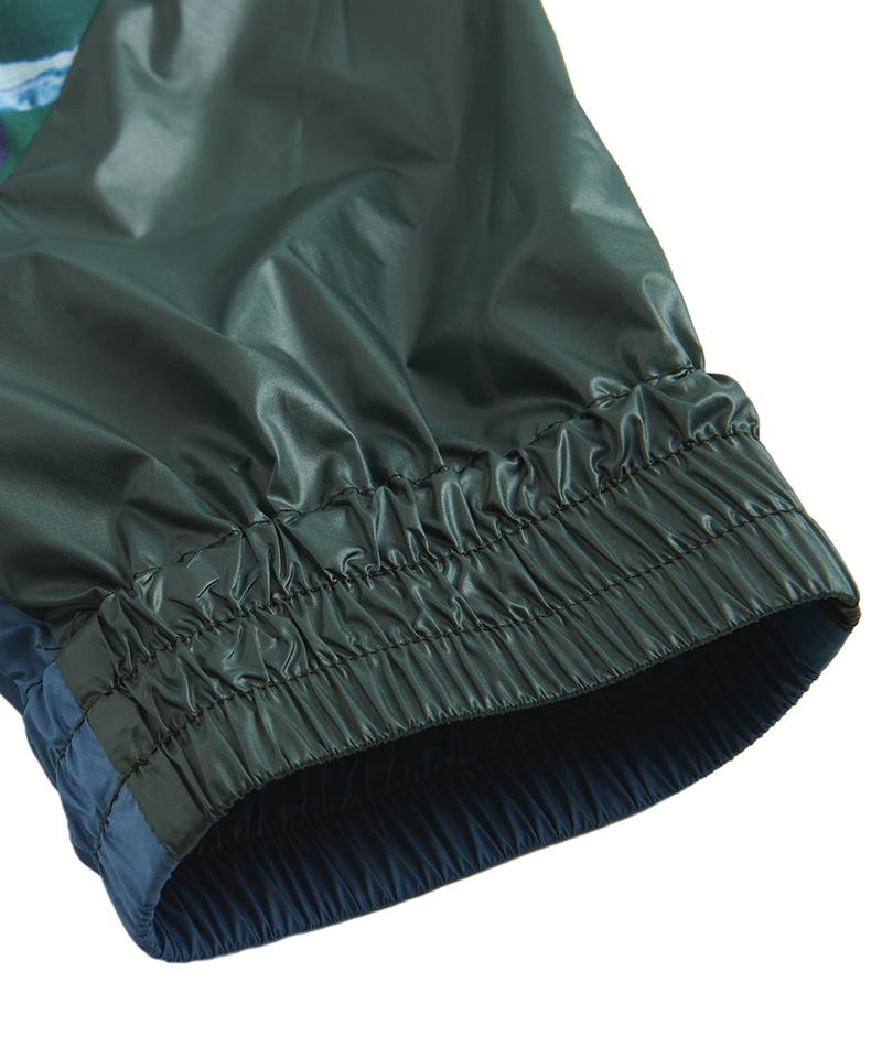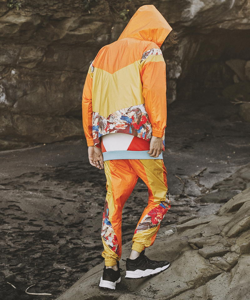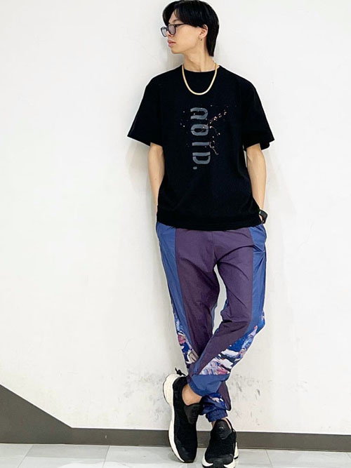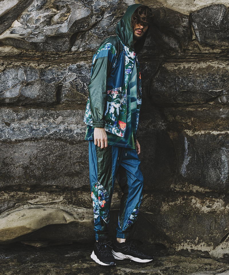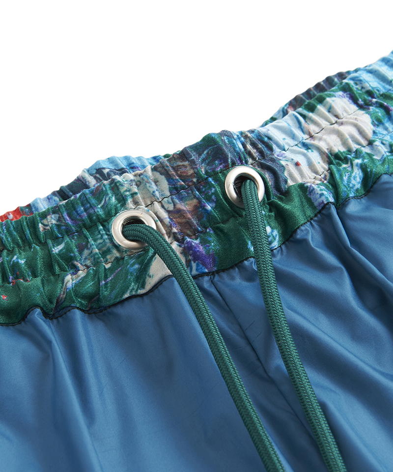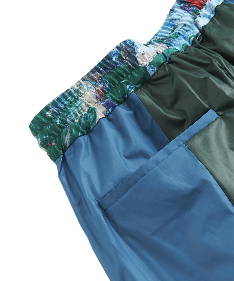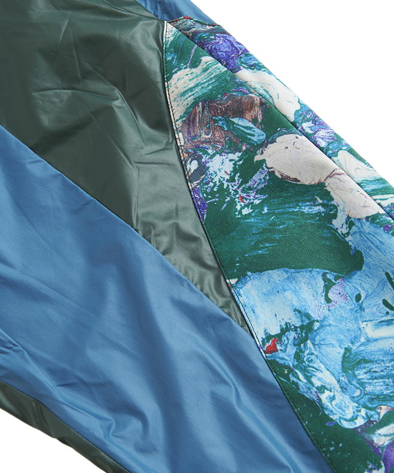 ストリートライクな配色にカラフルなアブストラクトアートモチーフの総柄切替を加えたデザインが特徴のトラックパンツ。