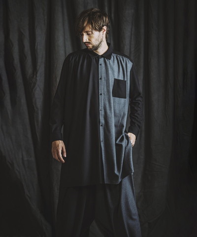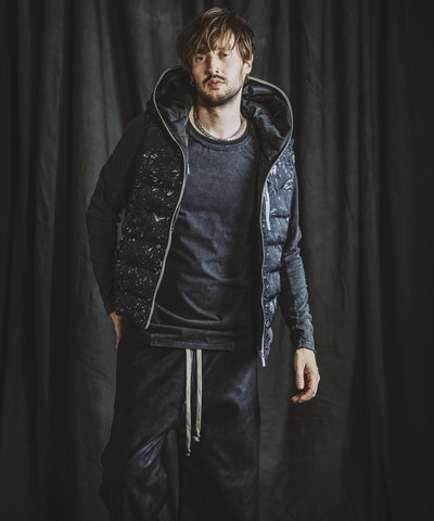 身頃上部にはあえてプリントをせず余白を作ることで周囲に何もない真っ新な空間を表現し、無機質な虚構の世界観を演出。