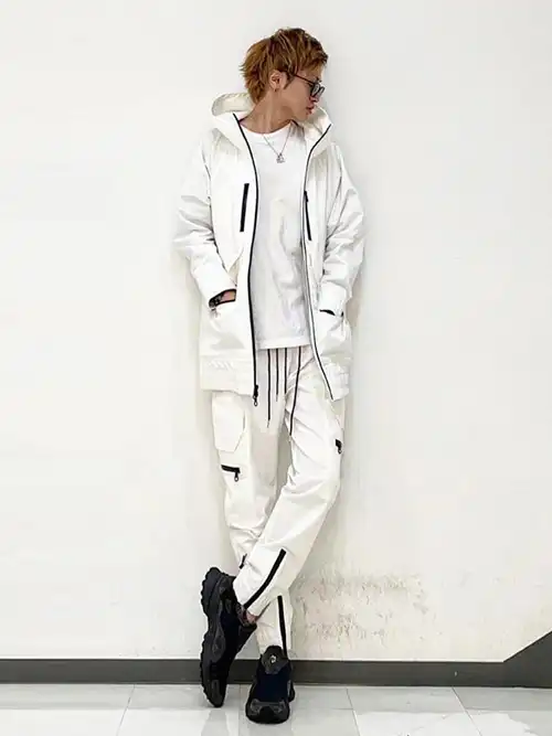 同生地のマルチポケットジョガーPTとセットアップでストリートなコーディネートを楽しめる一着