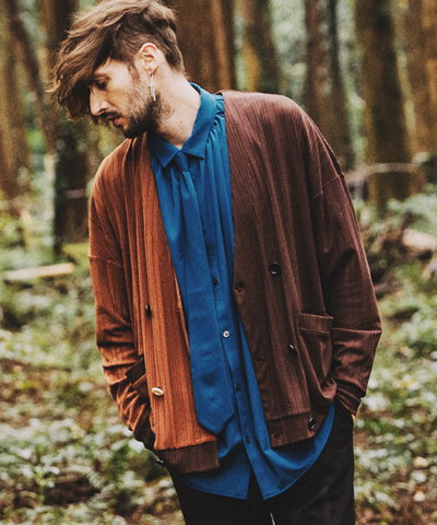 各パーツ別に三種類の編地を使い分け、変則的な編み立てを施したカーディガン感覚の裏地付きのニットコート。