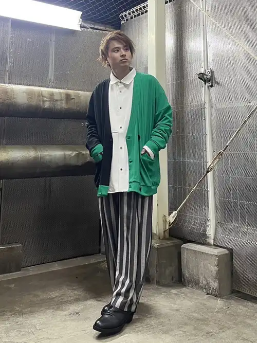 不規則なピッチで表現されたランダムテレコ生地を使用したビッグシルエットのカーディガン。