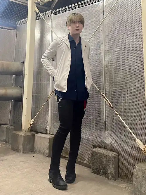 フロントに施したピンタックと比翼仕立ての前立てに1つだけ釦を表に出してアクセントをプラスしている。