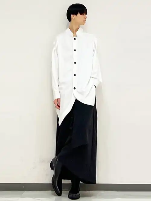 前後にボタンを付け好きな向きで着用可能な大胆な2way仕様のロングシャツ。
