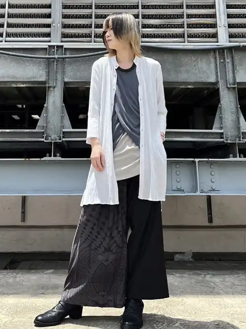 Tシャツは重なりのあるフェイクレイヤードな前身頃、シャツの様なラウンドシルエットが特徴の後ろ見頃。