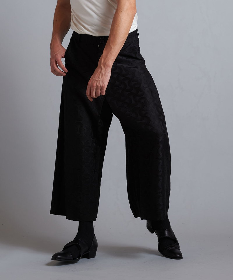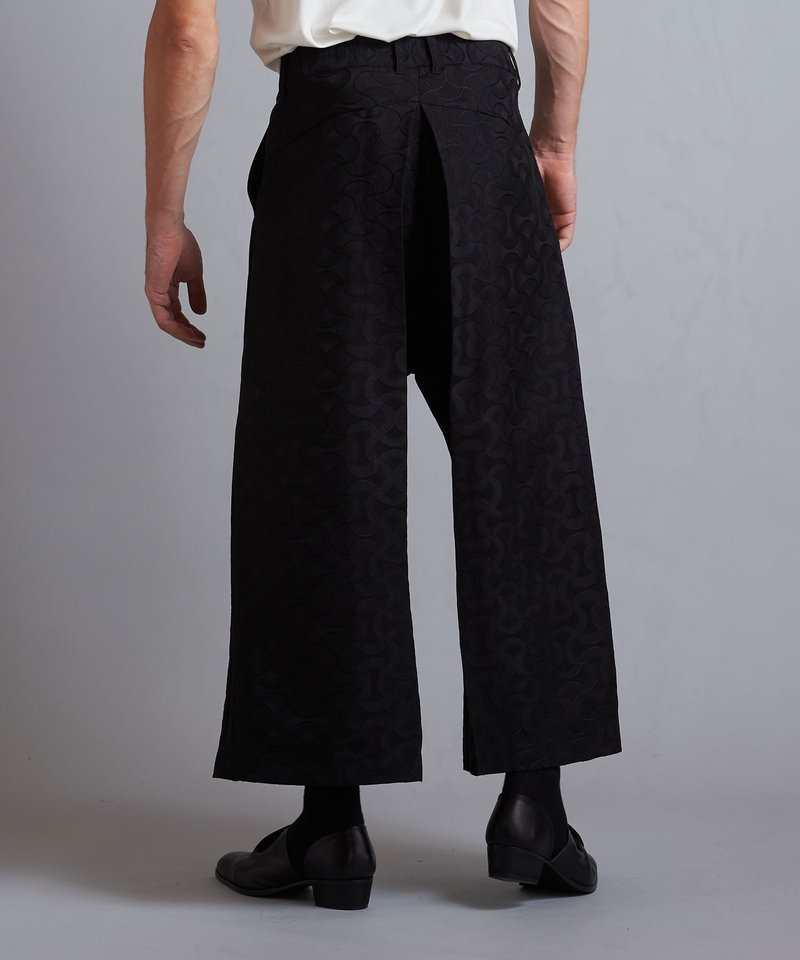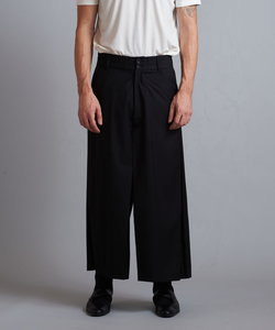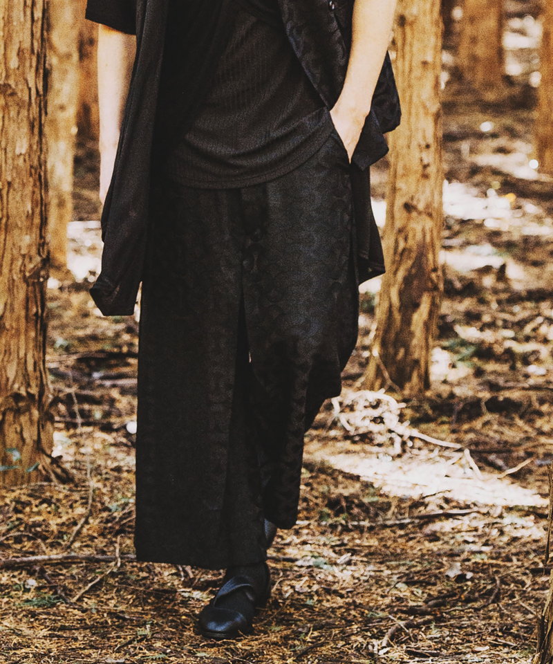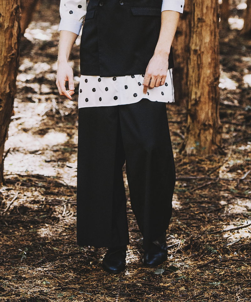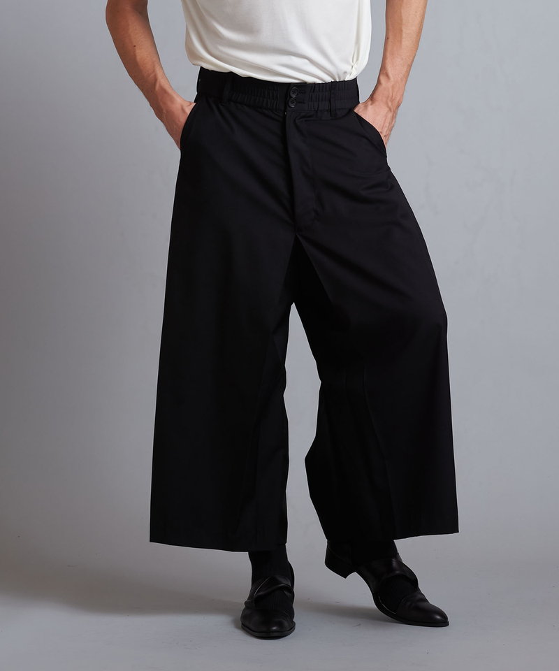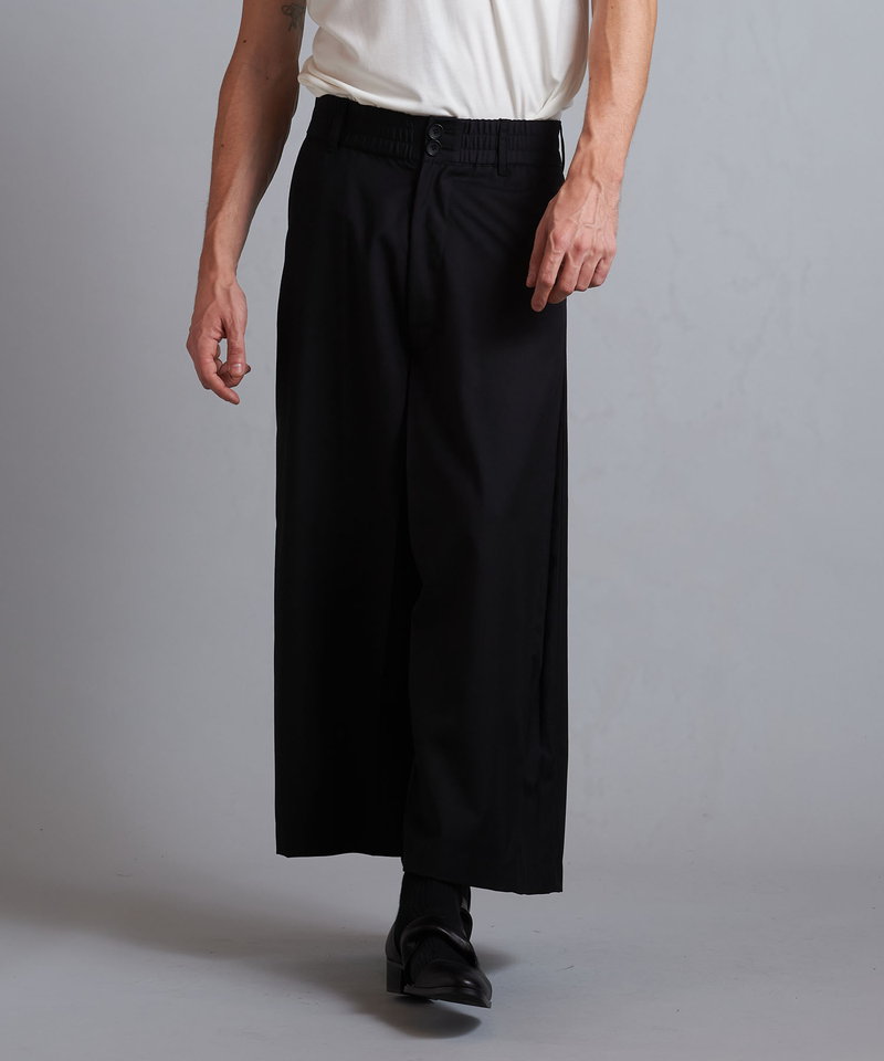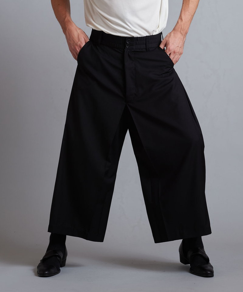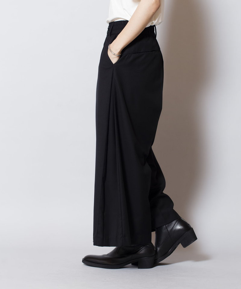軽快な履き心地のバギーシルエットをベースにアウトシームとインシームにタックを施し奥行きのある立体的なシルエットを表現している。