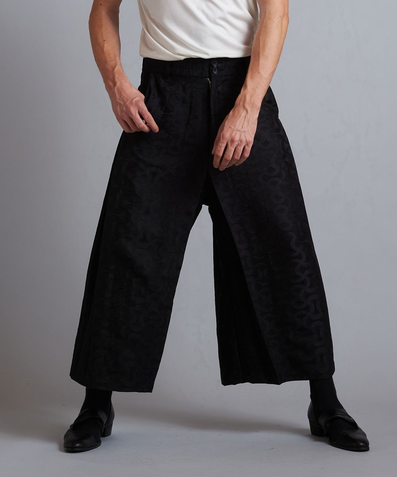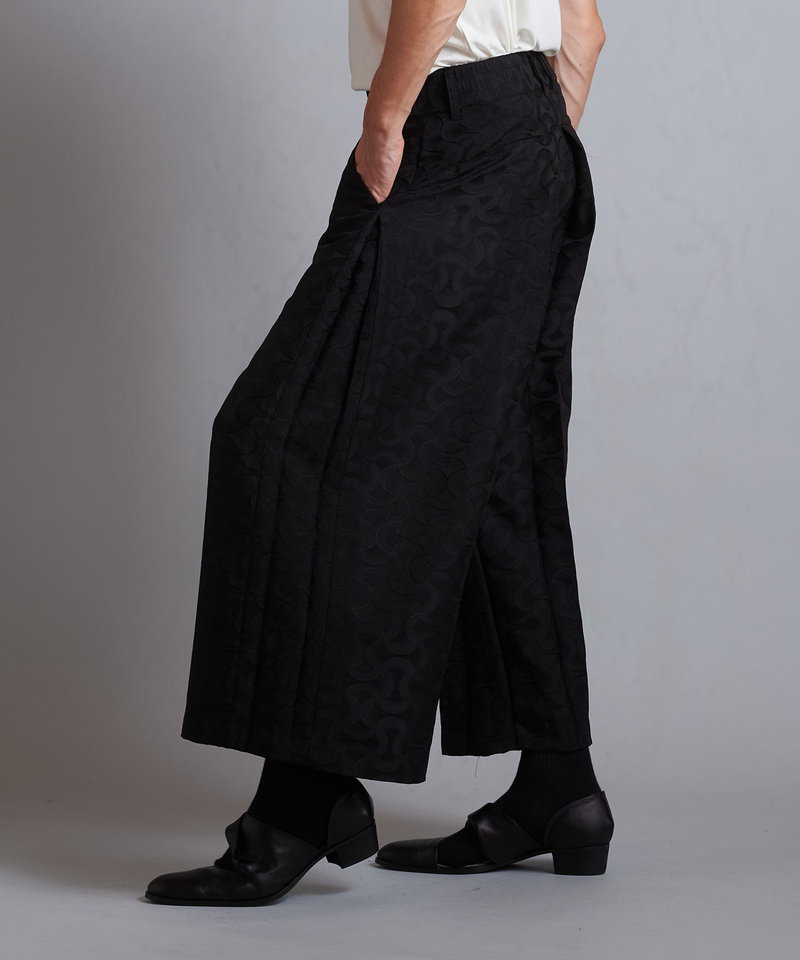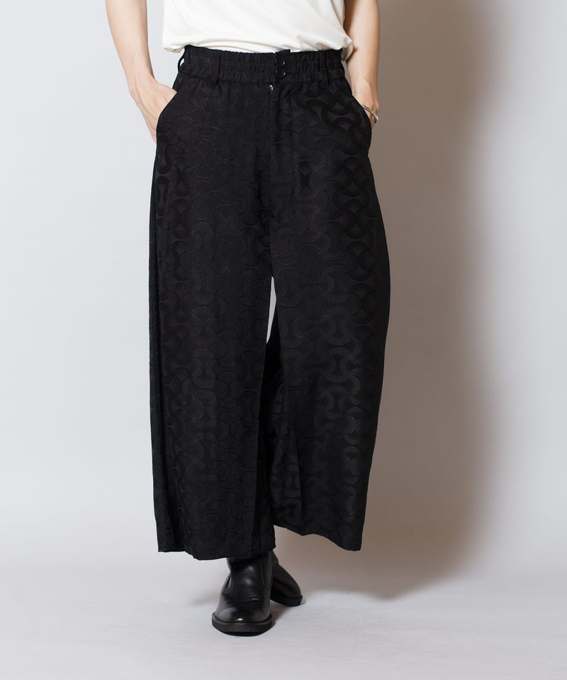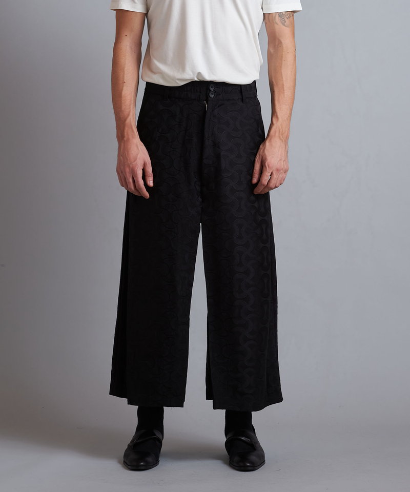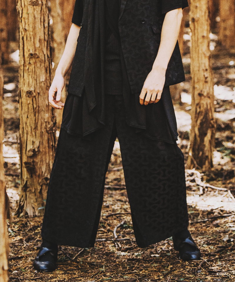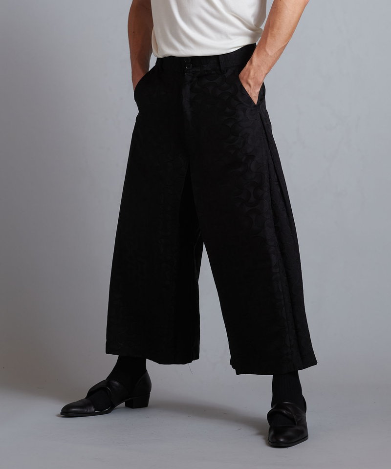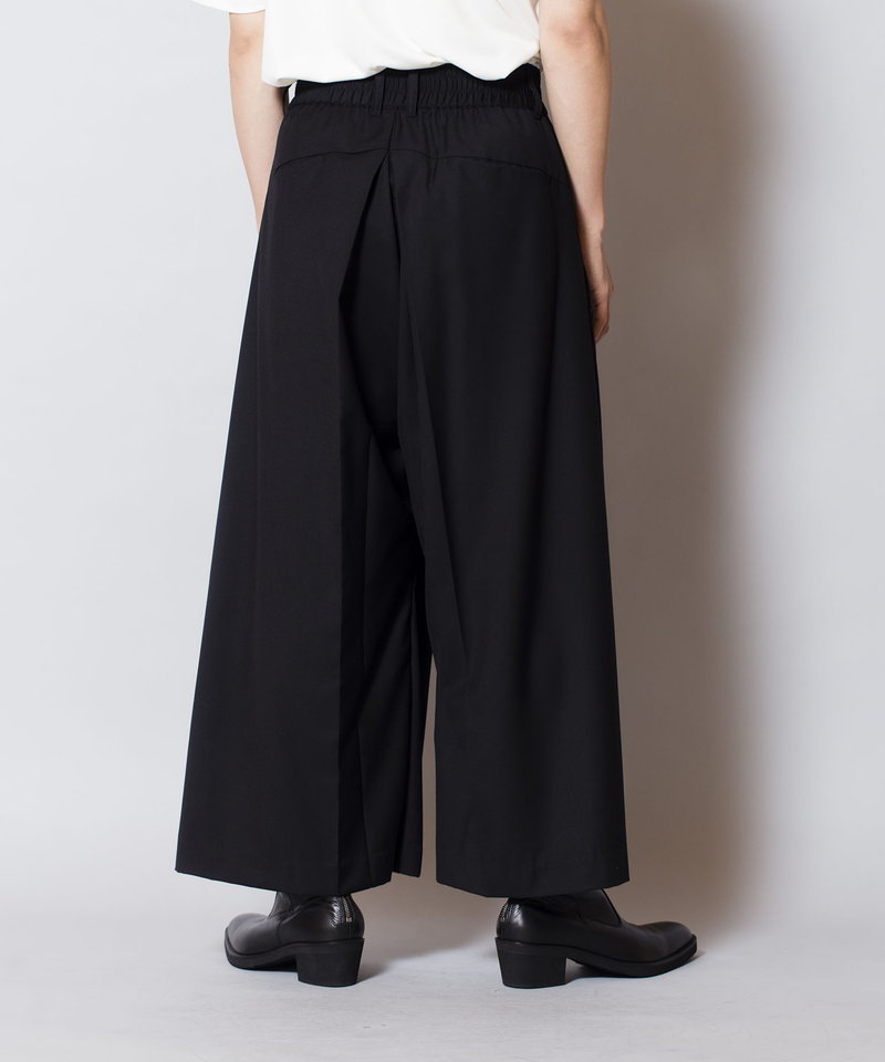 軽快な履き心地のバギーシルエットをベースにアウトシームとインシームにタックを施し奥行きのある立体的なシルエットを表現している。