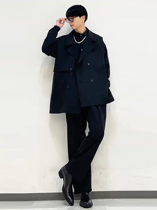 デザインには汎用性の高いトレンチコートを取り入れており肩から裾にかけて末広がりなAラインのシルエットを描き窮屈感を与えないリラックスムードを高めたパターンになっている。