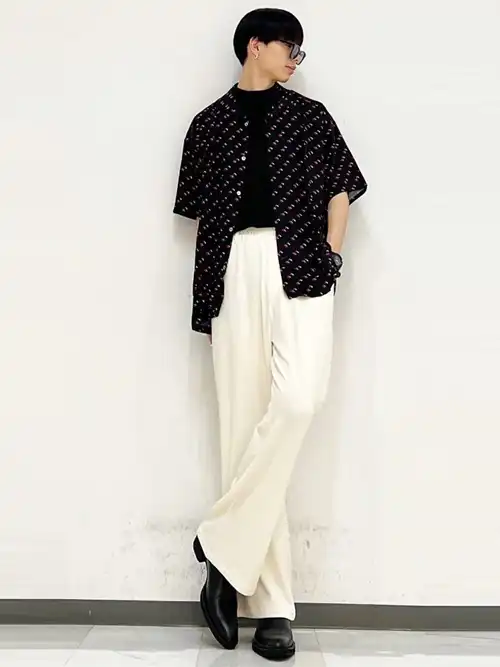 季節感のあるチェリーを総柄に落とし込んだグラフィカルなオープンカラーシャツ。