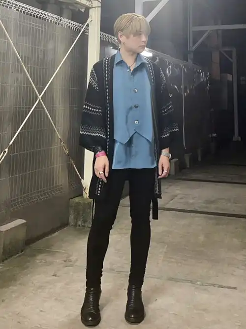 同生地のシャツとベストにより統一感のあるレイヤードスタイルが一枚で楽しめる趣向を凝らしたアイテムとなっている。