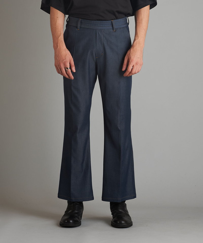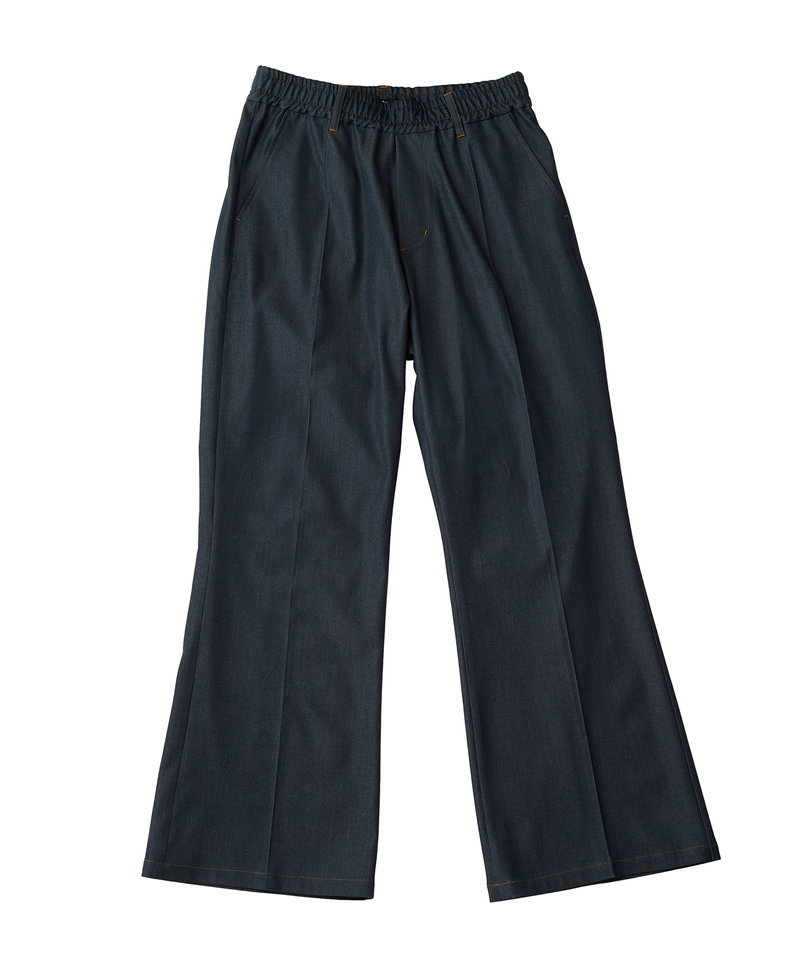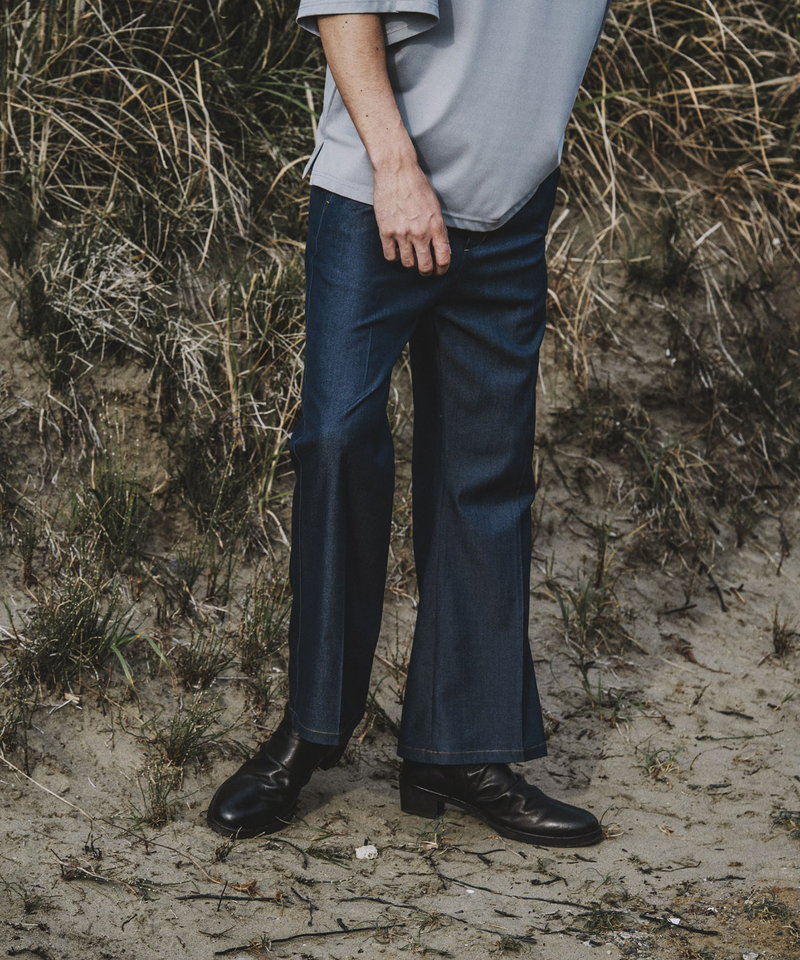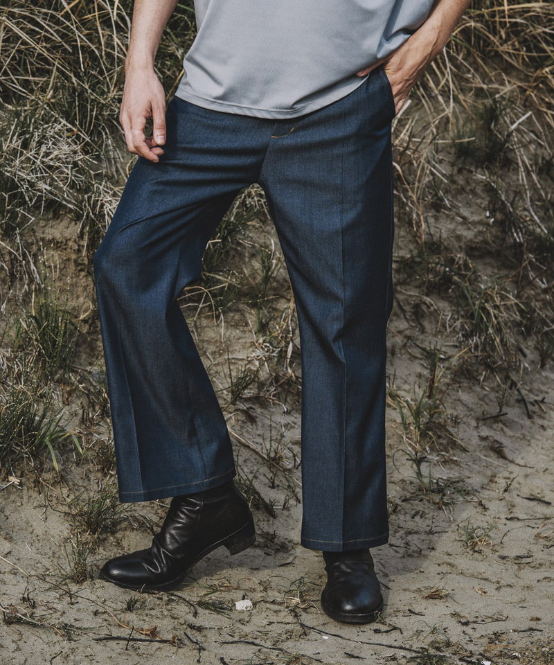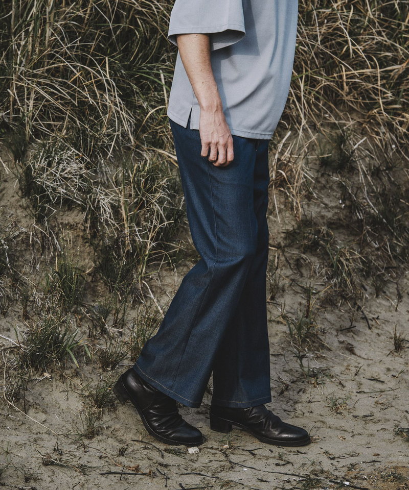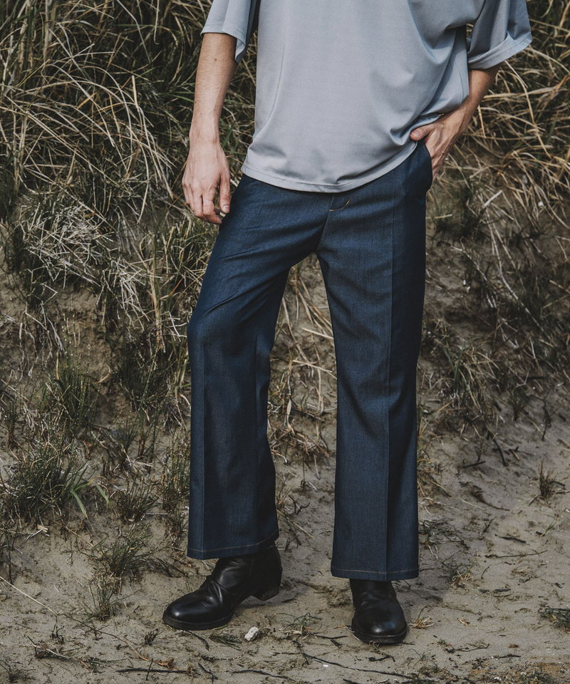 人気のワイドレッグシルエットを採用し、程よい太さから膝のラインを細くして裾に向かうに連れ広がるパターンにより強調し過ぎないゆるやかなフレアシルエットを演出。