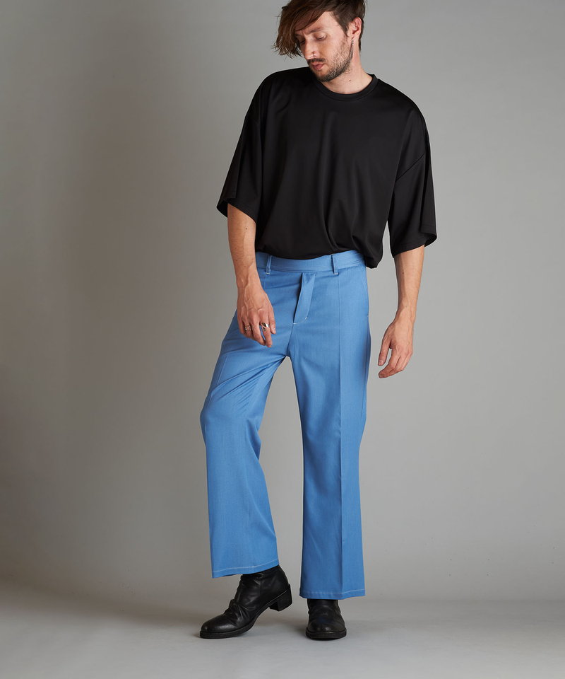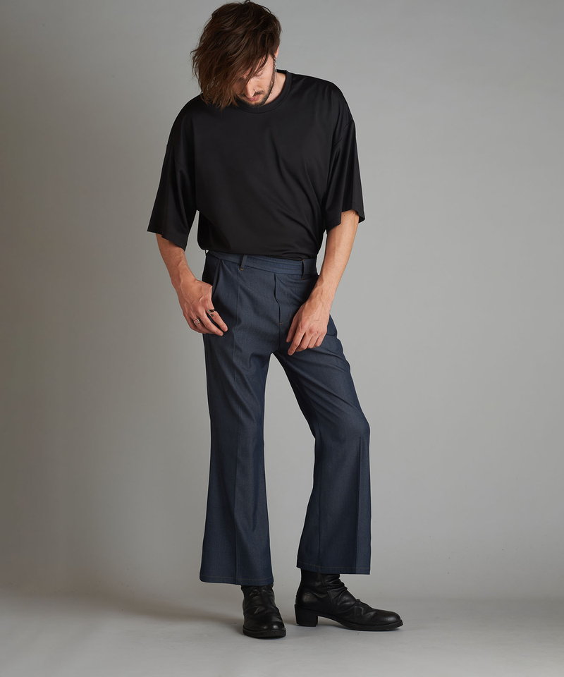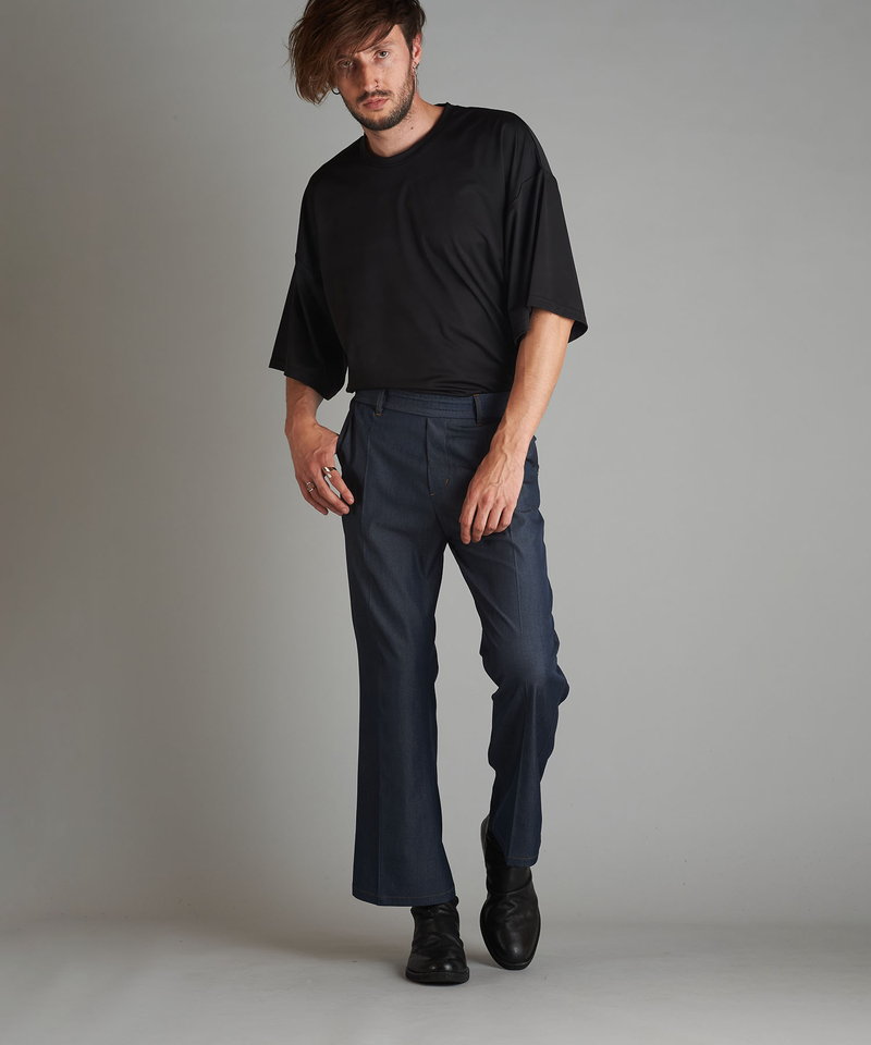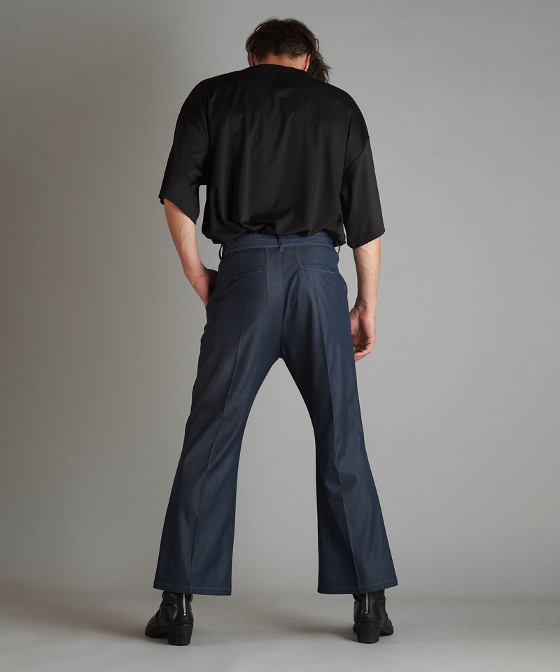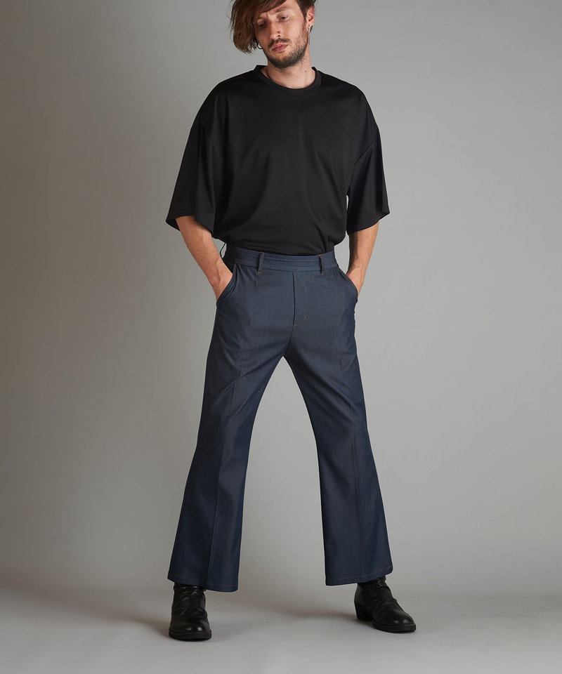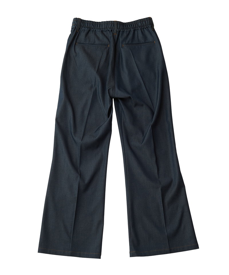 人気のワイドレッグシルエットを採用し、程よい太さから膝のラインを細くして裾に向かうに連れ広がるパターンにより強調し過ぎないゆるやかなフレアシルエットを演出。