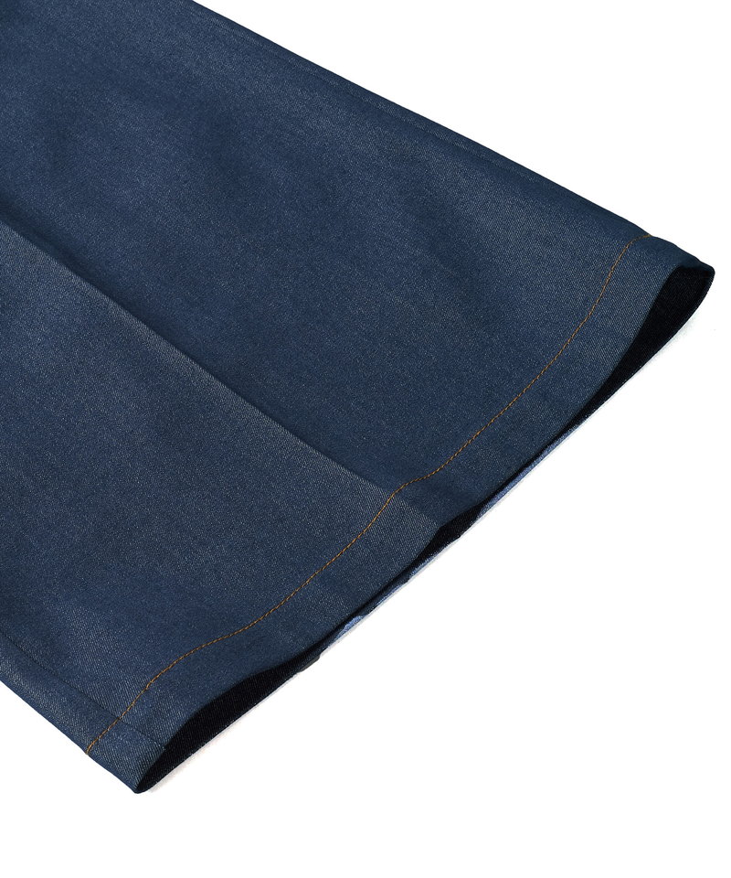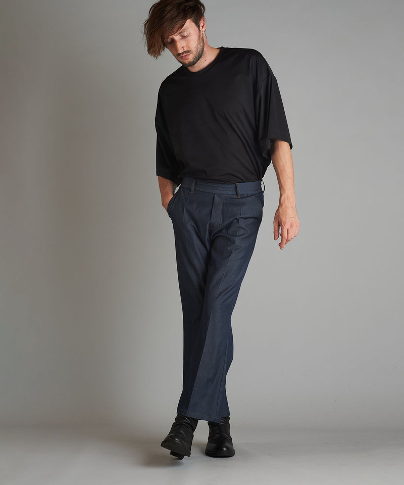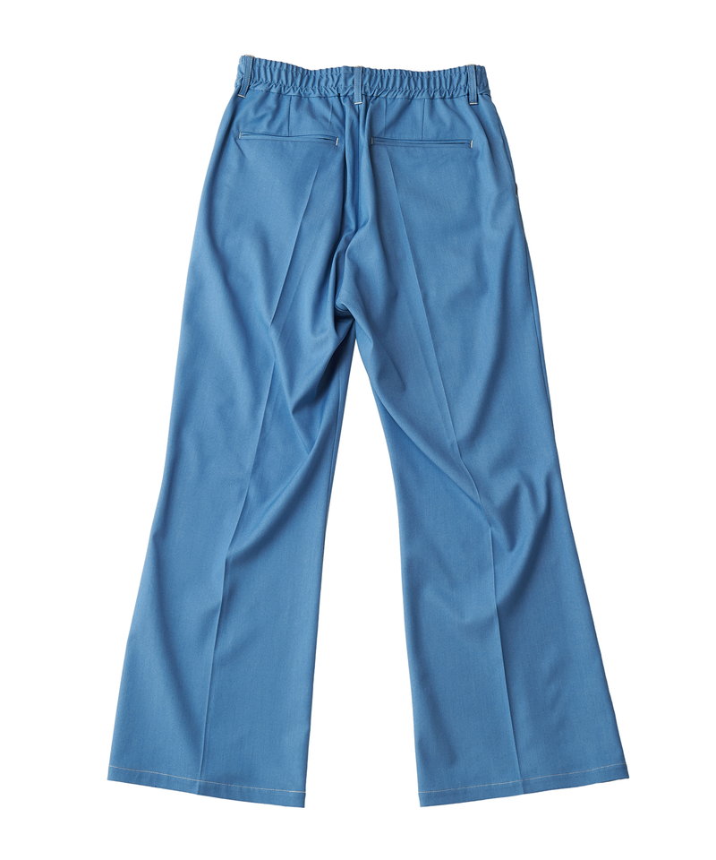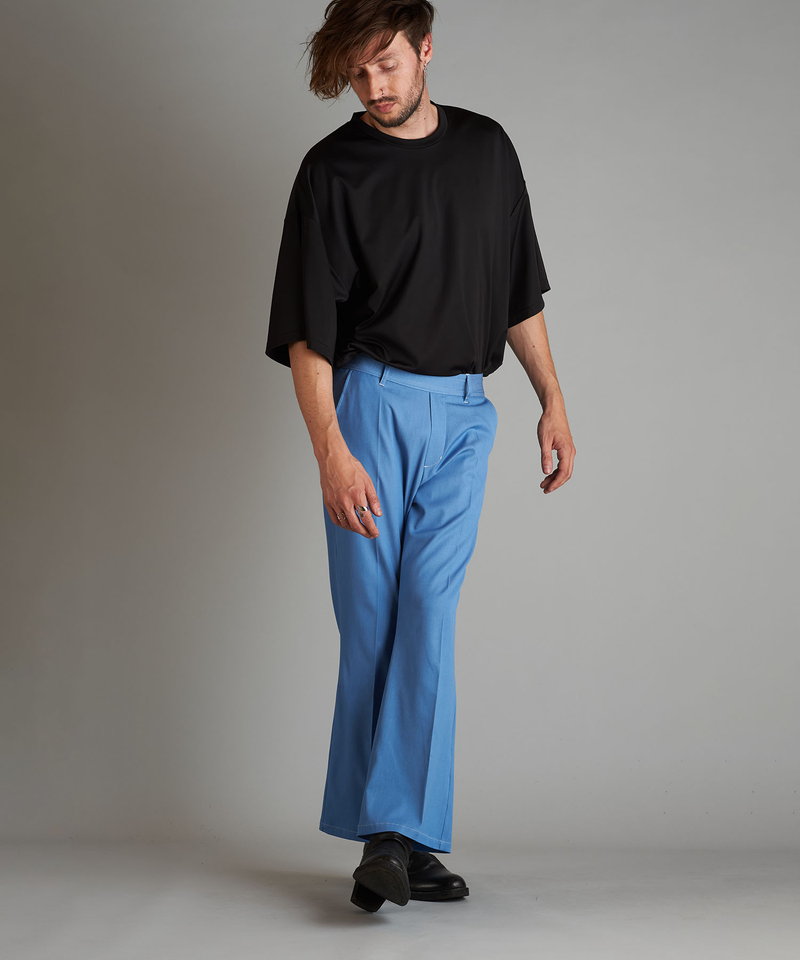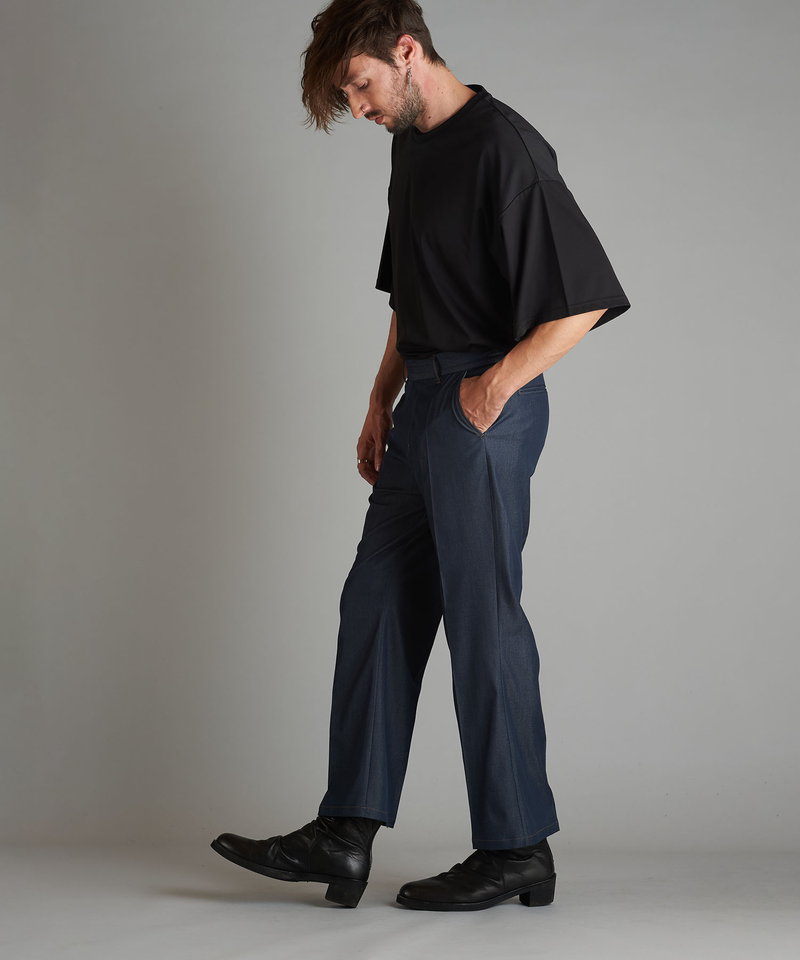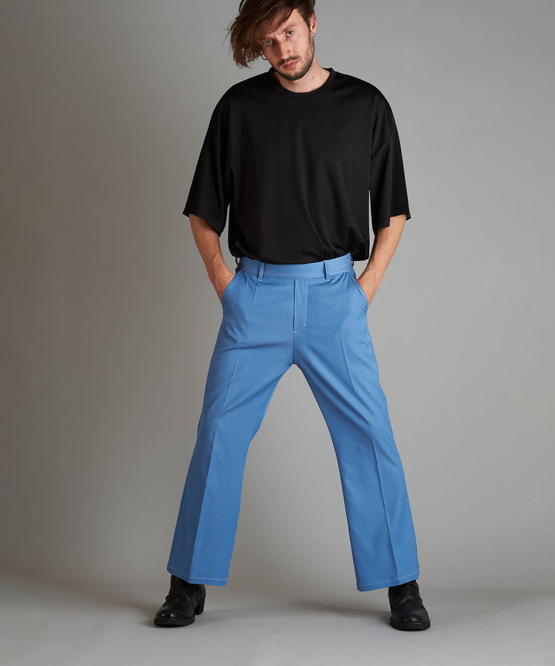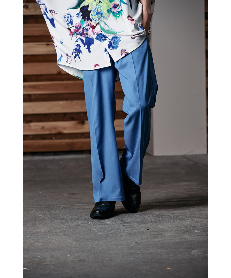 人気のワイドレッグシルエットを採用し、程よい太さから膝のラインを細くして裾に向かうに連れ広がるパターンにより強調し過ぎないゆるやかなフレアシルエットを演出。