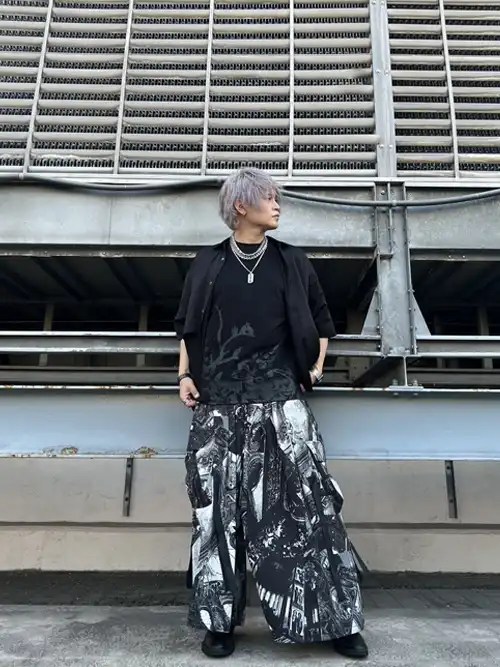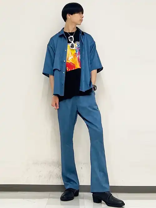 同生地のリンクルフレアパンツとセットアップで着用する事でより統一感のあるコーディネートを楽しめる。