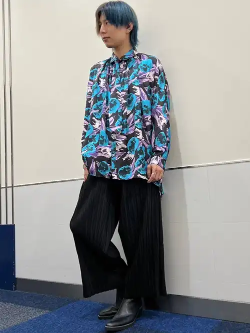 サテン生地のサラッとした着心地と柔らかいドレープを活かしたデザインは襟の付け根にギャザーを入れる事でより自然に躍動感のある表情を作り上げている。