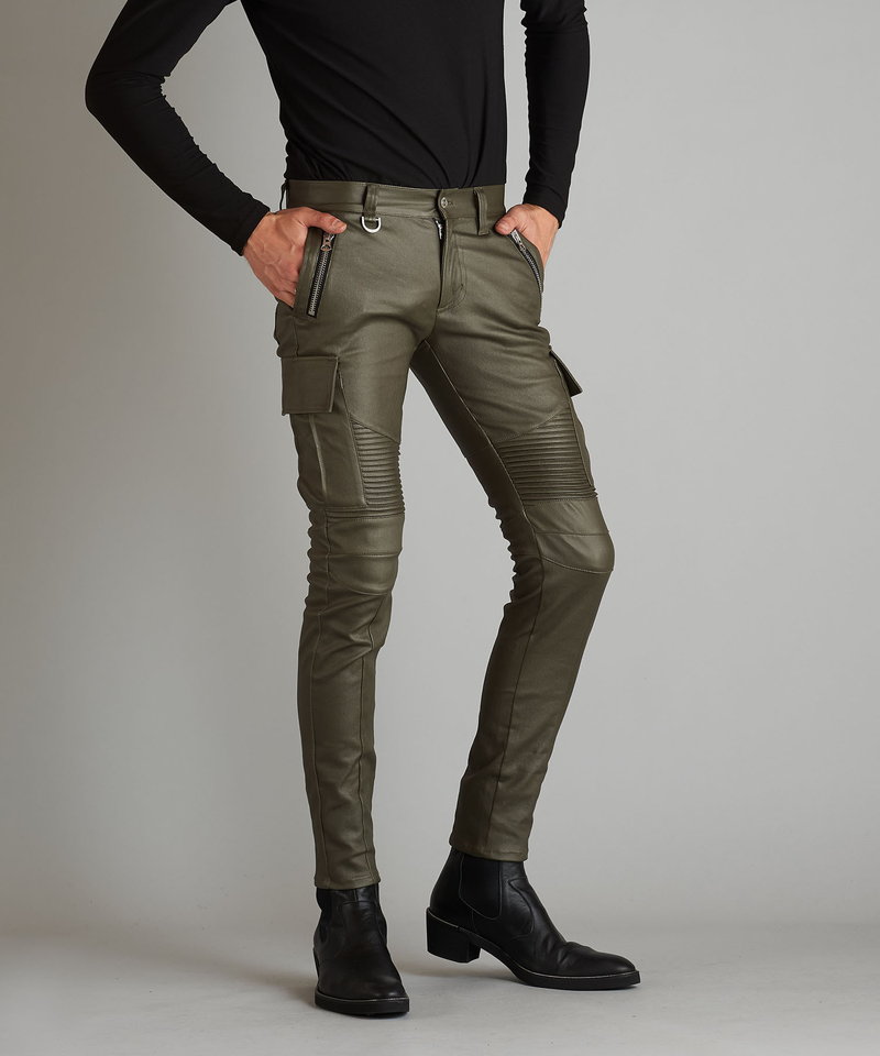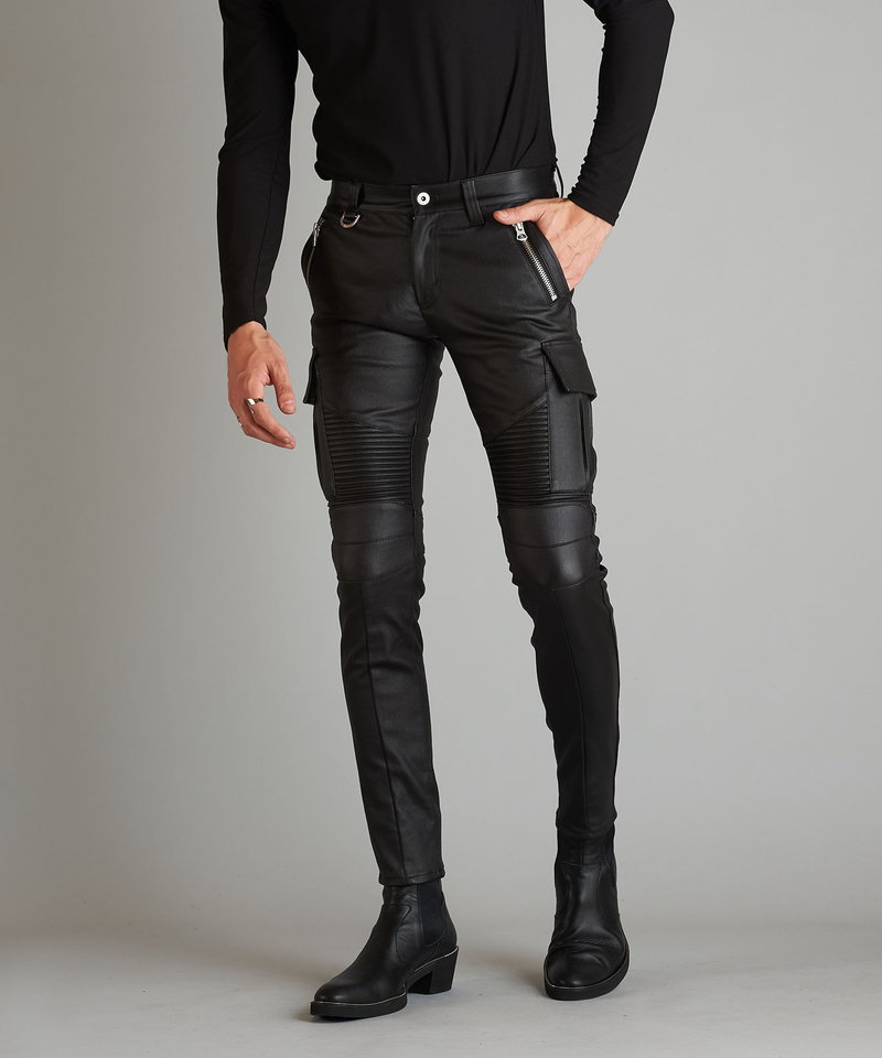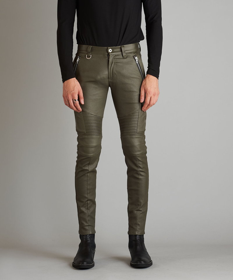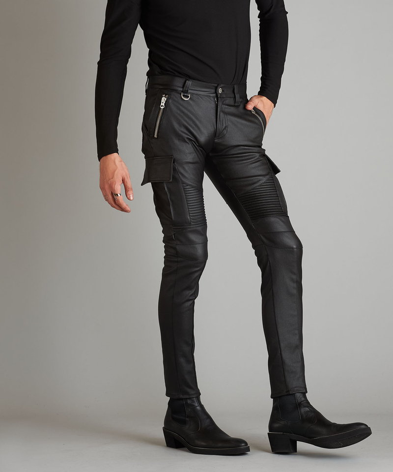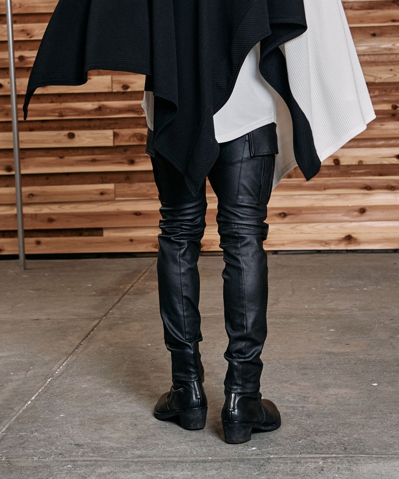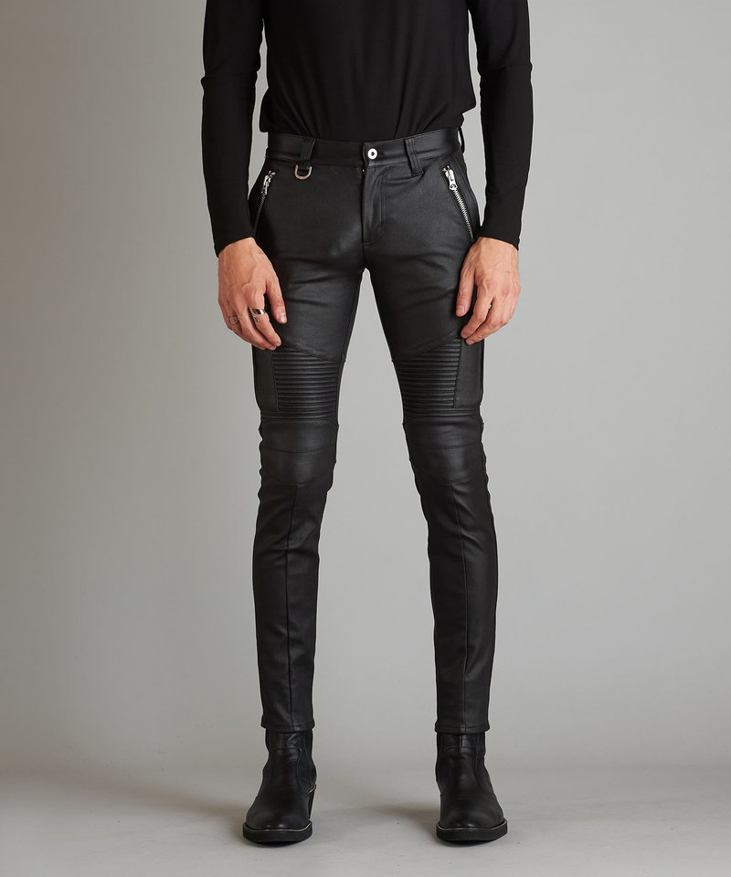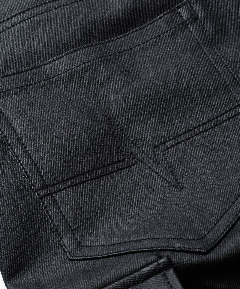 伸縮性のあるツイルストレッチ生地をベースにウレタンコーティングを施しレザーパンツの様な風合いを持たせたスキニーパンツ。