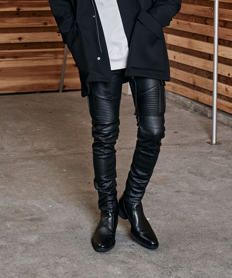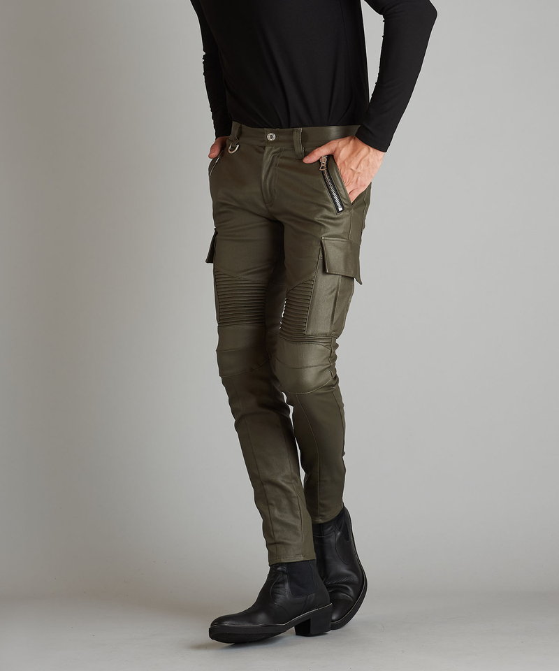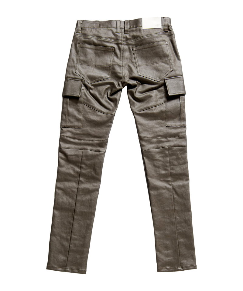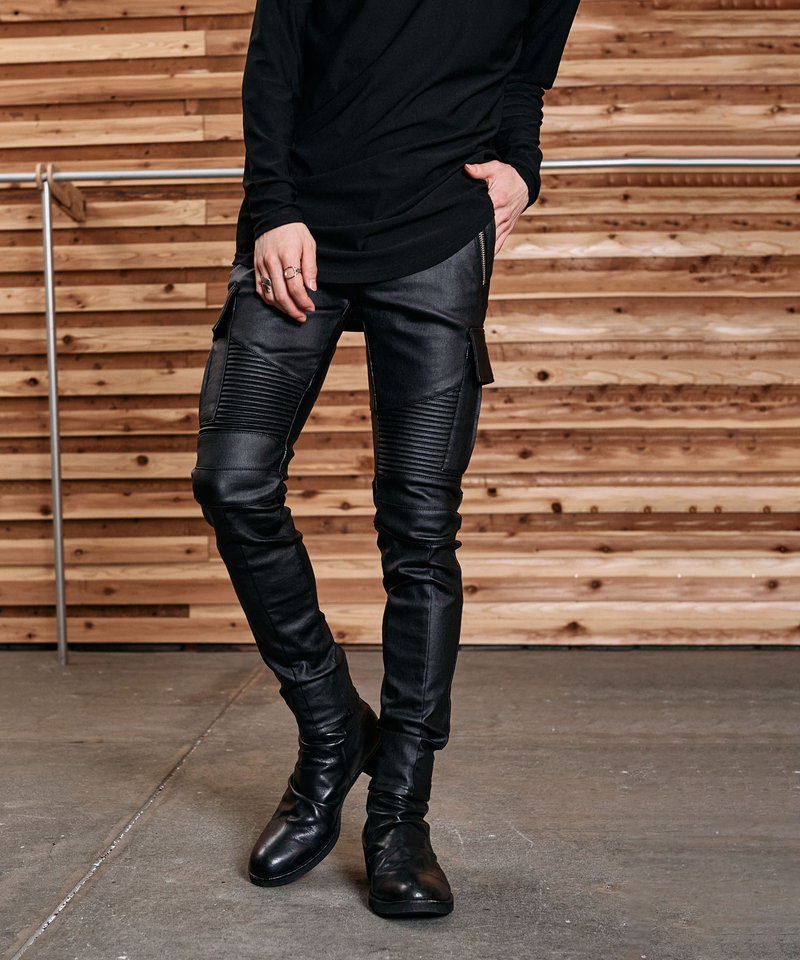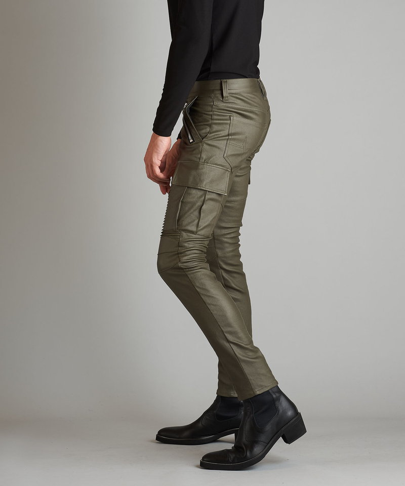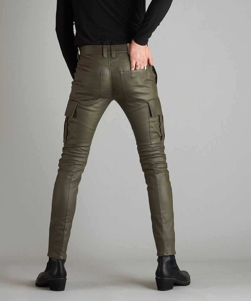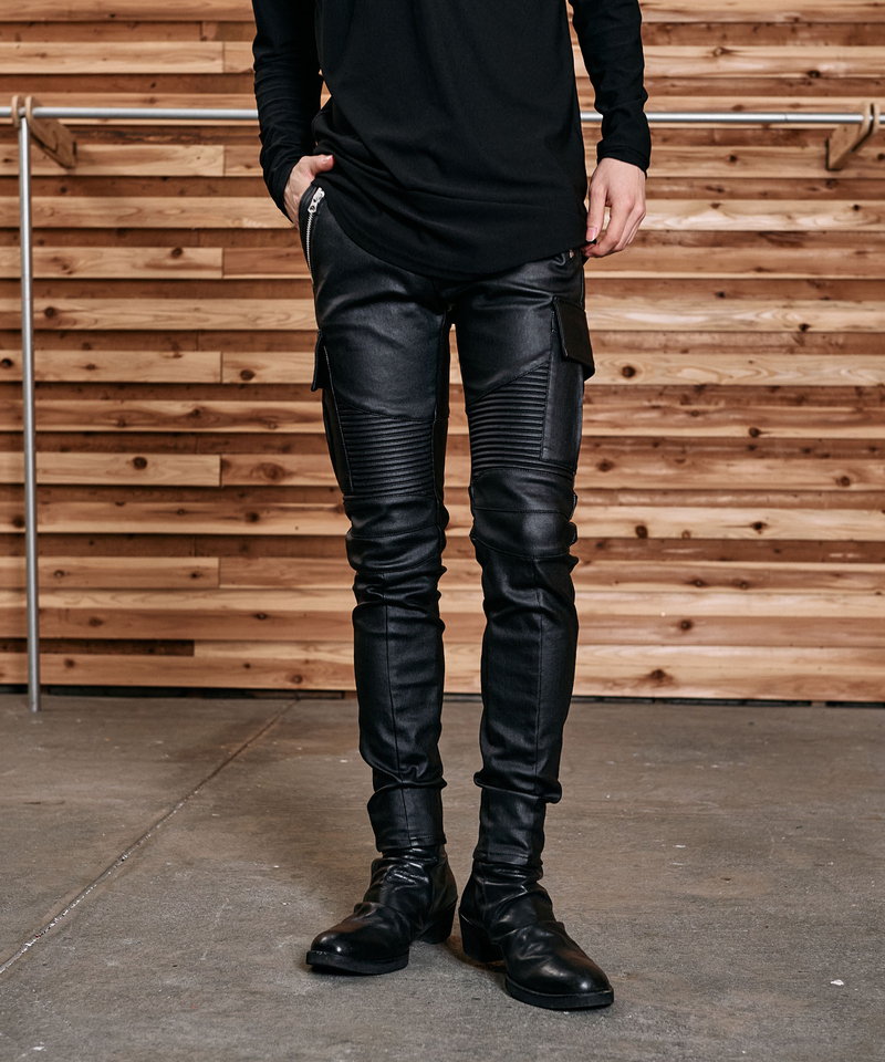 伸縮性のあるツイルストレッチ生地をベースにウレタンコーティングを施しレザーパンツの様な風合いを持たせたスキニーパンツ。