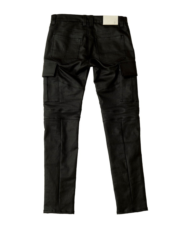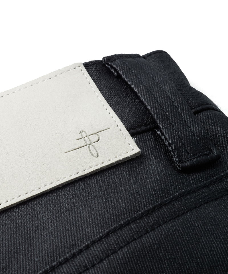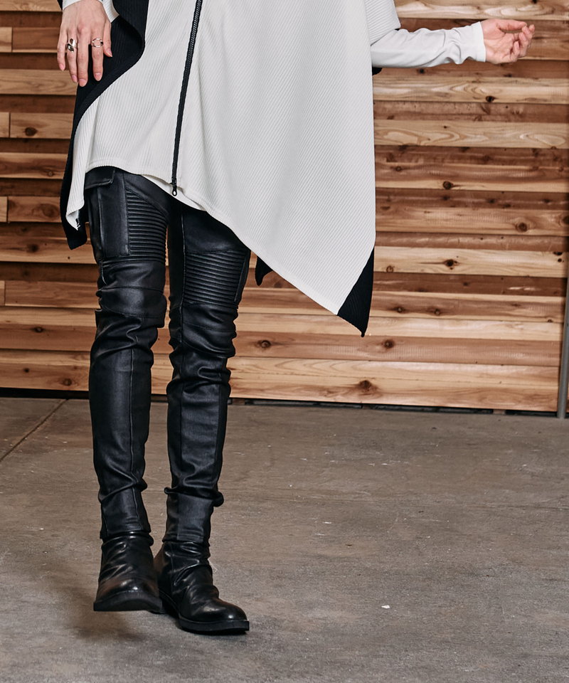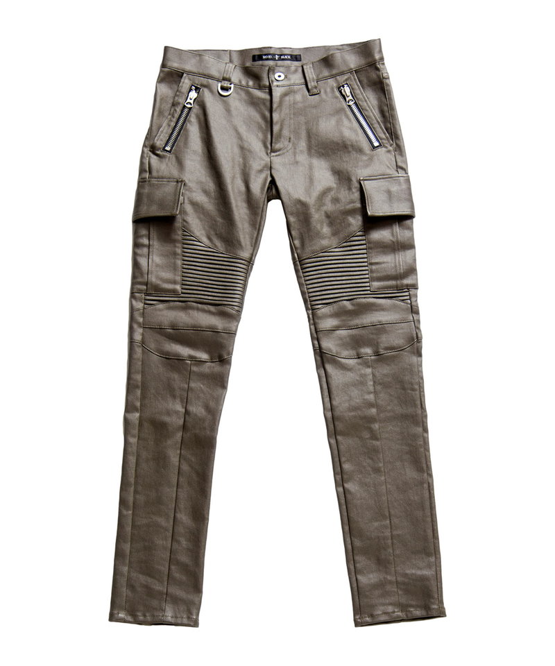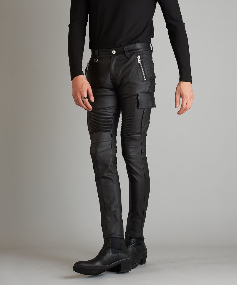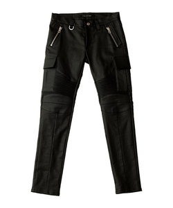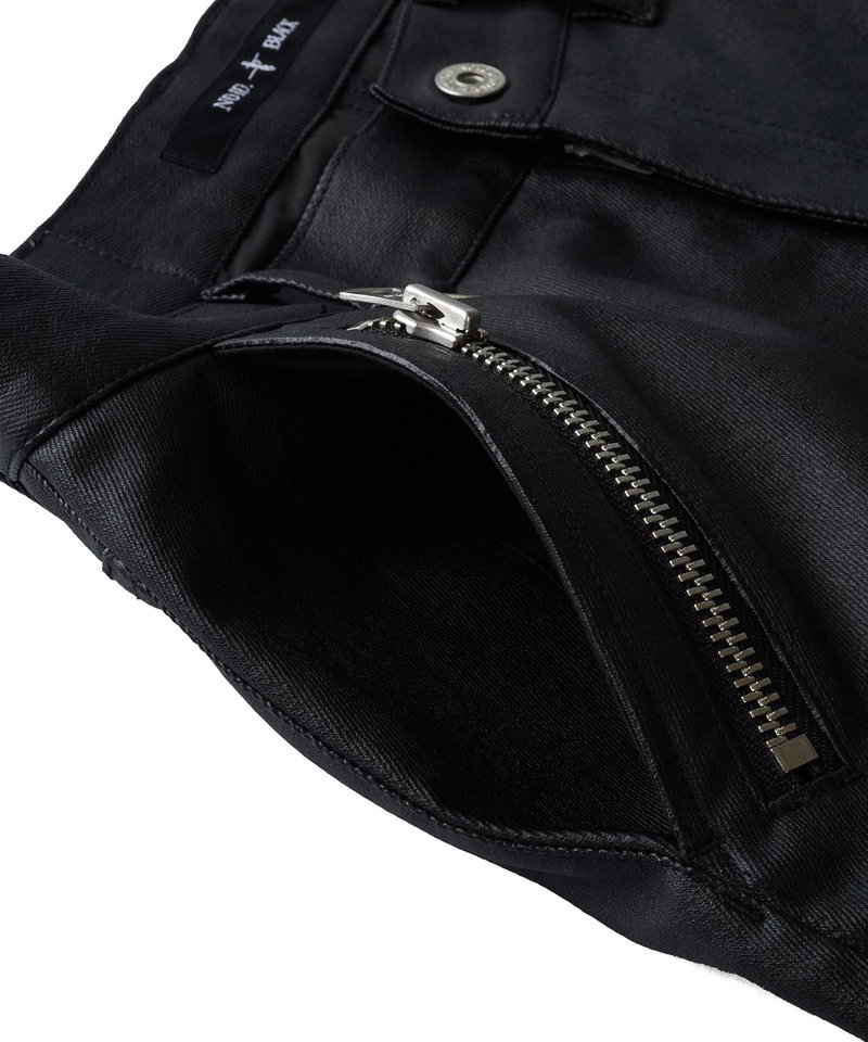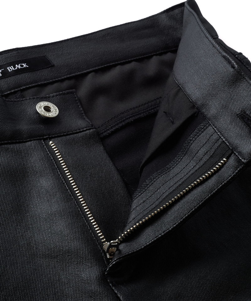 伸縮性のあるツイルストレッチ生地をベースにウレタンコーティングを施しレザーパンツの様な風合いを持たせたスキニーパンツ。