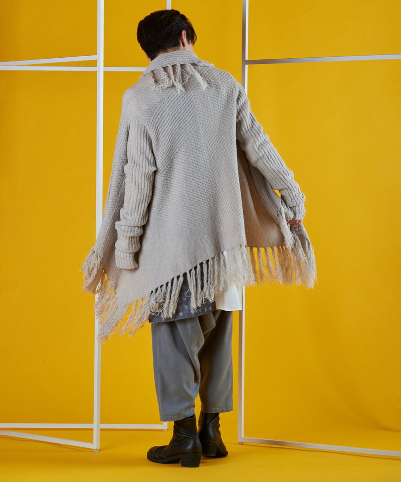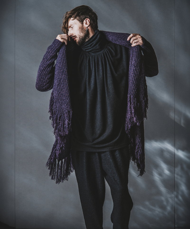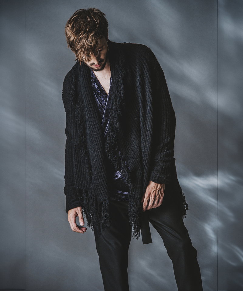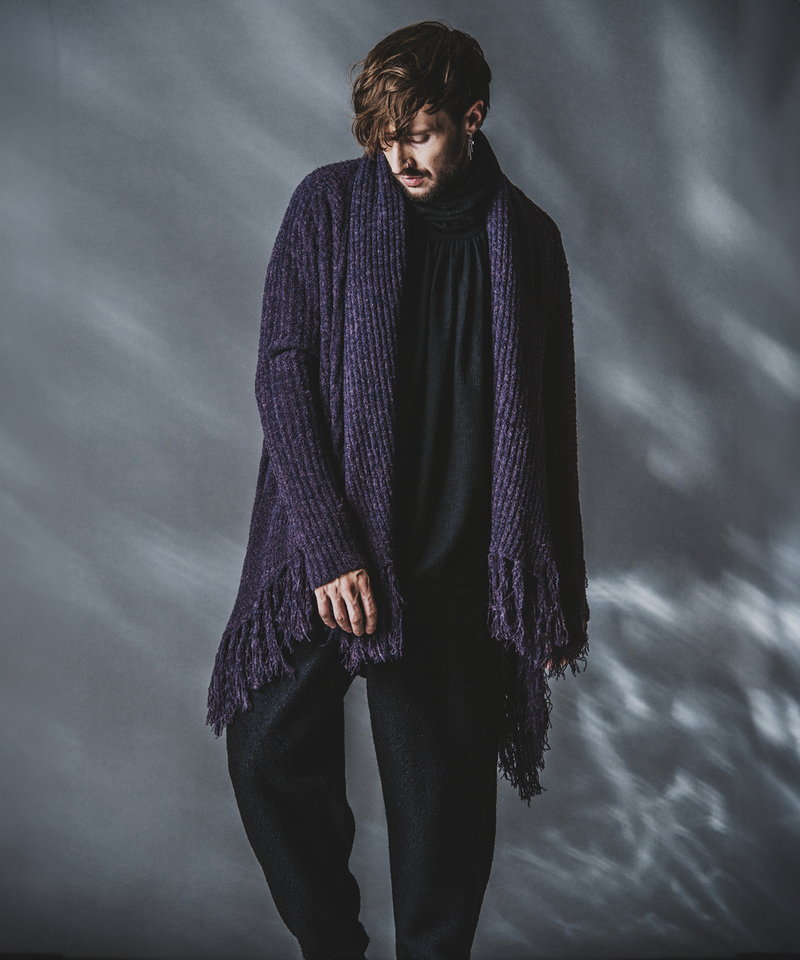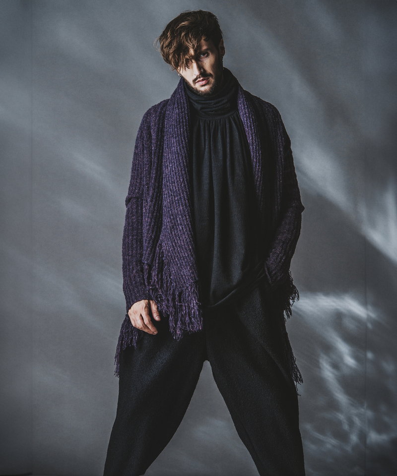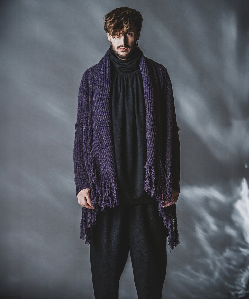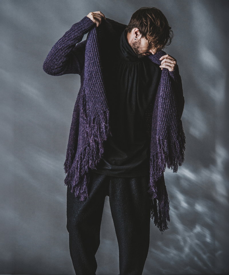 マフラーに多く見られるフリンジをガウンに落とし込み動きのあるデザインニットに仕上げた本作。ニットの伸縮性を活かした細身のシルエットはコートの中に着ても着膨れせずレイヤードスタイルを堪能でき生地のドレープ感が独創的なスタイルを演出してくれる。逆さまにして袖を通す事でドレープの雰囲気や着丈が変化して異なる表情に。またはストールとして使ってネックラインにボリュームを持たせたりとマルチな着こなしを楽しめるアイテム。
