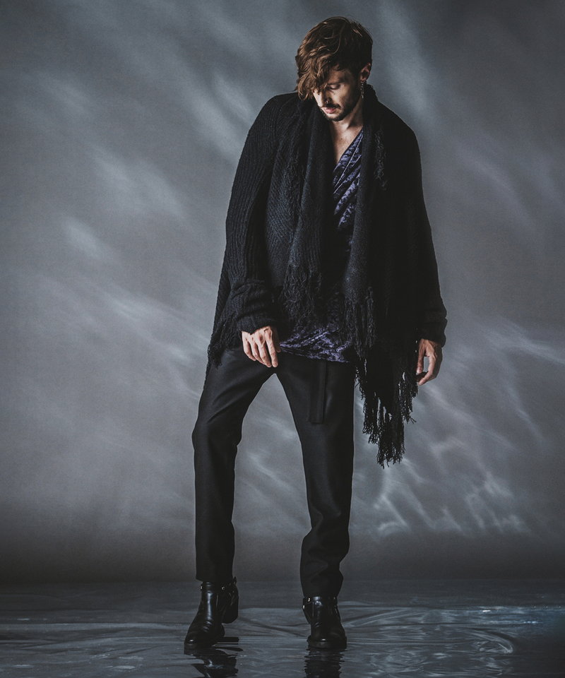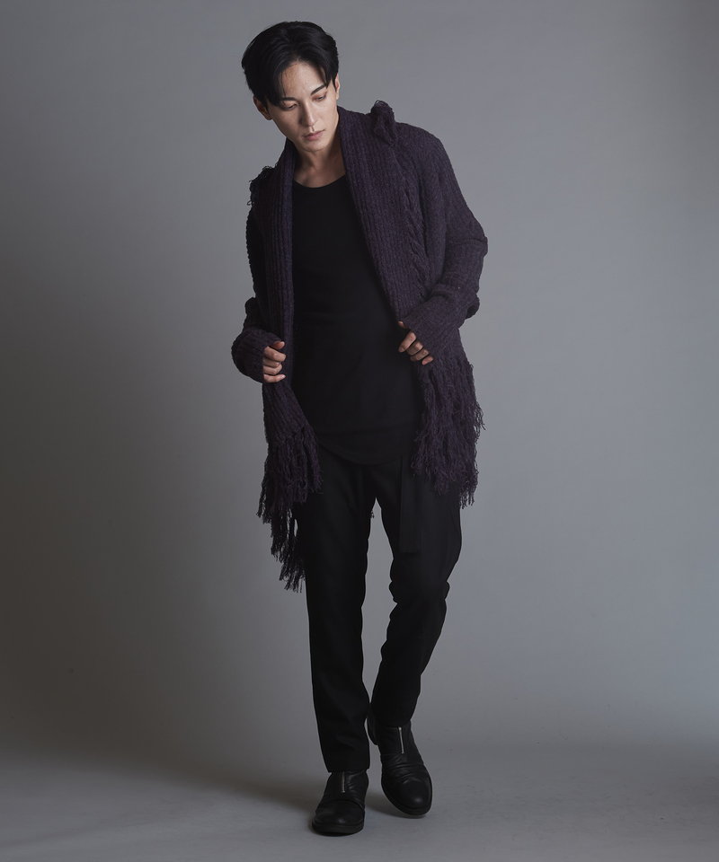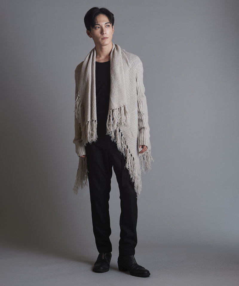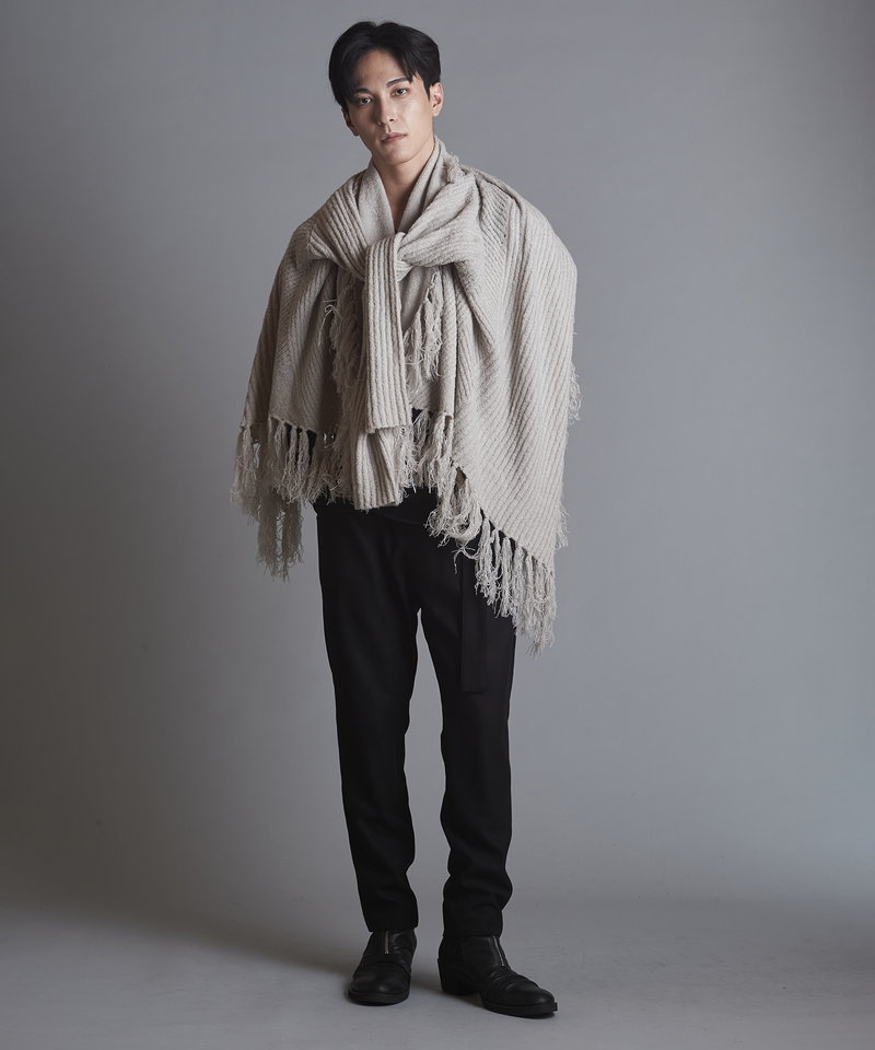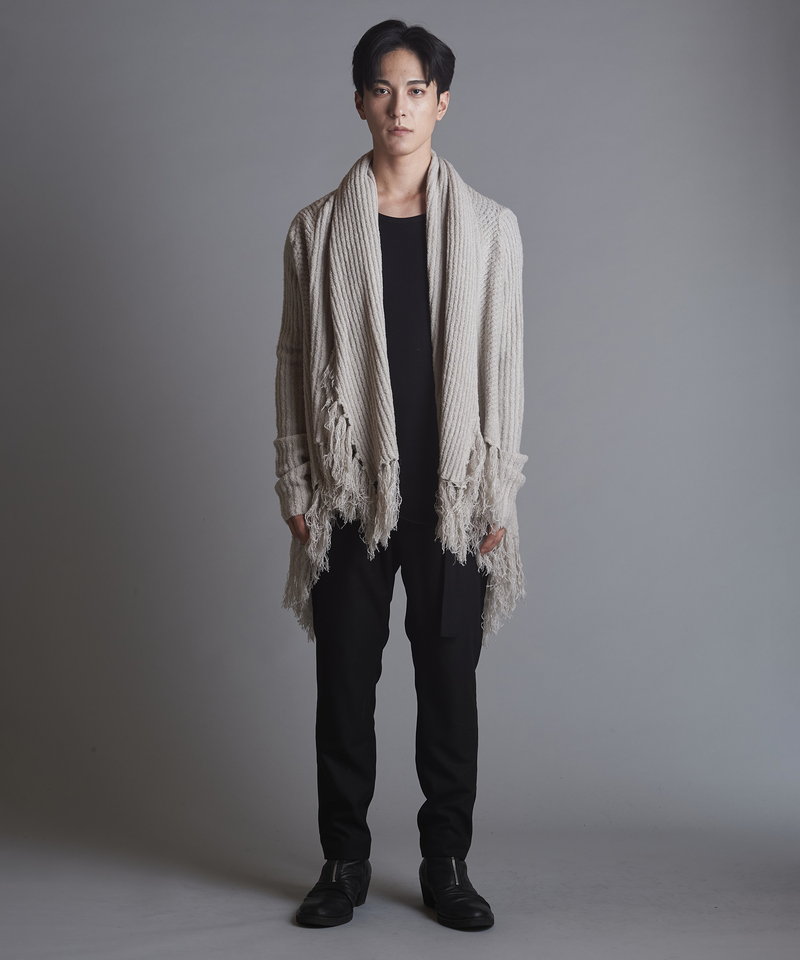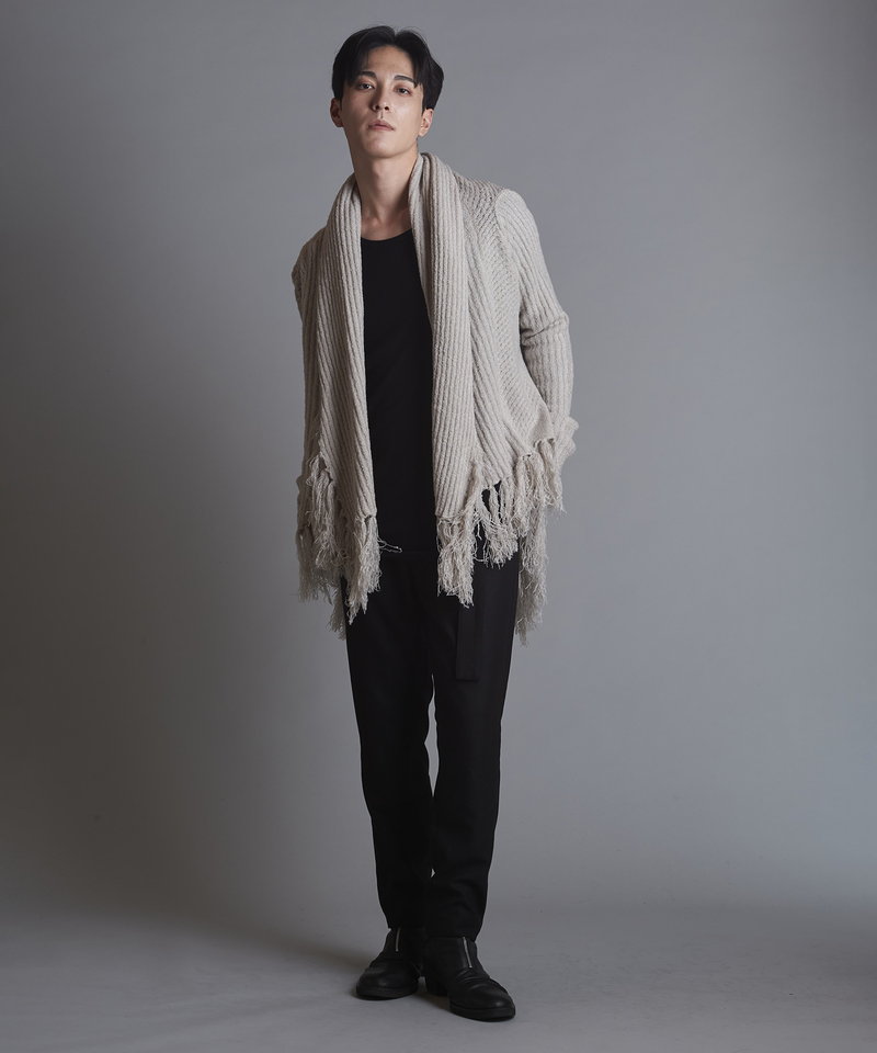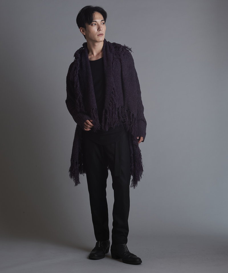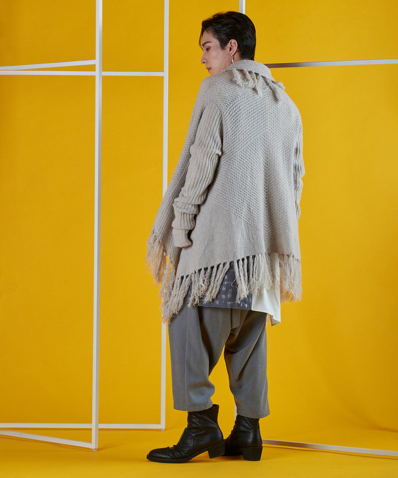 マフラーに多く見られるフリンジをガウンに落とし込み動きのあるデザインニットに仕上げた本作。ニットの伸縮性を活かした細身のシルエットはコートの中に着ても着膨れせずレイヤードスタイルを堪能でき生地のドレープ感が独創的なスタイルを演出してくれる。逆さまにして袖を通す事でドレープの雰囲気や着丈が変化して異なる表情に。またはストールとして使ってネックラインにボリュームを持たせたりとマルチな着こなしを楽しめるアイテム。