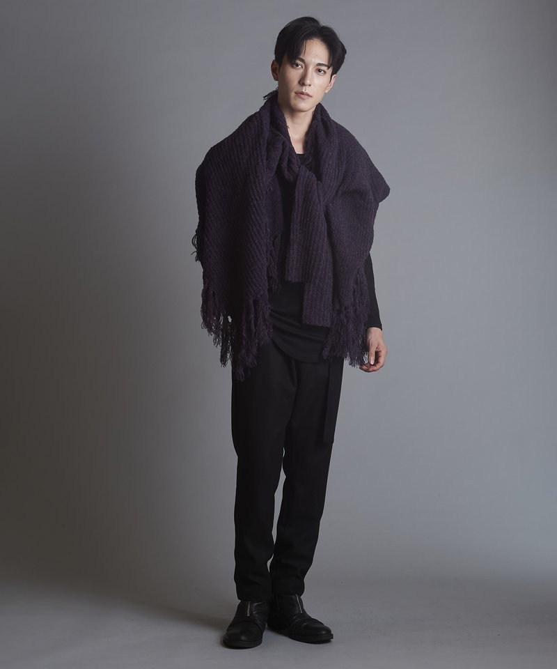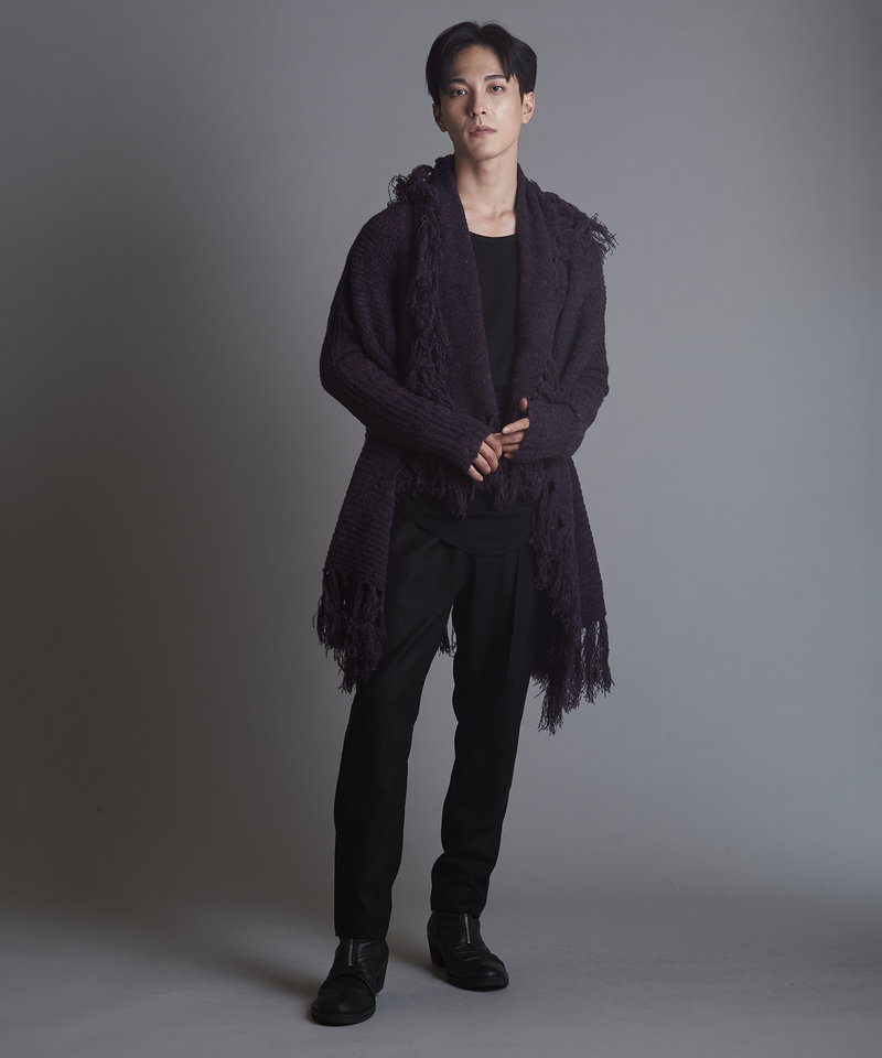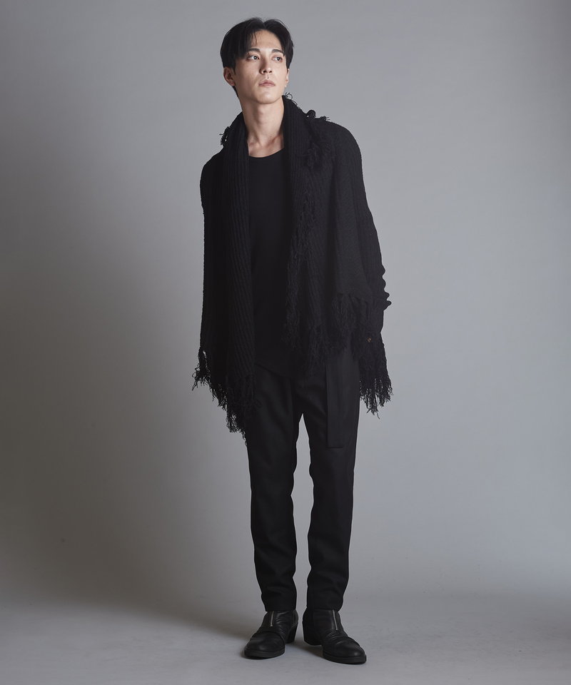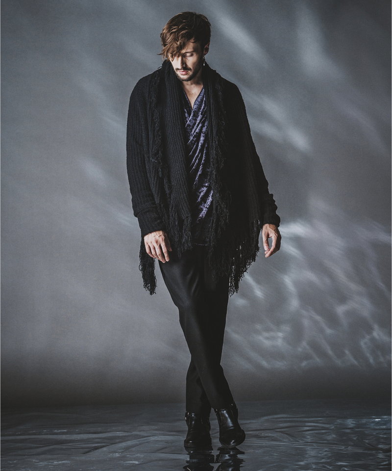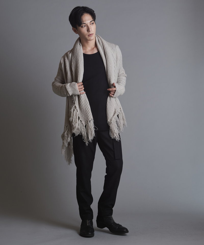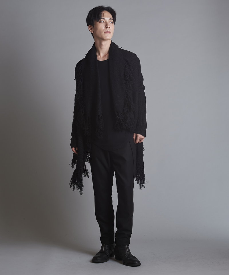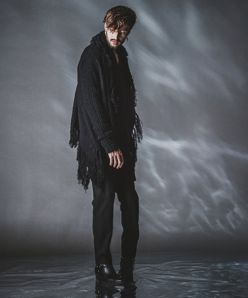 マフラーに多く見られるフリンジをガウンに落とし込み動きのあるデザインニットに仕上げた本作。ニットの伸縮性を活かした細身のシルエットはコートの中に着ても着膨れせずレイヤードスタイルを堪能でき生地のドレープ感が独創的なスタイルを演出してくれる。逆さまにして袖を通す事でドレープの雰囲気や着丈が変化して異なる表情に。またはストールとして使ってネックラインにボリュームを持たせたりとマルチな着こなしを楽しめるアイテム。