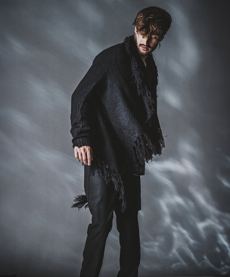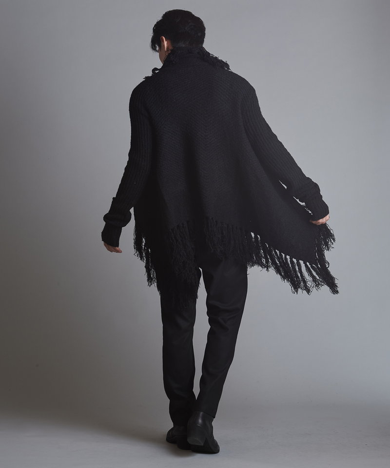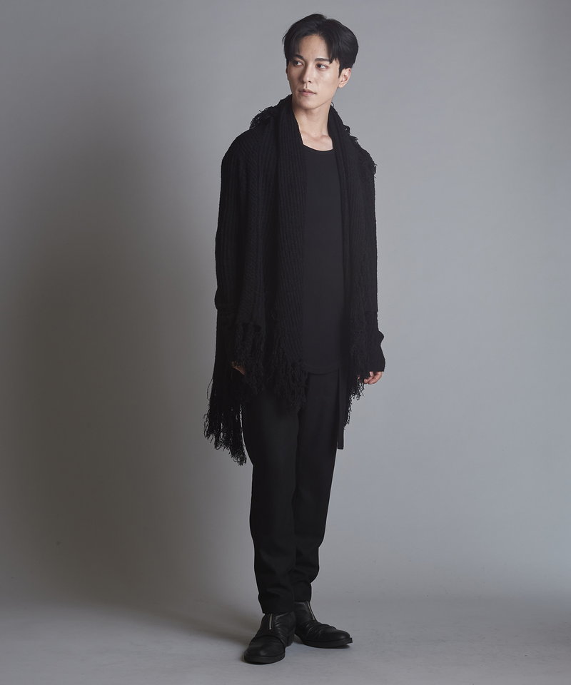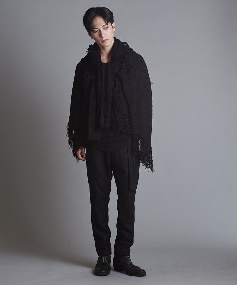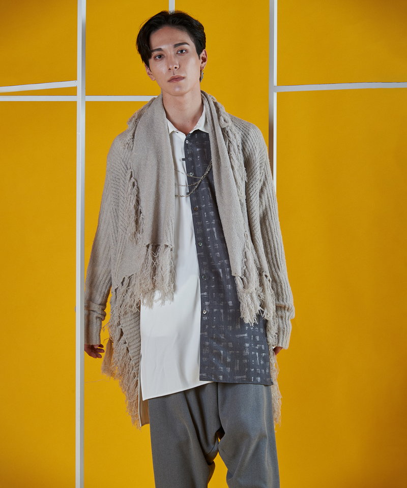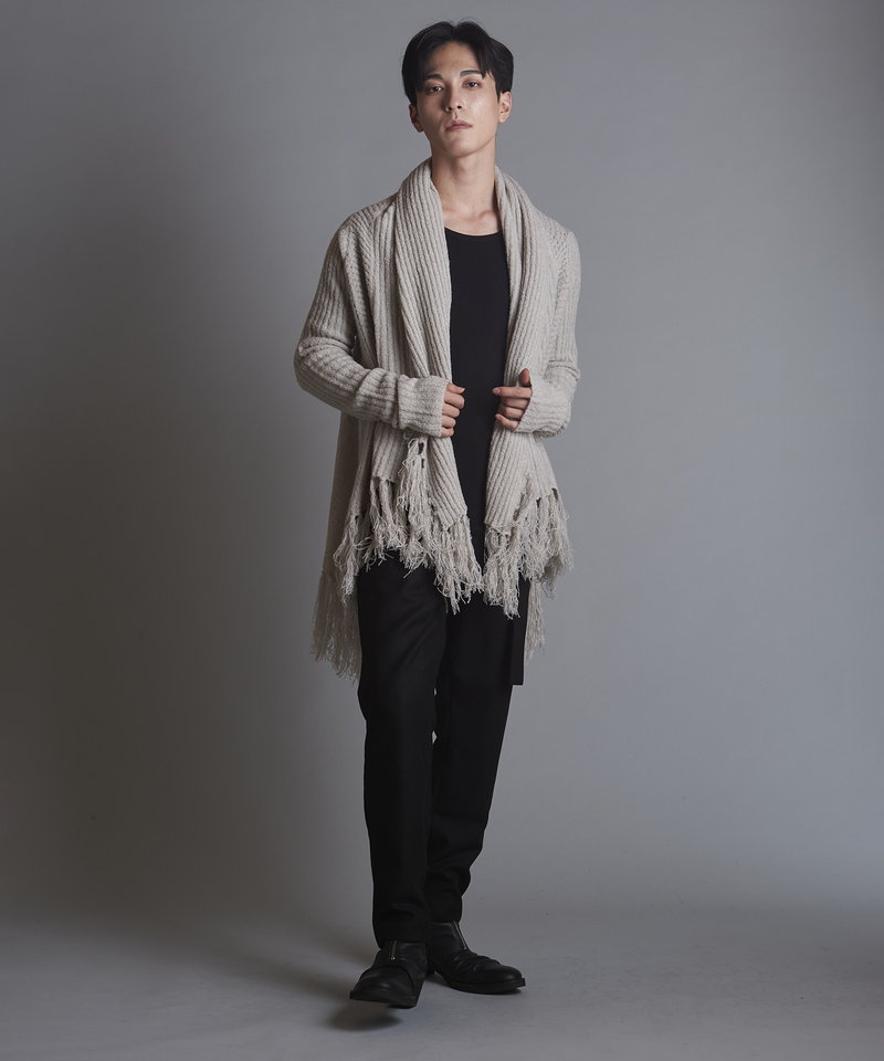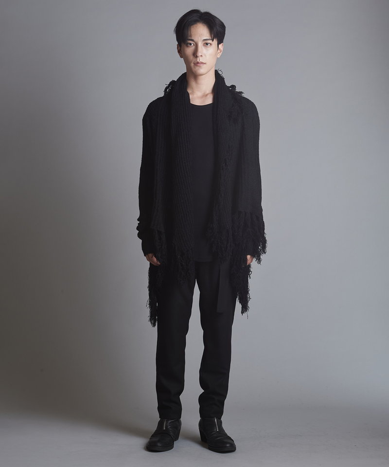 マフラーに多く見られるフリンジをガウンに落とし込み動きのあるデザインニットに仕上げた本作。ニットの伸縮性を活かした細身のシルエットはコートの中に着ても着膨れせずレイヤードスタイルを堪能でき生地のドレープ感が独創的なスタイルを演出してくれる。逆さまにして袖を通す事でドレープの雰囲気や着丈が変化して異なる表情に。またはストールとして使ってネックラインにボリュームを持たせたりとマルチな着こなしを楽しめるアイテム。