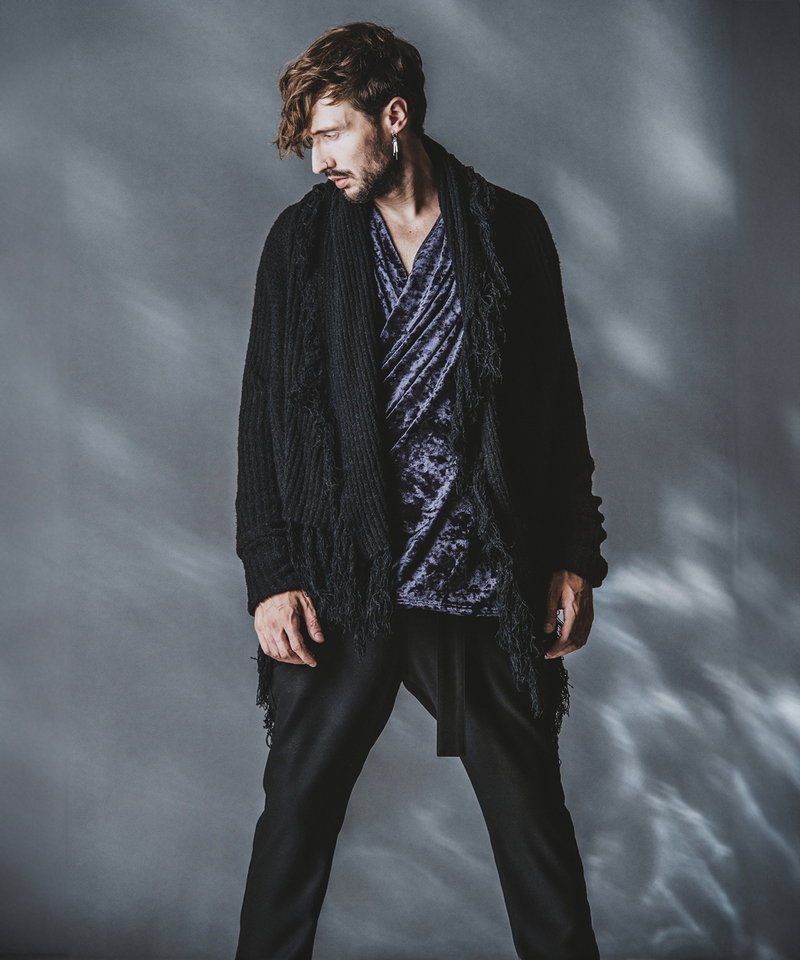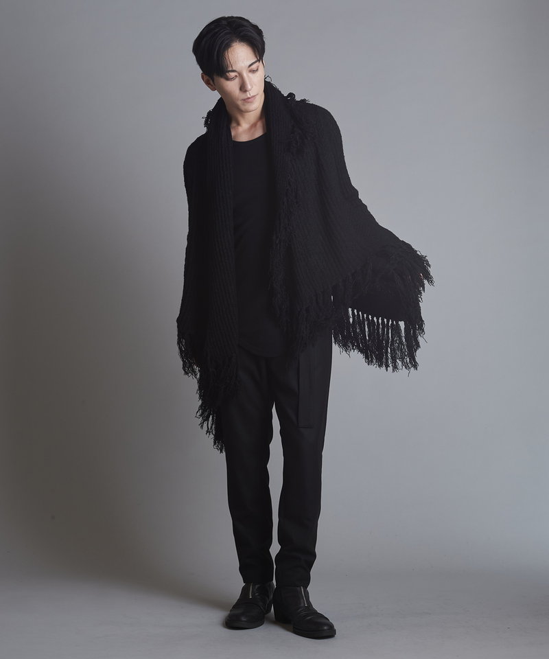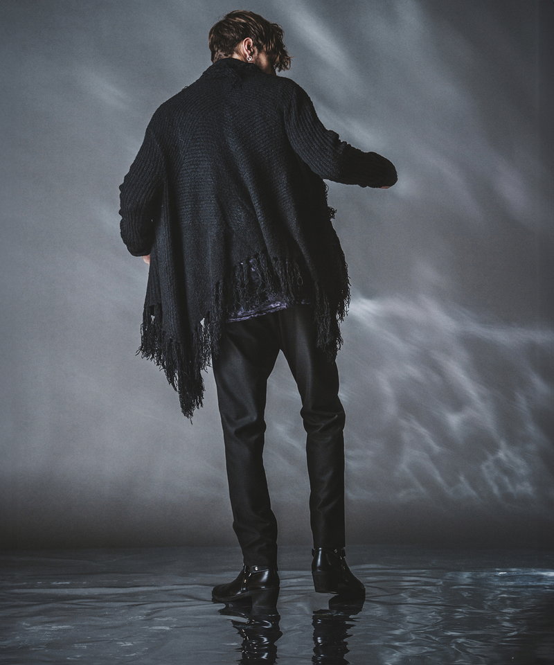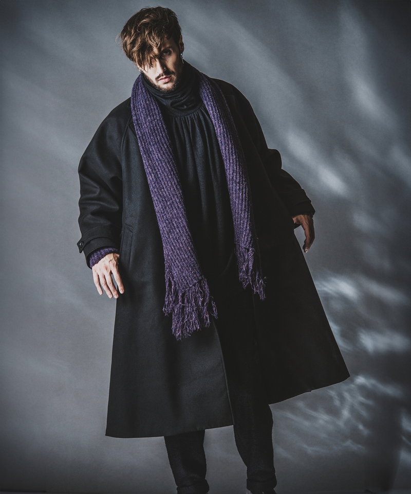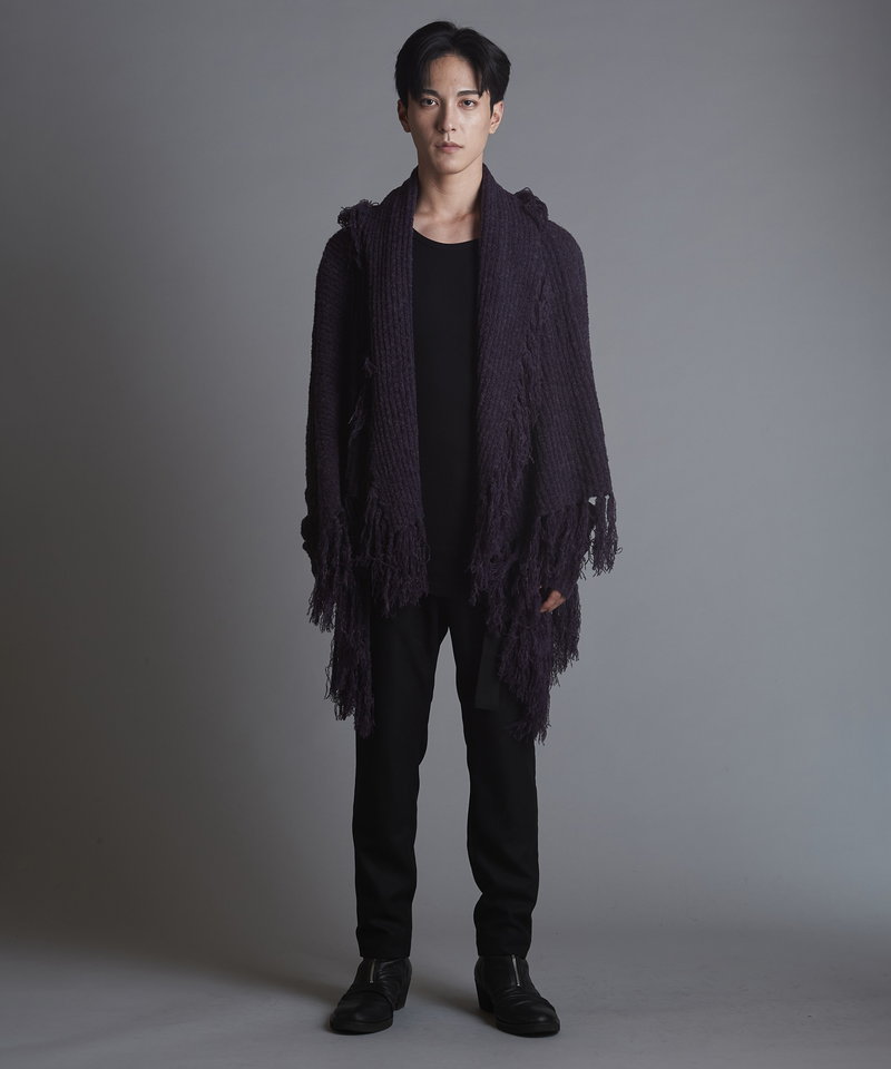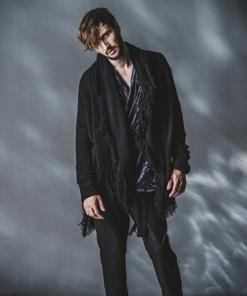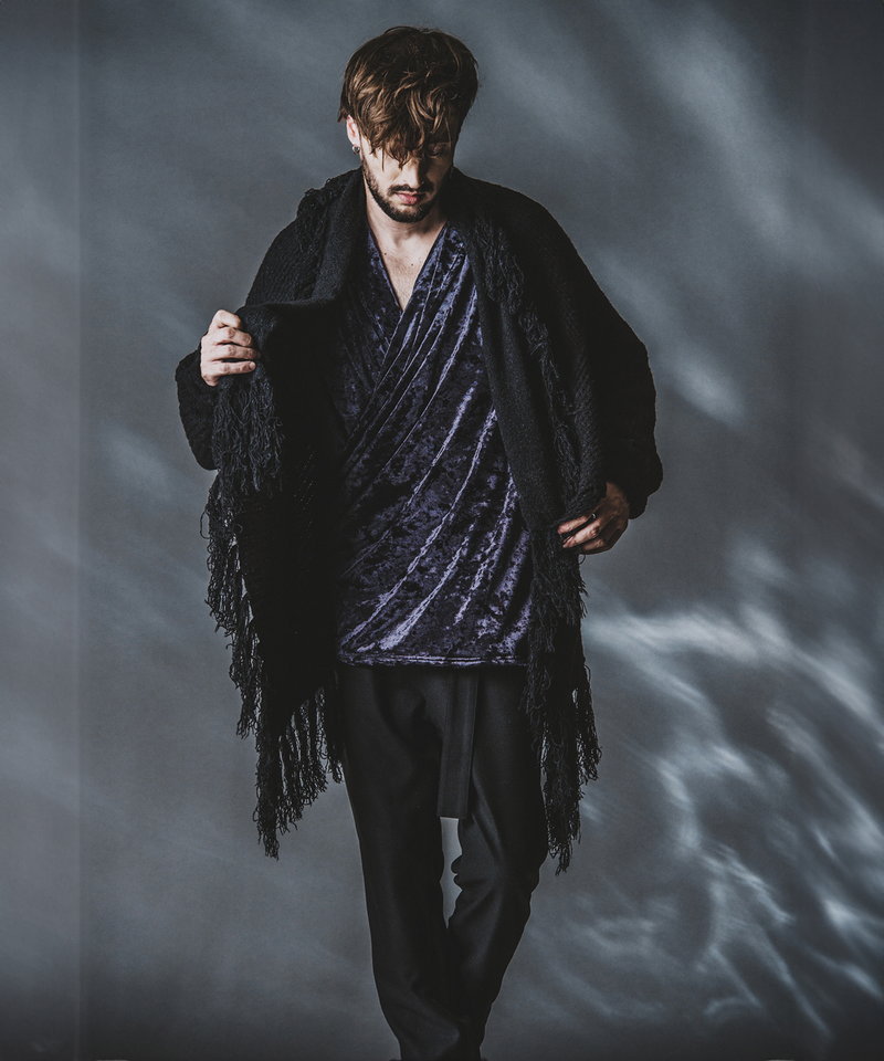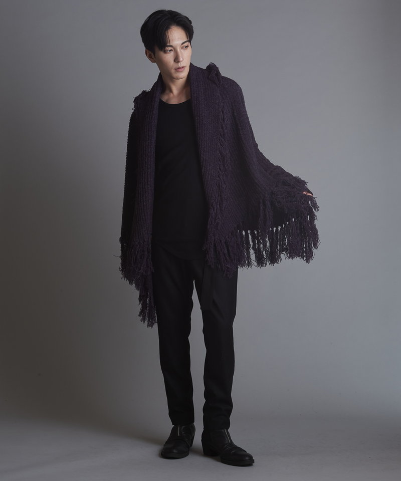 マフラーに多く見られるフリンジをガウンに落とし込み動きのあるデザインニットに仕上げた本作。ニットの伸縮性を活かした細身のシルエットはコートの中に着ても着膨れせずレイヤードスタイルを堪能でき生地のドレープ感が独創的なスタイルを演出してくれる。逆さまにして袖を通す事でドレープの雰囲気や着丈が変化して異なる表情に。またはストールとして使ってネックラインにボリュームを持たせたりとマルチな着こなしを楽しめるアイテム。