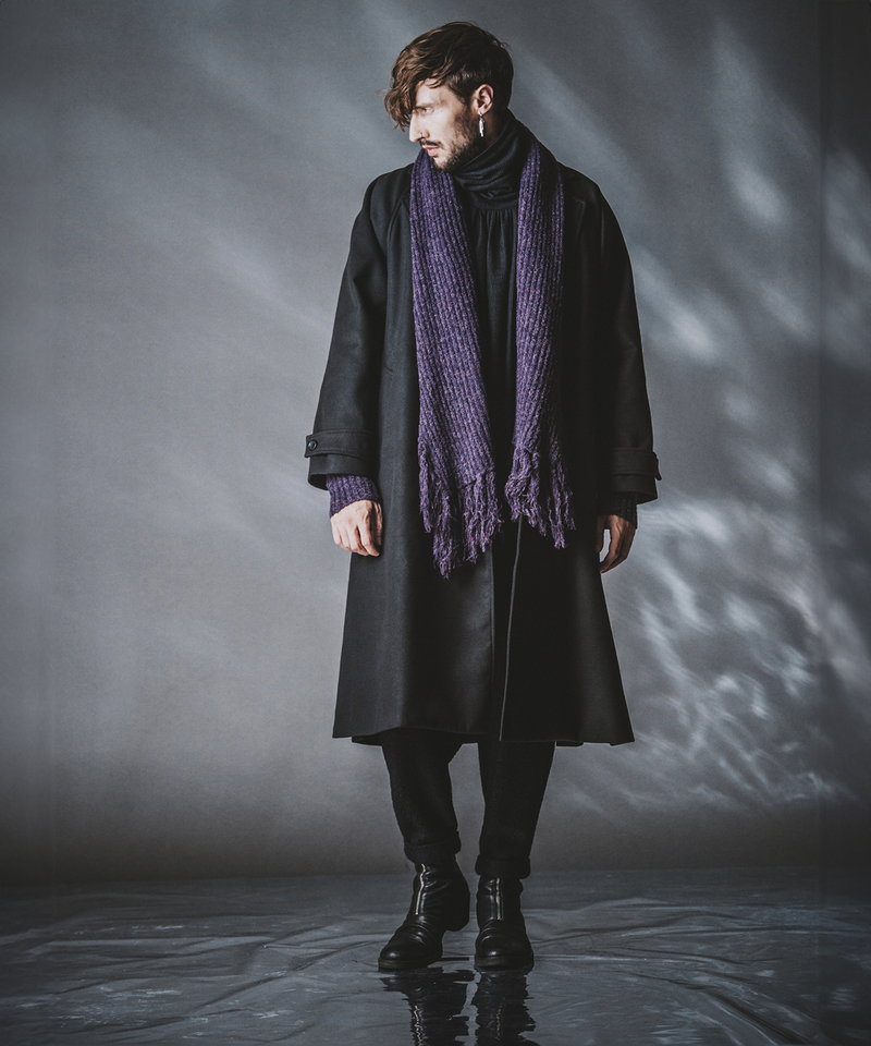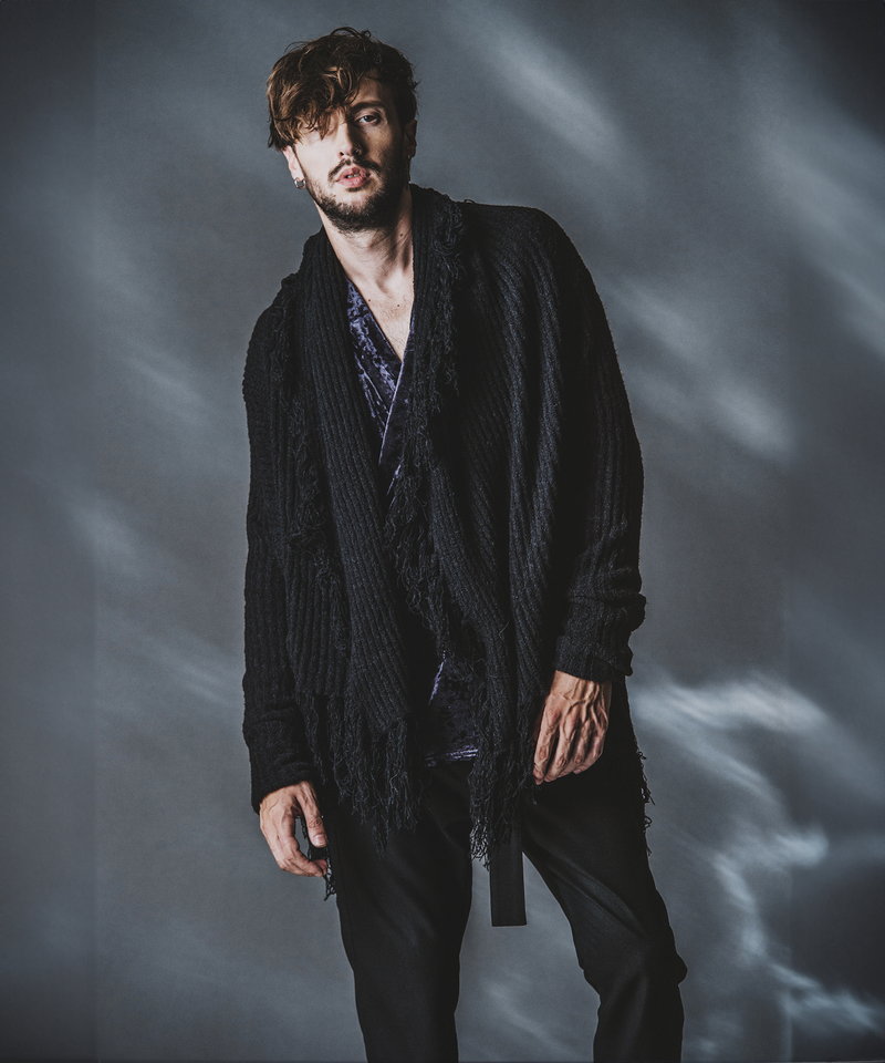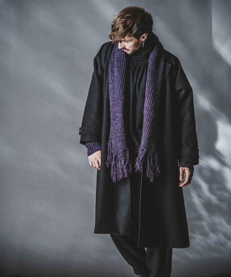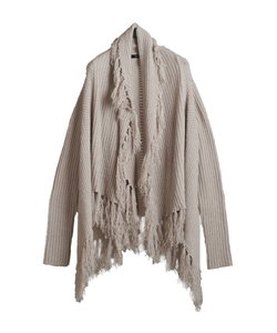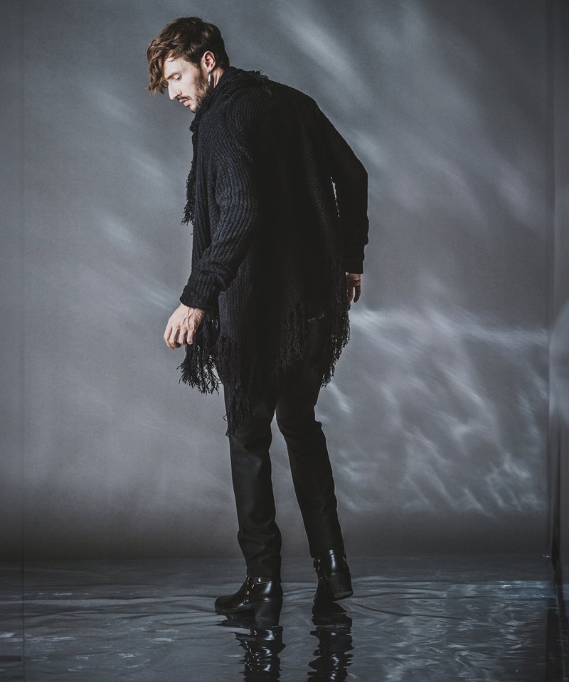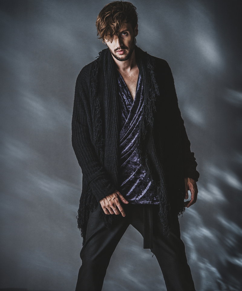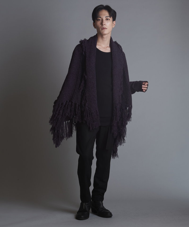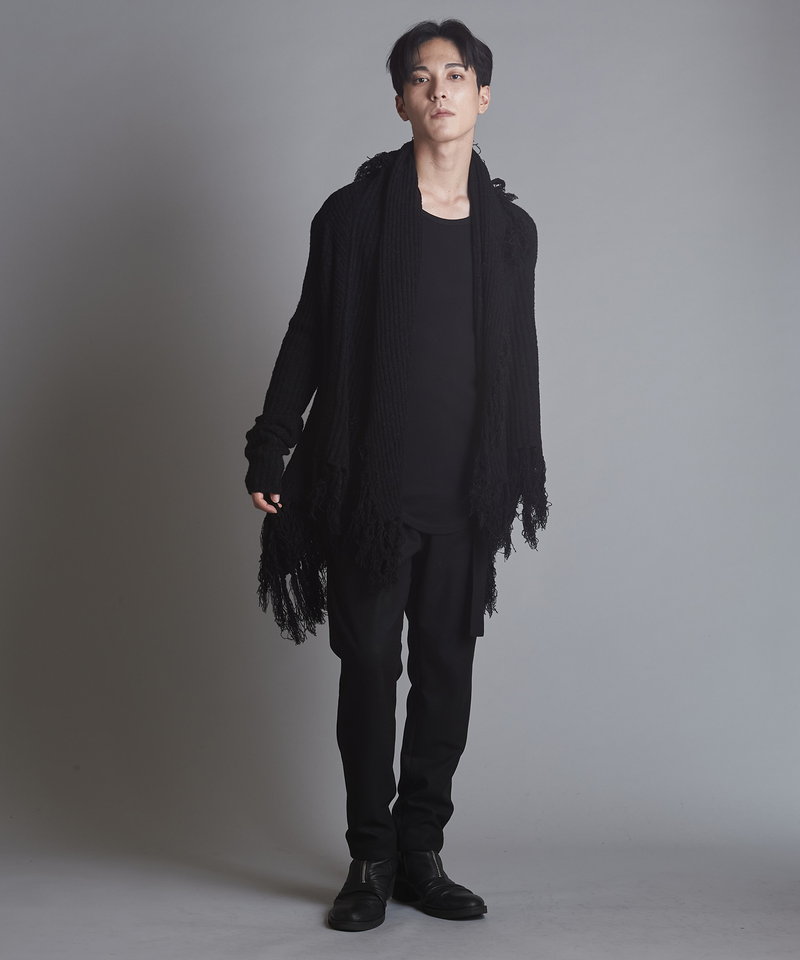 マフラーに多く見られるフリンジをガウンに落とし込み動きのあるデザインニットに仕上げた本作。ニットの伸縮性を活かした細身のシルエットはコートの中に着ても着膨れせずレイヤードスタイルを堪能でき生地のドレープ感が独創的なスタイルを演出してくれる。逆さまにして袖を通す事でドレープの雰囲気や着丈が変化して異なる表情に。またはストールとして使ってネックラインにボリュームを持たせたりとマルチな着こなしを楽しめるアイテム。