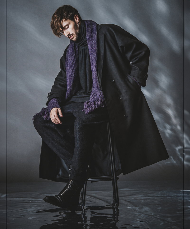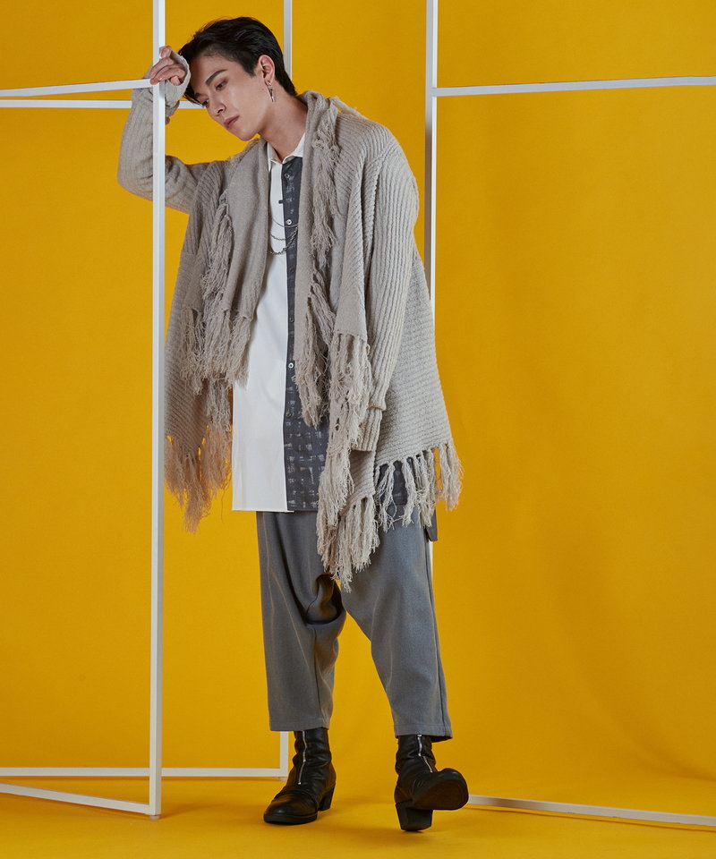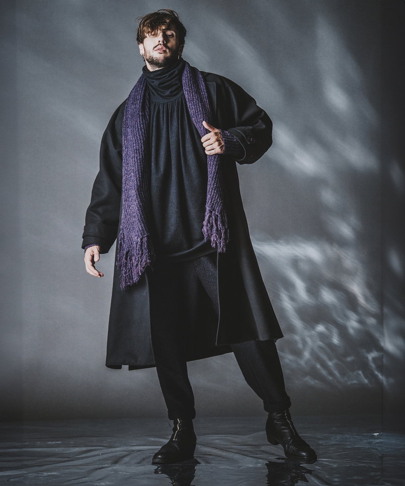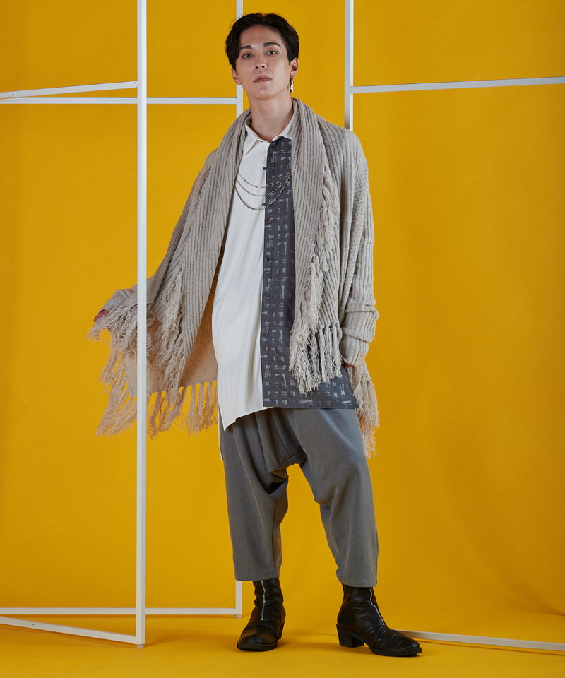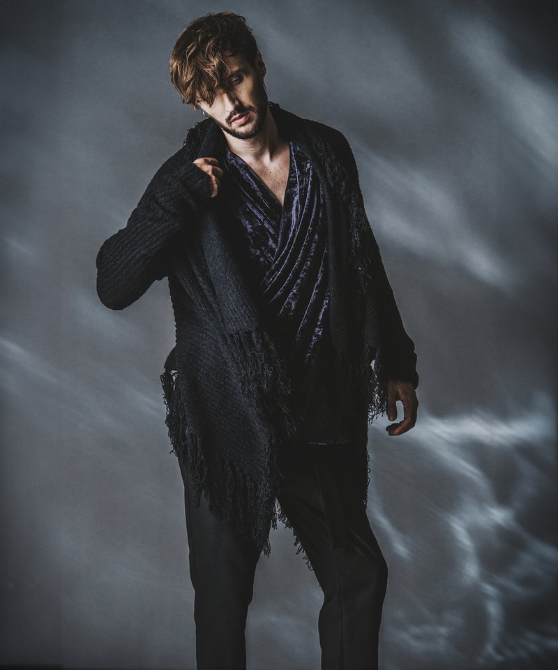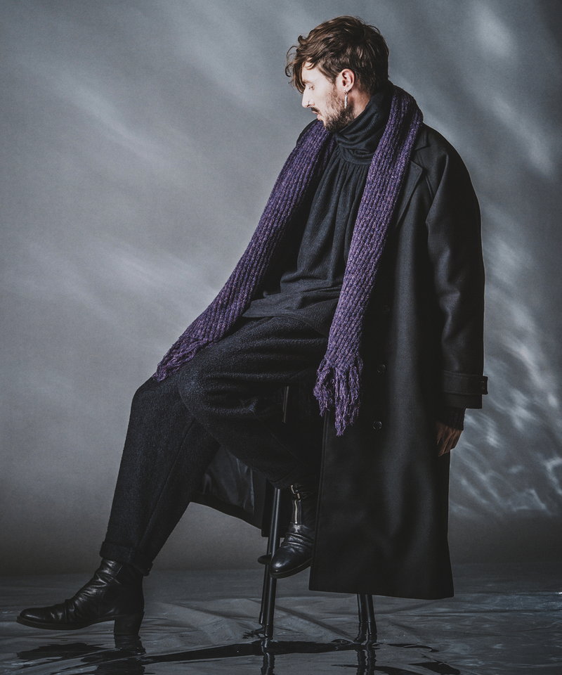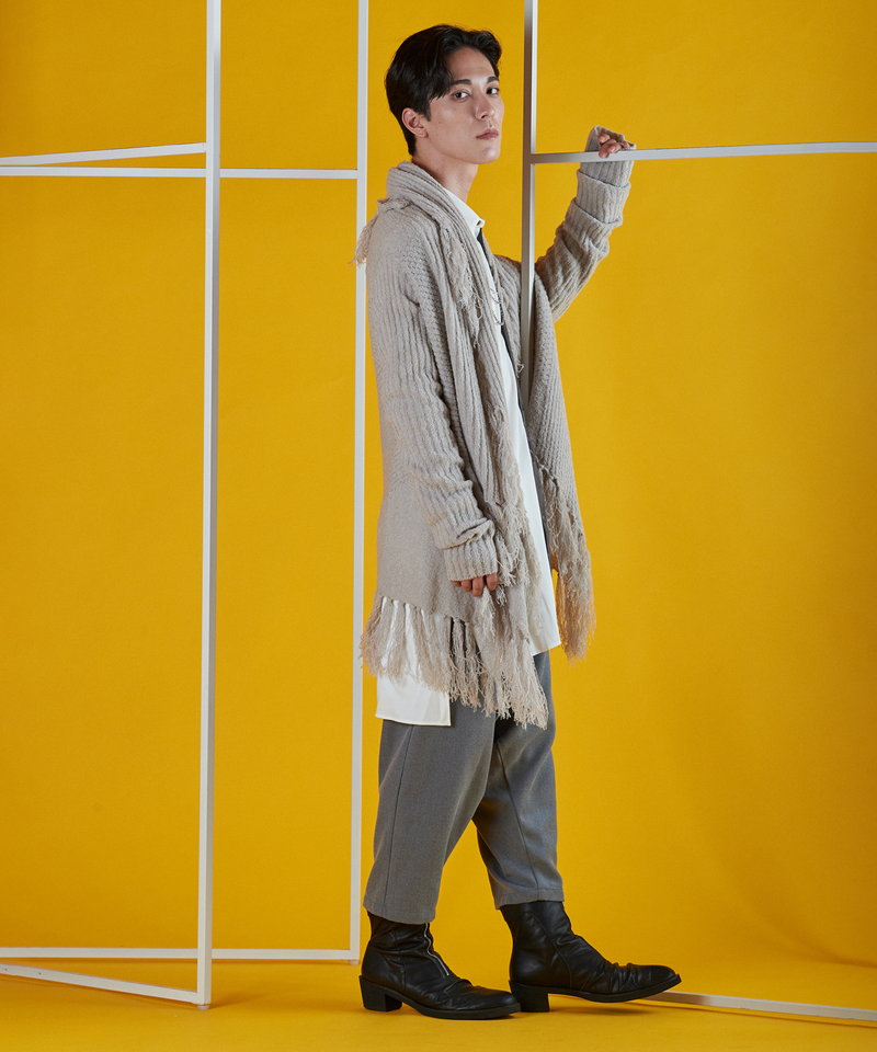 マフラーに多く見られるフリンジをガウンに落とし込み動きのあるデザインニットに仕上げた本作。ニットの伸縮性を活かした細身のシルエットはコートの中に着ても着膨れせずレイヤードスタイルを堪能でき生地のドレープ感が独創的なスタイルを演出してくれる。逆さまにして袖を通す事でドレープの雰囲気や着丈が変化して異なる表情に。またはストールとして使ってネックラインにボリュームを持たせたりとマルチな着こなしを楽しめるアイテム。